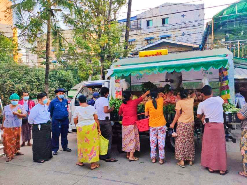 ကိုဗစ်-၁၉ ရောဂါ ကာကွယ်ထိန်းချုပ် ရေးအတွက်ပြည်သူများမိမိတို့နေအိမ်မှ ကွာဝေးသော စျေးများသို့ သွားရောက်ဝယ်ယူစရာ မလိုဘဲ စျေးနှုန်းသက်သာစွာဖြင့် သန့်ရှင်းလတ်ဆတ်ပြီး ဝယ်ယူ စားသုံးနိုင်စေရန်အတွက် ရန်ကုန်မြို့တော် စည်ပင်သာယာရေး ကော်မတီ၊ မြန်မာနိုင်ငံ ကုန်သည်များနှင့် စက်မှု၊လက်မှုလုပ်ငန်းရှင်များအသင်းချုပ်နှင့် ညီနောင်လုပ်ငန်းရှင် အသင်း များမှ ပူးပေါင်း၍သန့်ရှင်းလတ်ဆတ်သော သား/ငါး ၊ဟင်းသီးဟင်းရွက်များနှင့် စားသောက်ကုန် ပစ္စည်းများအား ဈေးနှုန်းသက်သာစွာ ရောင်းချပေး ခြင်းကို ယမန်နေ့ နံနက်(၇) နာရီမှ (၁၀)နာရီ ထိ ရန်ကုန်တိုင်းဒေသကြီး၊ အရှေ့ပိုင်းခရိုင်၊ ဒေါပုံမြို့နယ်၊ ဗမာအေး ရပ်ကွက် ရွှေဖူးမျှော်လမ်းနှင့် ဗိုလ်ချုပ်လမ်းထောင့်တွင် ကိုဗစ်-၁၉ရောဂါ ကြိုတင် ကာကွယ် ရေး စည်းကမ်းချက်များနှင့်အညီ စျေးကား များဖြင့် လာရောက်ရောင်းချ ပေးခဲ့ကြောင်းသိရသည်။