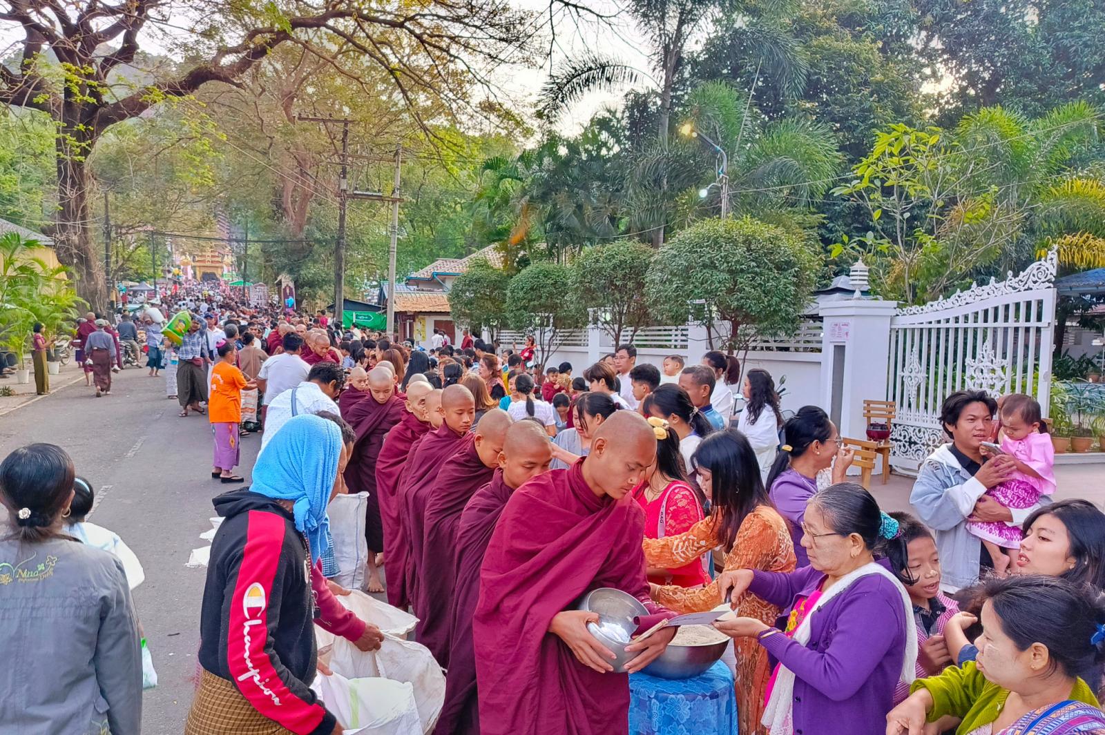 နံနက် အရုဏ်တက်ချိန်တွင် သထုံမြို့နယ်အတွင်းရှိ ကျောင်းတိုက်အသီးသီးတို့မှ ကြွရောက်တော်မူလာကြသည့် သံဃာတော်နှင့် သီလရှင်များအား စေတီတော်ဘဏ္ဍာတော်ထိန်း ဂေါပကအဖွဲ့၏ စီမံမှုဖြင့် အလှူရှင်အဖွဲ့အသီးသီးတို့မှ ဆွမ်းဆက်ကပ်ကြသည်။