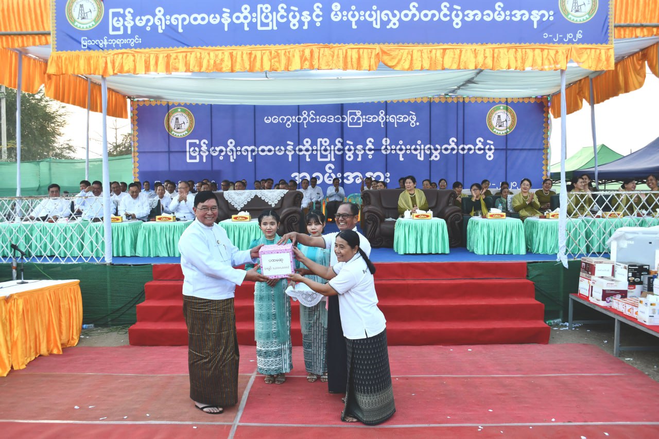 ယင်းနောက်ထမနဲထိုးပြိုင်ပွဲတွင် ပထမဆု၊ ဒုတိယဆု၊ တတိယဆု၊ စတုတ္တဆု၊ နှစ်သိမ့်ဆုရရှိသော ပြိုင်ပွဲဝင်အသင်းများအား ဆုကြေးငွေများနှင့် ဟန်းဆက်၊ လျှပ်စစ်မီးပူ၊ ပန်ကာ၊ မီးအိမ်၊ ထမင်းပေါင်းအိုးများအပြင် ဗလာမပါကံစမ်းမဲကံထူးရှင်များအား မကွေးတိုင်းဒေသကြီးဝန်ကြီးချုပ်နှင့် တာဝန်ရှိသူများက ဆုများအသီးသီးပေးအပ်ချီးမြှင့်ကြသည်။