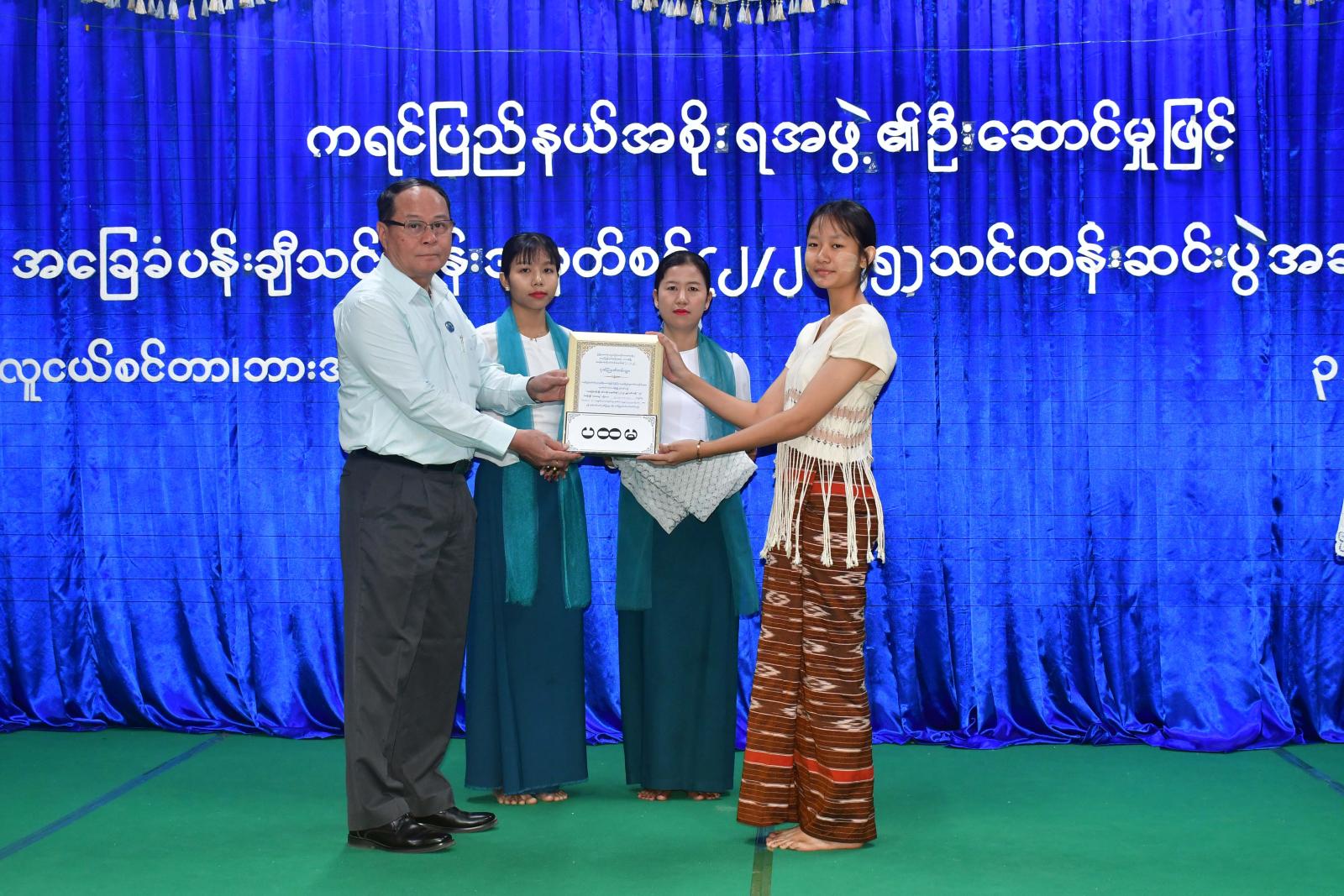 ဦးစွာ ပြည်နယ်ဝန်ကြီးချုပ်ဦးစောမြင့်ဦးက လူငယ်များသည်နောင်တစ်ချိန်တွင် နိုင်ငံ့တာဝန်များကို ပခုံးပြောင်း တာဝန်ထမ်းဆောင်ကြမည့်သူများဖြစ်ရာ လူငယ်များကိုပြုစုပျိုးထောင်ပေးခြင်းသည် အနာဂတ်နိုင်ငံတော်ကိုဖန်တီးပုံဖော်နေခြင်းဖြစ်ကြောင်း၊ သင်တန်းဆင်း သင်တန်းသား၊ သင်တန်းသူများအနေဖြင့် မိမိတို့၏ဖန်တီးနိုင်စွမ်းကိုယုံကြည်ပြီး ပန်းချီအနုပညာမှတစ်ဆင့် မိမိဘဝကိုတိုးတက်စေမည့်ပညာရပ်များကို ဆက်လက်ဆည်းပူးလေ့လာရင်း ကရင်ပြည်နယ်နှင့်နိုင်ငံ့အကျိုးကို သယ်ပိုးဆောင်ရွက်နိုင်သည့် လူကောင်း၊လူတော်များဖြစ်အောင် ကြိုးစားကြစေလိုကြောင်း ပြောကြားသည်။
