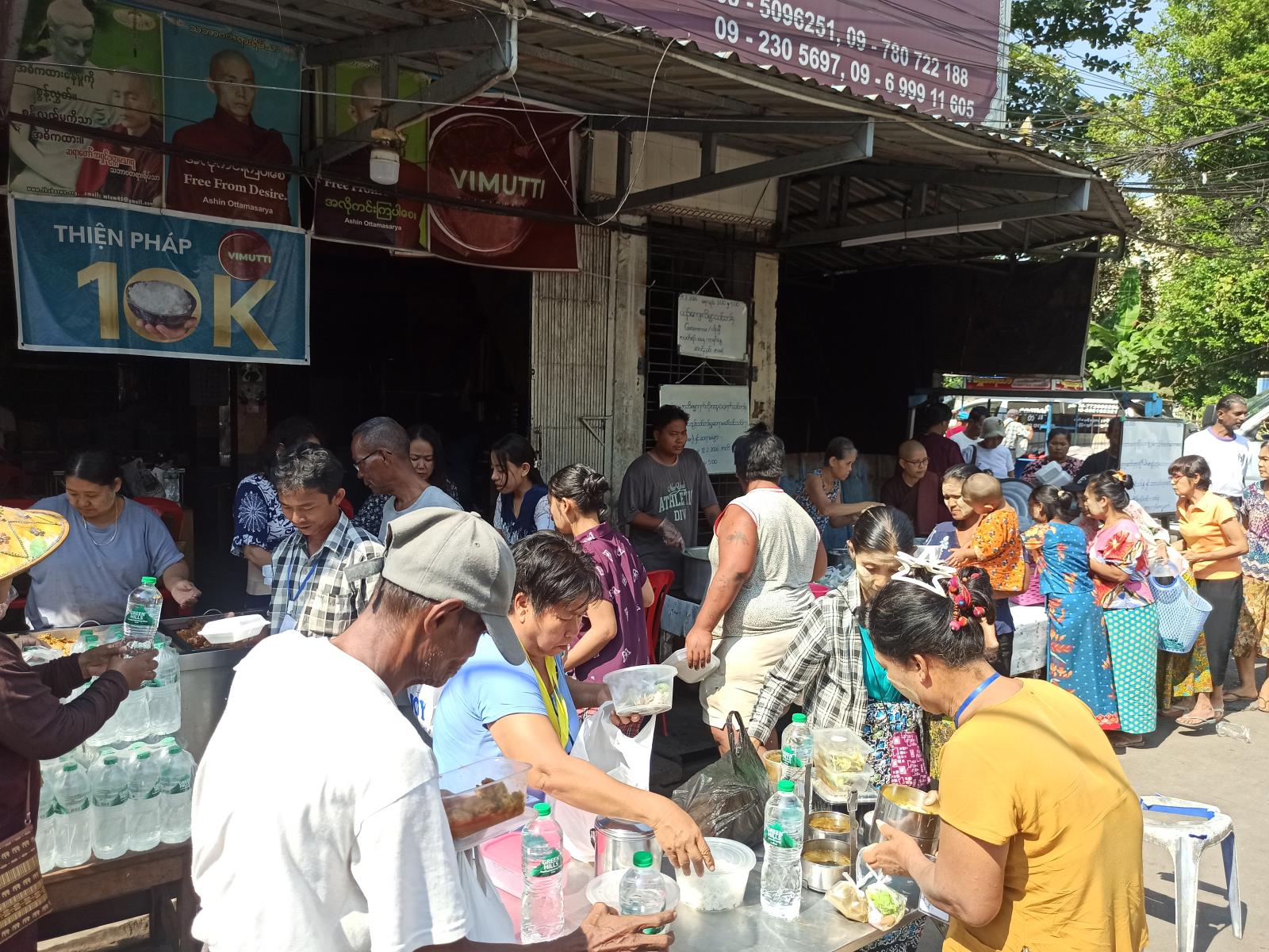 ဦးစွာ ဆရာလေးခယဝယဉာဏီက ဦးဆောင်ကာ ကုသိုလ်ယူမိဘပြည်သူများက လှူဒါန်းသည့် အလှူရှင်တို့အား မေတ္တာပို့ဆုတောင်းပေးကြပြီး သာဓု (၃) ကြိမ်ခေါ်ဆိုကာ အဟာရဒါကုသိုလ်ပြုပွဲစတင်ကျင်းပသည်။ အဆိုပါလှူဒါန်းပွဲသည် ဆေးရုံတက်ရောက်ကုသနေသူများ၊ အနှေးယာဥ်လုပ်သားများ၊ ရပ်ကွက်နေပြည်သူများအား တစ်နေ့တာ စားသောက်ရေးအဆင်ပြေစေရန် ရည်ရွယ်လှူဒါန်းရခြင်းဖြစ်ကြောင်း သိရသည်။ စားသောက်စရာများ လာရောက်ထုတ်ယူသူများကလည်း အလှည့်ကျတန်းစီ၍ စည်းကမ်းရှိစွာ လာရောက်ထုတ်ယူကြသည်။