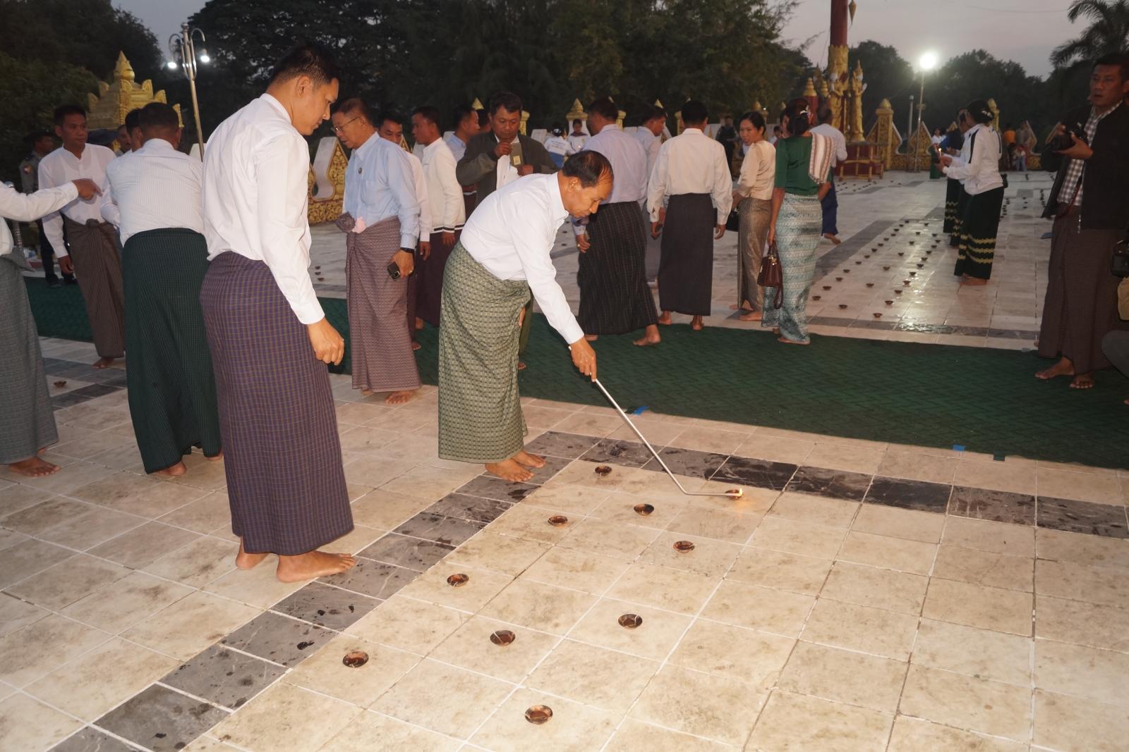 ဆက်လက်၍ ညပိုင်းတွင် တိုင်းဒေသကြီးဝန်ကြီးချုပ်နှင့် တာဝန်ရှိသူများသည် မဟာရွှေစည်ကြီးစေတီတော် ဝန်းအတွင်း၌ ဆီမီး ၉၀၀၀ ထွန်းညှိပူဇော်ပွဲသို့ တက်ရောက်ထွန်းညှိပူဇော်ပြီး ခရိုင်/ မြို့နယ်ပညာရေးဌာနက ဆရာ၊ ဆရာမများ ဆီးမီးထွန်းညှိပူဇော်နေမှုများကို လိုက်လံကြည့်ရှုအားပေးပြီး ရင်းရင်းနှီးနှီးနှုတ်ဆက်ခဲ့ကြောင်း သိရသည်။