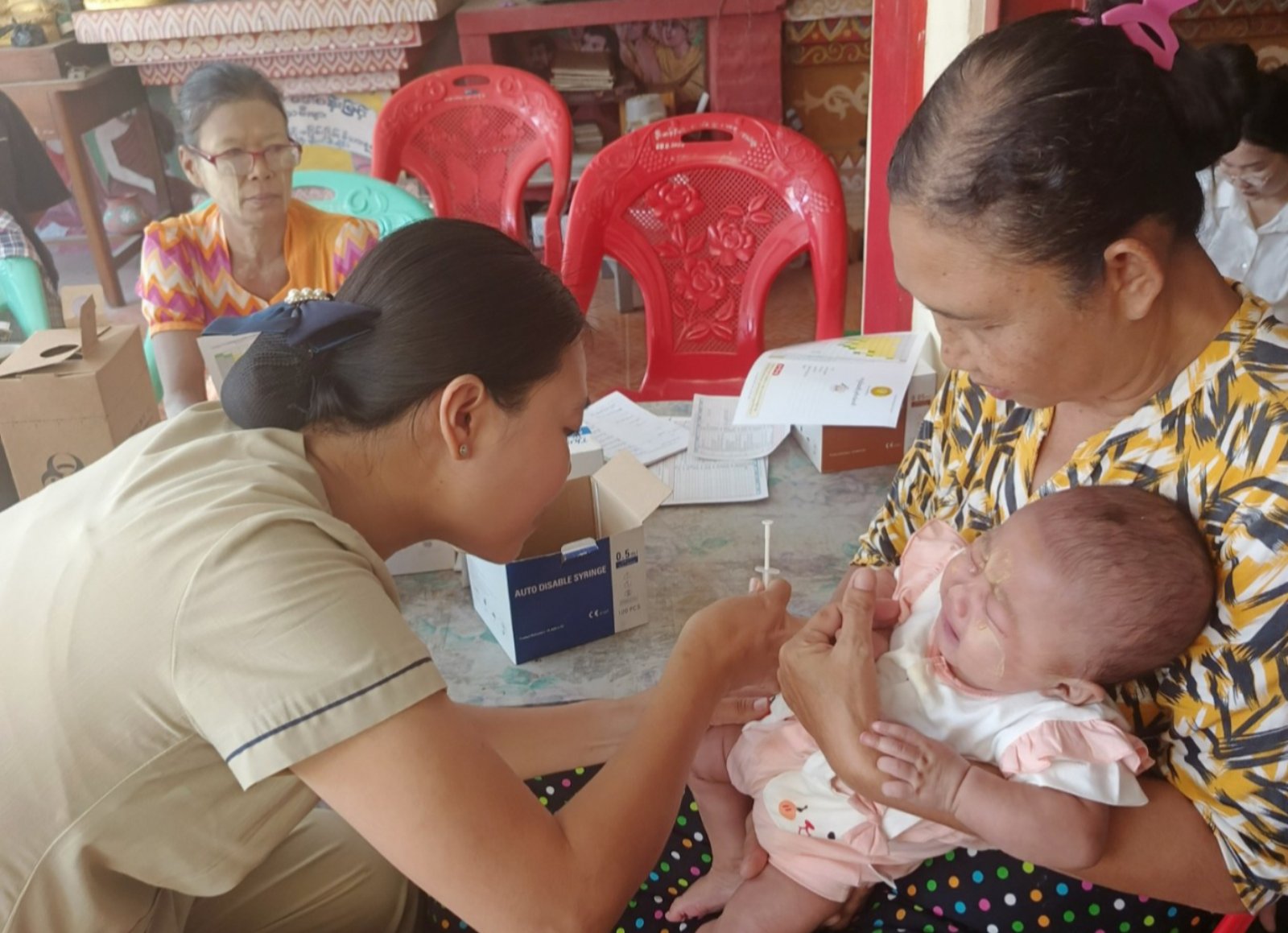 ထိုသို့ ကာကွယ်ဆေးထိုးနှံရာတွင် မြို့နယ်ပြည်သူ့ကျန်းမာရေးဦးစီးဌာနမှူး ဒေါက်တာစံလင်း၏လမ်းညွှန်မှုဖြင့် ကျန်းမာရေးဝန်ထမ်းများက အသက်(၂)နှစ်အောက်ကလေးငယ်များအား ဆေးထိုးစုရပ်များထားရှိကာ ပုံမှန်ကာကွယ်ဆေးများဖြစ်သော ဆုံဆို့၊ ကြက်ညှာ၊ မေးခိုင်၊ အသည်းရောင်အသားဝါ(ဘီ)ပိုး၊ ဦးနှောက်အမြှေးရောင် (၅)မျိုးစပ်ကာကွယ်ဆေး၊ ပိုလီယို၊ ဝက်သက်၊ ဂျိုက်သိုးရောဂါကာကွယ်ဆေးများ ထိုးနှံတိုက်ကျွေးပေးခြင်း၊ ပြင်းထန်ဝမ်းပျက်ဝမ်းလျှောဖြစ်စေတတ်သော (Rota) ကာကွယ်ဆေးတိုက်ကျွေးခြင်းနှင့် ကိုယ်ဝန်ဆောင်မိခင်များအား မေးခိုင်-ဆုံဆို့နာကာကွယ်ဆေးကို ထိုးနှံပေးခဲ့ကြသည်။