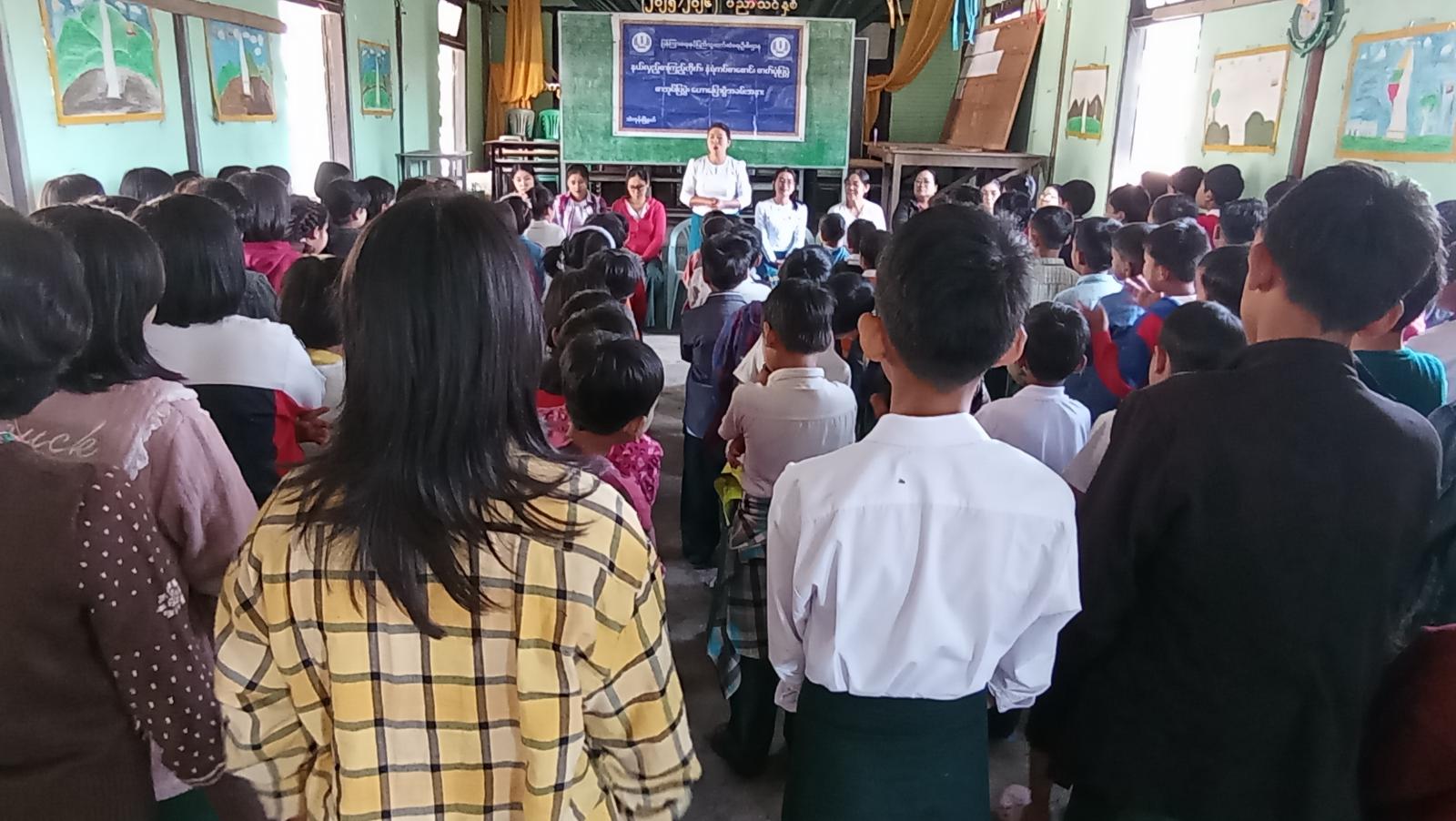 ထိုသို့ ကွင်းဆင်းဆောင်ရွက်ရာတွင် ပြန်ကြားရေးနှင့်ပြည်သူ့ဆက်ဆံရေးဦးစီးဌာနမှ ဒုတိယဦးစီးမှူး ဒေါ်ပြည့်ဖြိုးသူက ကျောင်းသား၊ကျောင်းသူများအနေဖြင့် ဗလငါးတန်နှင့် ပြည့်စုံကြွယ်ဝသော လူငယ်များဖြစ်စေရန်ကျောင်းစာအပြင် ပြင်ပစာအုပ်စာစောင်များကို ဗဟုသုတရရှိရေးအတွက် ဖတ်ရှုလေ့လာသော အလေ့အကျင့်ကောင်းများရှိစေရန်၊ ပြည်ထောင်စုနေ့ဖြစ်ပေါ်လာပုံ၊ ပြည်ထောင်စုစိတ်ဓာတ်၏ အရေးပါမှု၊ နိုင်ငံတော်နှင့် အမျိုး၊ ဘာသာ၊ သာသနာ၊ ယဉ်ကျေးမှုကို ထိန်းသိမ်းကာကွယ်စောင့်ရှောက်ကြရန်နှင့် လူငယ်များ သိသင့်သိထိုက်သည့် ဗဟုသုတ အကြောင်းအရာများကိုလည်းကောင်း၊ စာကြည့်တိုက်လက်ထောက်- ၃ ဒေါ်နော်ဌေးဌေးမြင့်က စာပေဖတ်ရှုခြင်းဖြင့် ရရှိနိုင်သော အသိပညာဗဟုသုတများ၊ စာအုပ်စာပေဖတ်ရှုရာတွင် လိုက်နာဆောင်ရွက်ရမည့်အချက်များ၊ ရည်မှန်းချက်/ ရည်ရွယ်ချက်ထားရှိရန်စသည့်အကြောင်းအရာများကို အကျယ်တဝင့်ဟောပြောခဲ့ပြီး ကျောင်းသား၊ ကျောင်းသူများ ဗဟုသုတရရှိစေရန် စာကြည့်တိုက်ဝန်ဆောင်မှုလုပ်ငန်းအဖြစ် ရှန်တီစေတနာ့ဝန်ထမ်းအဖွဲ့မှလှူဒါန်းသော စာအုပ်ဖြင့် ပုံပြင်ပြောခြင်းဆောင်ရွက်ပေးခဲ့သည်။
