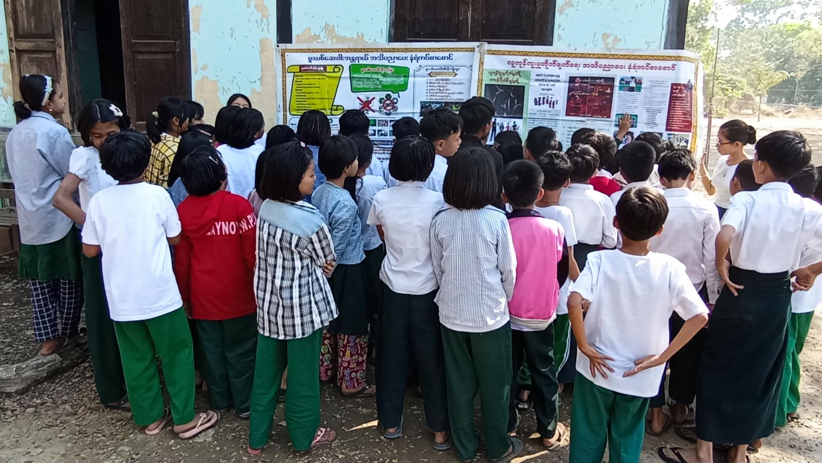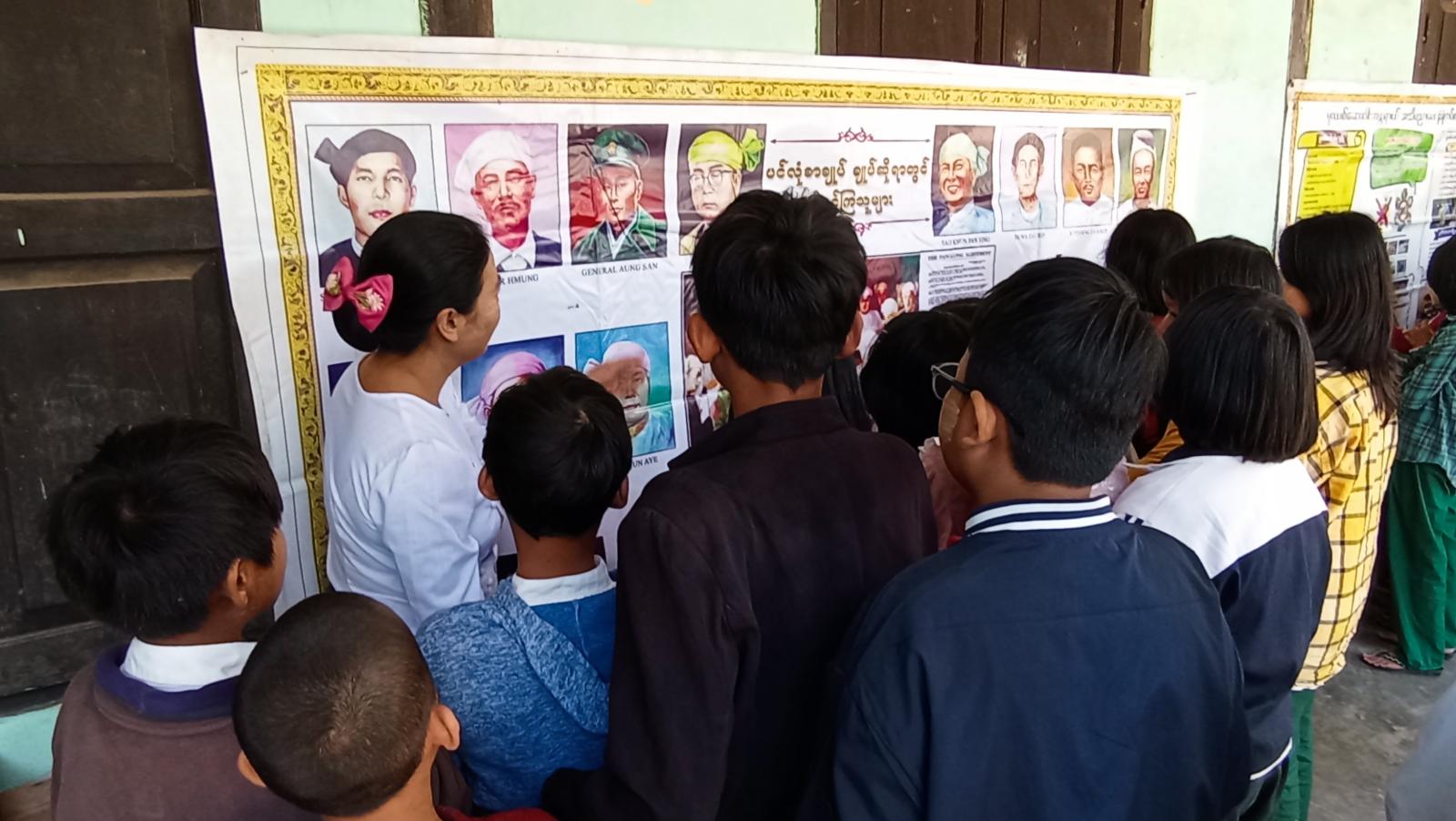 ထို့နောက် ပြန်ကြားရေးနှင့်ပြည်သူ့ဆက်ဆံရေးဦးစီးဌာနမှခင်းကျင်းပြသထားသော ပြည်ထောင်စုနေ့အထိမ်းအမှတ် အသိပညာပေးနံရံကပ်စာစောင်၊ မူးယစ်ဆေးဝါးအန္တရာယ်တားဆီးကာကွယ်ရေး အသိပညာပေးနံရံကပ်စာစောင်၊ လူကုန်ကူးမှု အန္တရာယ်တာဆီးကာကွယ်ရေး အသိပညာပေးနံရံကပ်စာစောင်များနှင့် သုတ၊ ရသ စာအုပ်စာစောင်များကို ကျောင်းသား၊ကျောင်းသူများက စိတ်ပါဝင်စားစွာဖြင့်ကြည့်ရှုလေ့လာခဲ့ကြောင်းသိရှိရသည်။