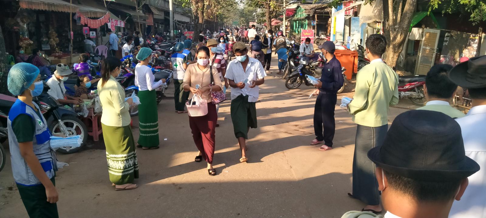 ရန်ကုန်တိုင်းဒေသကြီး၊ ရန်ကုန်တောင်ပိုင်းခရိုင်၊ ဆိပ်ကြီးခနောင်တိုမြို့နယ်၌ ကိုဗစ်-၁၉ ရောဂါ ကာကွယ်၊ ထိန်းချုပ်ရေး လုပ်ငန်း များကို အရှိန်အဟုန်မပြတ် ဆက်လက် ဆောင်ရွက်လျက်ရှိရာ ယနေ့ နံနက်ပိုင်းမှစ၍ မြို့နယ်ဌာနဆိုင်ရာများ ပူးပေါင်း၍ ကိုဗစ်-၁၉ ရောဂါ ကာကွယ်ခြင်း ဆိုင်ရာ ကျန်းမာရေး အသိပညာပေးခြင်းနှင့် (Mask Campaign) ကို မြို့နယ်အတွင်း လူစည်ကားရာ နေရာများတွင် ပြုလုပ်လျက်ရှိသည်။