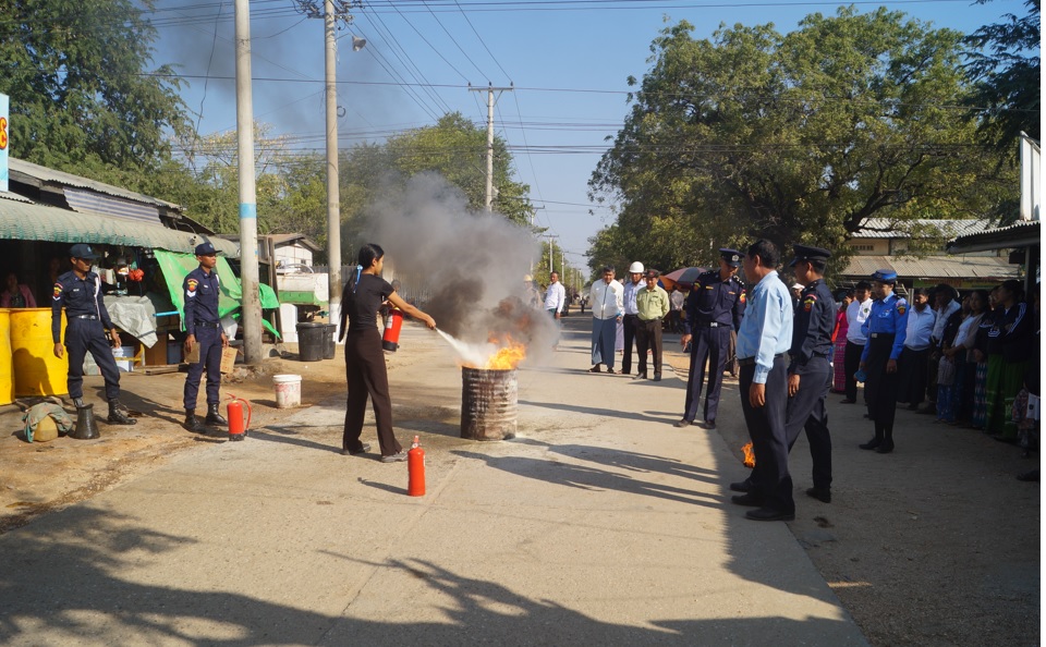 ရှေးဦးစွာ မြို့နယ်မီးသတ်တပ်ဖွဲ့ဦးစီးအရာရှိ ဦးအေးမင်းမောင်က မီးလောင်မှုဖြစ်ပွားရခြင်း၏ အကြောင်းအရင်းများနှင့် ကြိုတင်ကာကွယ်ရေးလုပ်ငန်းများ၊ အရေးပေါ်မီးငြှိမ်းသတ်နည်းနှင့် မီးသတ်ဆေးဘူးဖြင့် မီးကငြှိမ်းသတ်နည်းများကို ရှင်းလင်းပြသပေးပြီး အရေးပေါ်မီးငြှိမ်းသတ်နည်းများကို မြို့နယ်မီးသတ်တပ်ဖွဲ့နှင့် မြို့နယ်စည်ပင်သာယာရေးဝန်ထမ်းများ၊ ဈေးသူဈေးသားများနှင့် ဒေသခံပြည်သူများ ပူးပေါင်းဇာတ်တိုက်လေ့ကျင့်ဆောင်ရွက်ခဲ့ပြီး မီးသတ်ယာဉ်နှင့် အထောက်အကူပြု ရေသယ်ယာဉ်တို့ဖြင့် မီးငြှိမ်းသတ်နည်းများကို လက်တွေ့ပြသဆောင်ရွက်ခဲ့ကြသည်။ ထို့နောက် မြို့နယ်ဘေးအန္တရာယ်ဆိုင်ရာစီမံခန့်ခွဲရေးကော်မတီဥက္ကဋ္ဌနှင့် အဖွဲ့သည် မြို့နယ်စည်ပင်သာယာရေးအဖွဲ့ပိုင် ပတ္တမြားဈေး မီးဘေးလုံခြုံရေးအတွက် မီးသတ်ရေကန်၊ အရေးပေါ်မီးငြှိမ်းသတ်ရေး စက်ပစ္စည်းများ ဆောင်ရွက်ထားရှိမှုအခြေအနေများ ကြည့်ရှုစစ်ဆေးခဲ့ပြီး မြို့နယ်စည်ပင်သာယာရေးအဖွဲ့အမှုဆောင်အရာရှိ ဦးမင်းစည်သူက ပတ္တမြားဈေးနှင့် ဈေးဆိုင်များတွင် မီးဘေးလုံခြုံရေးနှင့် ကြိုတင်ကာကွယ်ရေးအတွက် စီမံဆောင်ရွက်ထားရှိမှုတို့ကို လှည့်လည်ရှင်းလင်းပြသပေးခဲ့ကြောင်း သိရသည်။