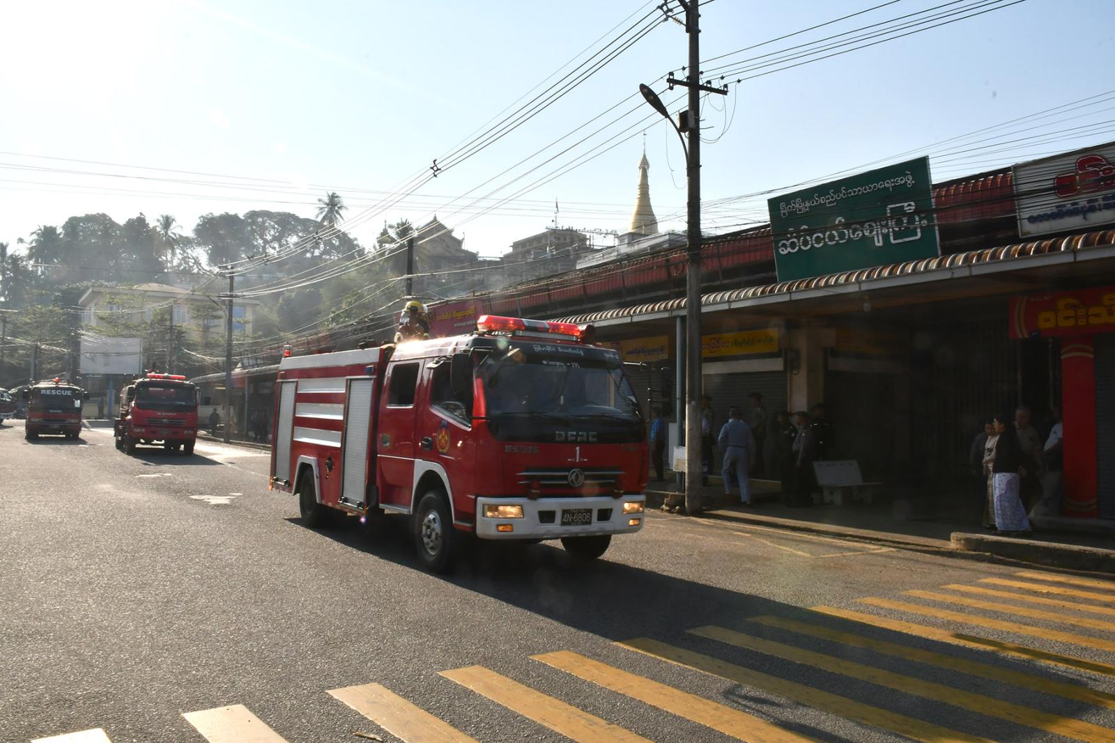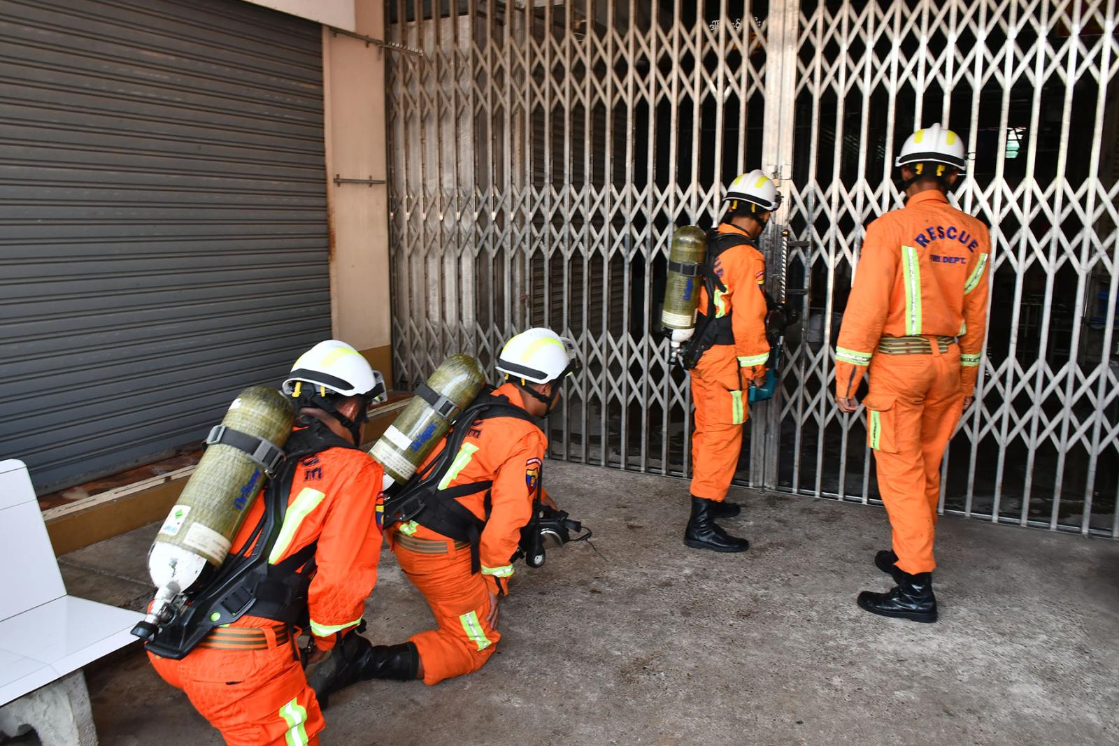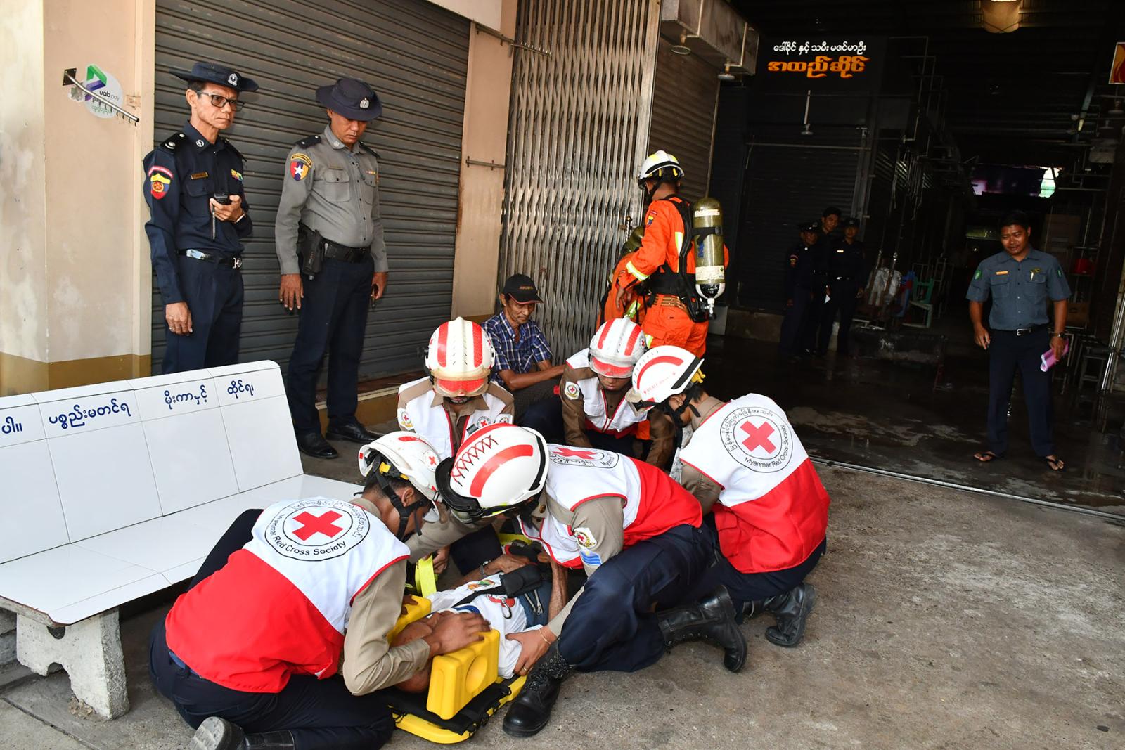 သရုပ်ပြဇာတ်တိုက်လေ့ကျင့်ဆောင်ရွက်ရာတွင် ဆိပ်ငယ်ဈေးအတွင်းပိုင်းနှင့် အပြင်ပိုင်းနှစ်ပိုင်းခွဲ၍ ပြုလုပ်ခဲ့ကြပြီး ဈေးအတွင်း Fire Point (ဆီဗန်းမီးလောင်မှု)အား ဈေးသူ/သားများနှင့် ဈေးသီးသန့်မီးသတ်တပ်ဖွဲ့မှ မီးသတ်ဆေးဘူးများဖြင့် ငြှိမ်းသတ်ခြင်းနှင့် ရေပက်ပိုက်ဖြင့် ငြှိမ်းသတ်ခြင်းပြုလုပ်ကြသည်။ ထို့နောက် မီးသတ်တပ်ဖွဲ့ဝင်များမှ မီးငြှိမ်းသတ်ယာဉ်နှင့်ရှာဖွေကယ်ဆယ်ရေးယာဉ်များ ရောက်ရှိကြပြီး ဈေးအတွင်းပိုင်း မီးလောင်မှုအားငြှိမ်းသတ်ခြင်း၊ ဈေးအတွင်းပိုင်းရှိ လူနာကယ်ထုတ်ခြင်းနှင့် ဒဏ်ရာရလူနာများအား ကြက်ခြေနီတပ်ဖွဲ့သို့ လွှဲပြောင်း၍ လူနာများကိုရှေးဦးပြုစုခြင်းနှင့် လူနာတင်ယာဉ်ဖြင့် ဆေးရုံသို့ပို့ဆောင်ခြင်းကို ဇာတ်တိုက်သရုပ်ပြဆောင်ရွက်ကြသည်။