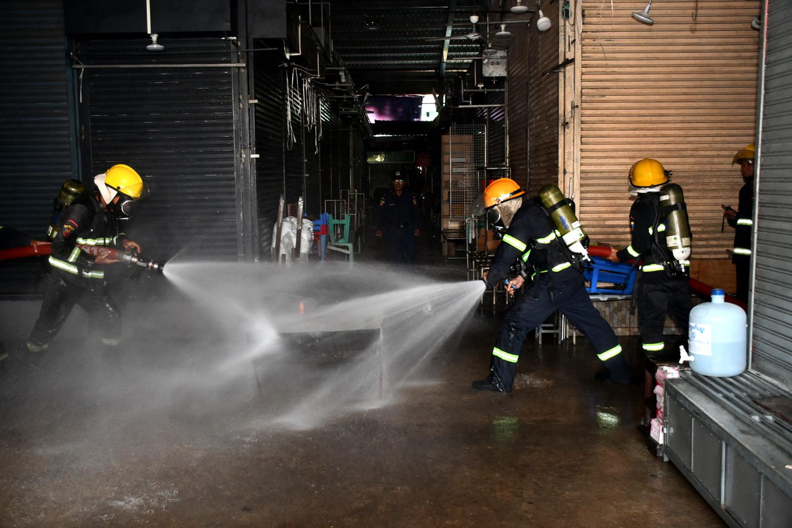ထို့နောက် ဈေးအပြင်ဘက်တွင် ဗဟိုမီးသတ်စခန်းနှင့် အရန်မီးသတ်စခန်းများမှ မီးငြှိမ်းသတ်ယာဉ်များဖြင့် ဈေး၏မျက်နှာစာလေးဘက်မှနေရာယူ၍ Fire Point နေရာအား စုပေါင်းမီးငြှိမ်းသတ်ခြင်းကို စနစ်တကျ ဇာတ်တိုက်လေ့ကျင့်ဆောင်ရွက်ခဲ့ကြရာ သရုပ်ပြဇာတ်တိုက်လေ့ကျင့်ခြင်းကို မြိတ်ခရိုင်/မြို့နယ် စီမံခန့်ခွဲရေးနှင့် အုပ်ချုပ်ရေးကော်မတီဝင်များ၊ ဌာနဆိုင်ရာတာဝန်ရှိသူများ၊ ဈေးသူဈေးသားများက ကြည့်ရှုအားပေးခဲ့ကြပြီး ဇာတ်တိုက်လေ့ကျင့်မှုအပြီးတွင် ဈေးတာဝန်ခံရုံး၌ တာဝန်ရှိသူများမှ အားသာချက်၊ အားနည်းချက်များ ဆွေးနွေးခဲ့ကြကြောင်း သိရသည်။