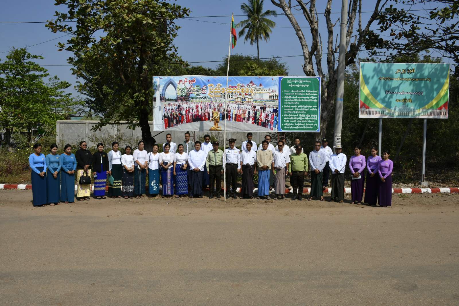 ရှေ့ဦးစွာ အဆိုပါဆိုင်းဘုတ်အား မြို့နယ်စီမံခန့်ခွဲရေးနှင့်အုပ်ချုပ်ရေးကော်မတီဥက္ကဋ္ဌ ဦးဇော်မျိုးနှင့် တာဝန်ရှိသူများက ဆိုင်းဘုတ်အား စိုက်ထူကာ အမွှေးနံသာရည်များ ပက်ဖျန်းပေးပြီး တက်ရောက်လာသူများနှင့် စုပေါင်းမှတ်တမ်းတင်ဓာတ်ပုံ ရိုက်ကူးခဲ့ကြသည်။ ထို့နောက် မြို့နယ်ပြည်သူ့ဆက်ဆံရေးဦးစီးဌာနမှ ဝန်ထမ်းများနှင့် မြို့နယ်အမျိုးသမီးရေးရာအဖွဲ့ဝင်များ၊ မိခင်နှင့်ကလေးစောင့်ရှောက်ရေးအသင်းဝင်များက (၇၉) နှစ်မြောက် ပြည်ထောင်စုနေ့အထိမ်းအမှတ် သတင်းစကားလက်ကမ်းစာစောင်များကို ဖြန့်ဝေပေးခဲ့ကြသည်။