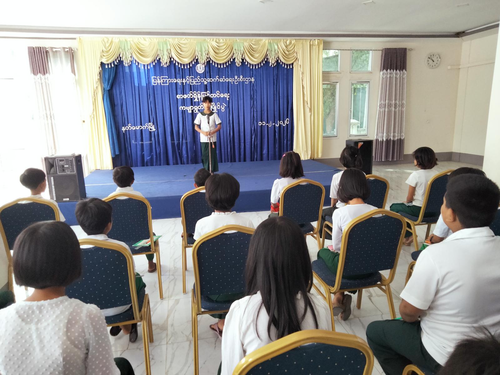 ရှေးဦးစွာ မြို့နယ်ပြန်ကြားရေးနှင့်ပြည်သူ့ဆက်ဆံရေးဦးစီးဌာန ဦးစီးအရာရှိ ဒေါ်ဥမ္မာခင်က စာပေလေ့လာဖတ်ရှုသည့် အလေ့အကျင့်ကောင်းများရရှိစေရန်၊ ကလေးငယ်များဘဝ စွမ်းဆောင်ရည်မြင့်မာစေရန်၊ စိတ်လက်ပျော်ရွှင်စေရန်၊ ဉာဏ်ရည်ဉာဏ်သွေးထက်မြက်စေရန် ရည်ရွယ်၍ ပြိုင်ပွဲများကျင်းပရခြင်းဖြစ်ကြောင်း ရှင်းလင်းပြောကြားခဲ့သည်။ ဆက်လက်၍ အလယ်တန်းအဆင့် ကျောင်းသား/သူများဖြင့် ကဗျာရွတ်ဆိုပြိုင်ပွဲကျင်းပရာ ကျောင်းသား/သူလေးများမှ မိမိတို့ကြိုက်နှစ်သက်ရာကဗျာများဖြင့် ဝင်ရောက်ယှဉ်ပြိုင်ကြပြီး အဆိုပါကဗျာရွတ်ဆိုပြိုင်ပွဲသို့ အမှတ်(၁)အခြေခံပညာအထက်တန်းကျောင်းမှ အလယ်တန်းအဆင့်ဆရာမများ၊ ကျောင်းသား/သူများ စုစုပေါင်း(၅၀)ဦး တက်ရောက်ခဲ့ကြကြောင်း သိရသည်။