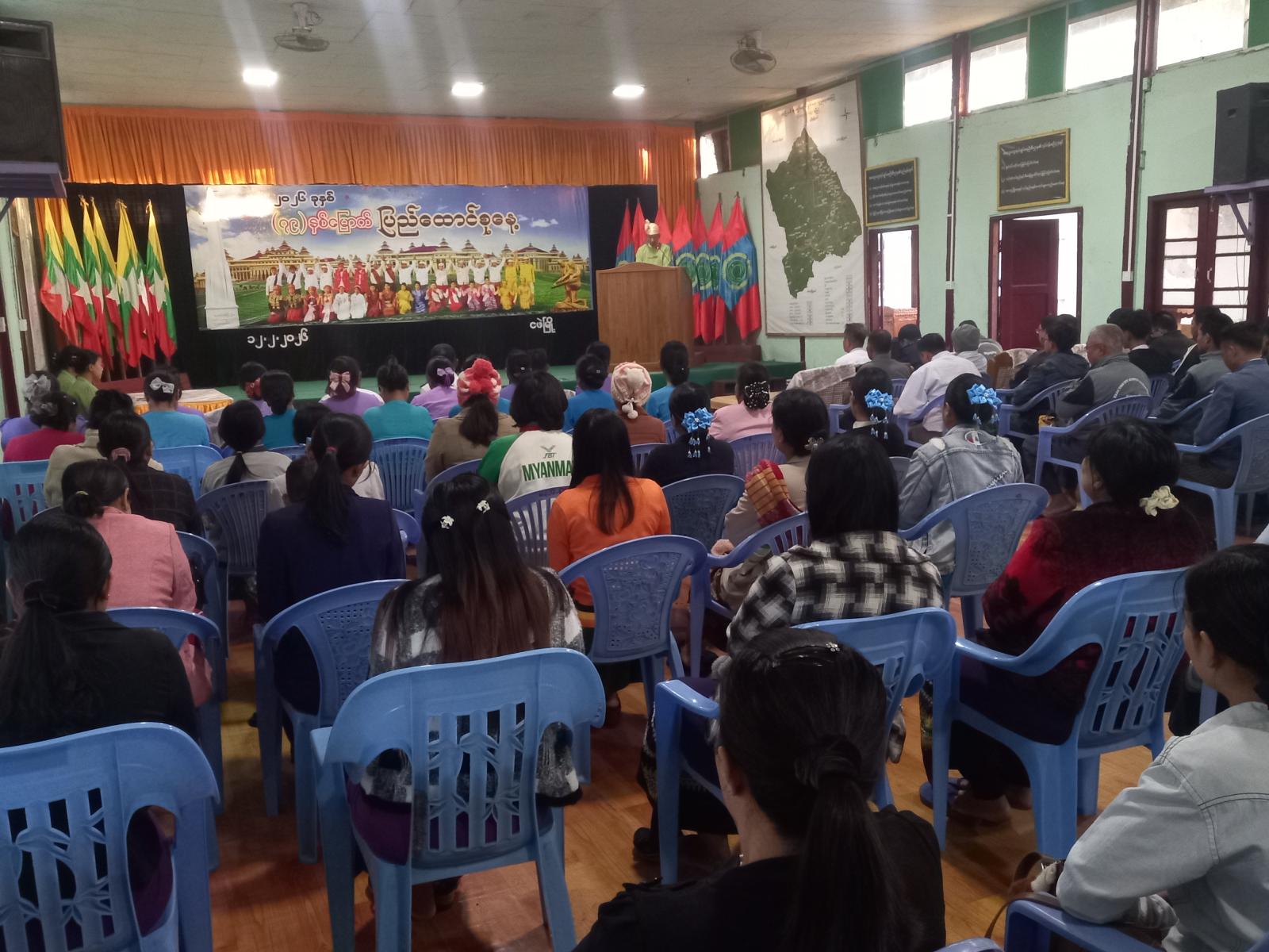 ရှေးဦးစွာ အခမ်အနားသို့ တက်ရောက်လာကြသော မြို့နယ်စီမံခန့်ခွဲရေးနှင့်အုပ်ချုပ်ရေးကော်မတီဥက္ကဋ္ဌနှင့် အဖွဲ့ဝင်များ၊ ဌာနဆိုင်ရာအကြီးအကဲများနှင့်ဝန်ထမ်းများ၊ ရပ်ကွက်အုပ်ချုပ်ရေးမှူးများက ပြည်ထောင်စုသမ္မတမြန်မာနိုင်ငံတော်အလံအား အလေးပြုပြီး နိုင်ငံတော်လုံခြုံရေးနှင့်အေးချမ်းသာယာရေးကော်မရှင်ဥက္ကဌ ဗိုလ်ချုပ်မှူးကြီး သတိုးမဟာသရေစည်သူ သတိုးသီရိသုဓမ္မ မင်းအောင်လှိုင်ထံမှ ၂၀၂၆ ခုနှစ် (၇၉) နှစ်မြောက် ပြည်ထောင်စုနေ့အခမ်းအနားသို့ပေးပို့သည့် သဝဏ်လွှာအား မြို့နယ်စီမံခန့်ခွဲရေးနှင့်အုပ်ချုပ်ရေးကော်မတီဥက္ကဋ္ဌ မြို့နယ်အုပ်ချုပ်ရေးမှူး ဦးကျော်စိုးကဖတ်ကြား၍ မြို့နယ်ပြန်ကြားရေးနှင့်ပြည်သူ့ဆက်ဆံရေးဦးစီးဌာနရုံး ဝန်ထမ်းများက (၇၉)နှစ်မြောက် ပြည်ထောင်စုနေ့အထိမ်းအမှတ် သတင်းစကားလက်ကမ်းစာစောင်များကို တက်ရောက်လာကြသူများအား ဖြန့်ဝေပေးခဲ့ကြောင်း သိရသည်။