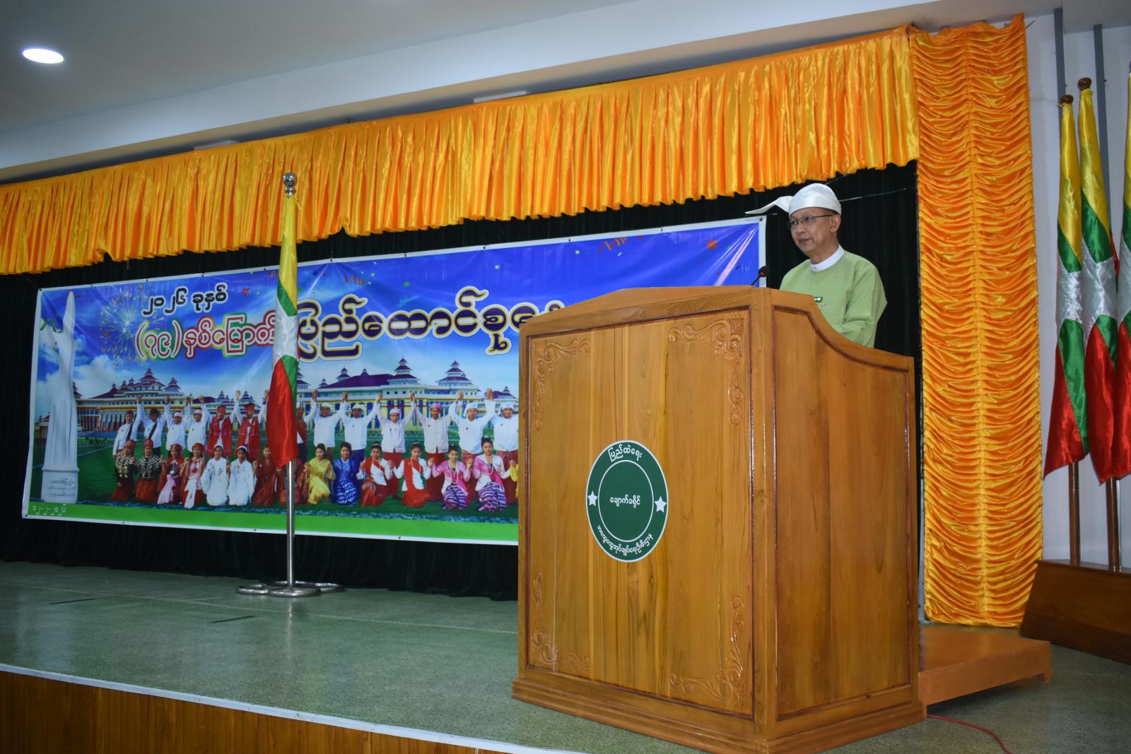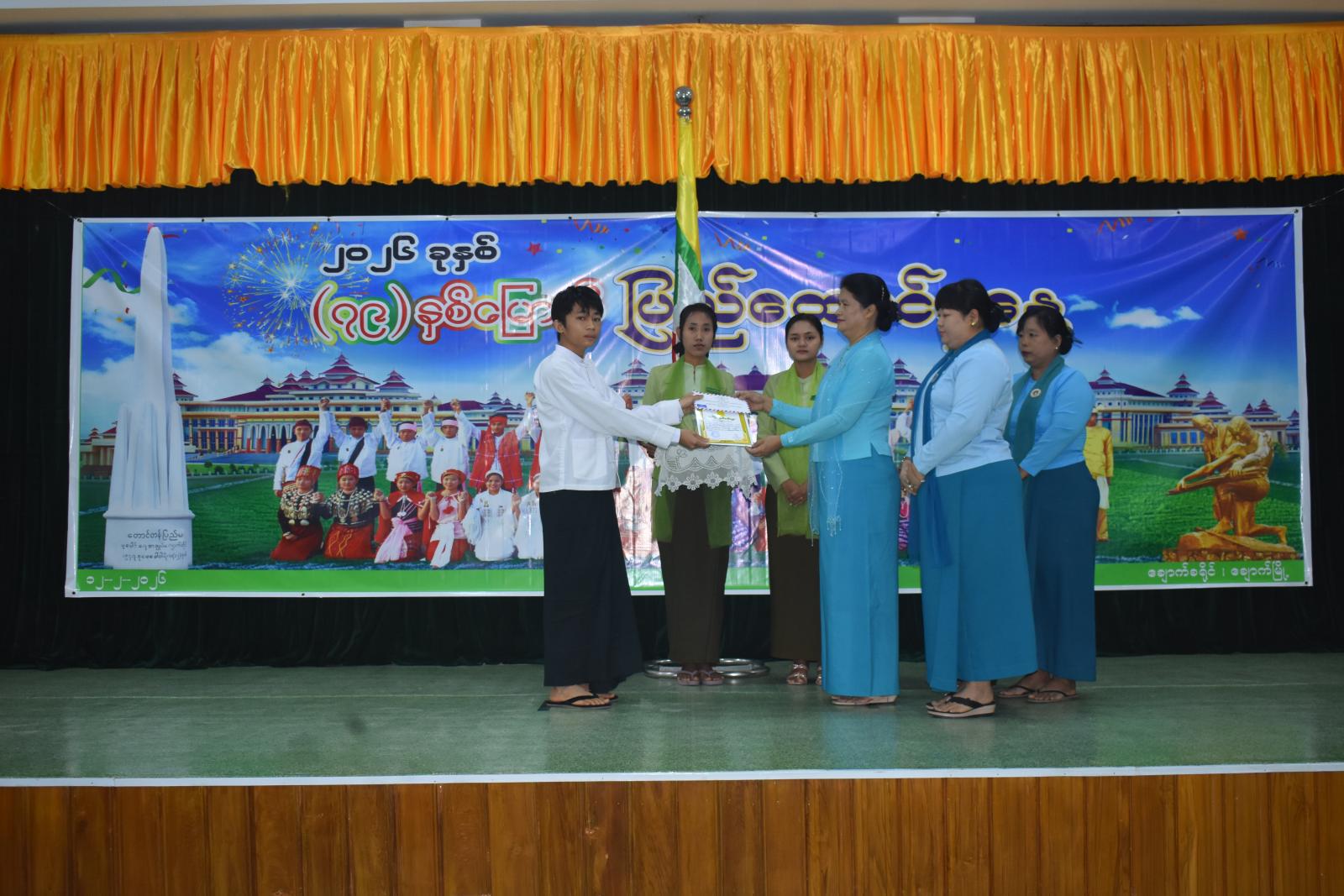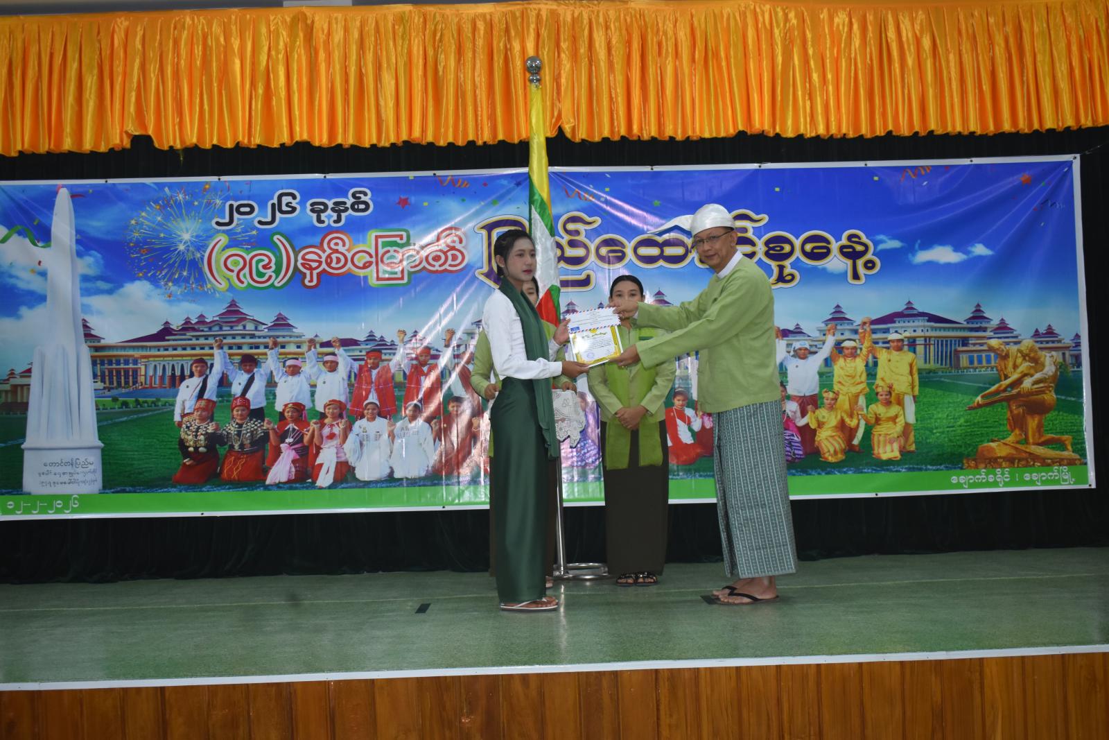 အဆိုပါအခမ်းအနားတွင် (၇၉)နှစ်မြောက် ပြည်ထောင်စုနေ့အထိမ်းအမှတ် မြို့နယ်အဆင့်အထက်တန်း၊ အလယ်တန်း၊ မူလတန်းစာစီစာကုံး၊ ပန်းချီ၊ ကဗျာပြိုင်ပွဲများတွင် ဆုရရှိသည့် ကျောင်းသား/သူများအား ခရိုင်စီမံခန့်ခွဲရေးနှင့်အုပ်ချုပ်ရေးကော်မတီဥက္ကဋ္ဌ ဦးမိုးဇော်နိုင်နှင့် ခရိုင်စီမံခန့်ခွဲရေးနှင့်အုပ်ချုပ်ရေးကော်မတီအဖွဲ့ဝင်များ၊ ခရိုင်အမျိုးသမီးရေးရာဥက္ကဋ္ဌ ဒေါ်ဝင်းမာသိန်းနှင့် တာဝန်ရှိသူများက ဆုများအသီးသီးပေးအပ်ချီးမြှင့်ခဲ့ကြောင်း သိရသည်။ အခမ်းအနားတွင် မြို့နယ်ပြန်ကြားရေးနှင့်ပြည်သူ့ဆက်ဆံရေးဦးစီးဌာန ဝန်ထမ်းများက (၇၉)နှစ်မြောက် ပြည်ထောင်စုနေ့အထိမ်းအမှတ် သတင်းစကားလက်ကမ်းစာစောင်များ ဖြန့်ဝေခဲ့ကြောင်း သိရသည်။