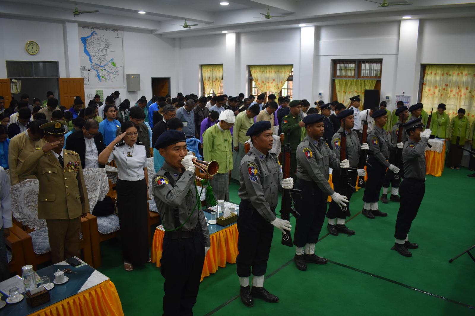 ရှေးဦးစွာ (၇၉)နှစ်မြောက် ပြည်ထောင်စုနေ့အခမ်းအနား၌ ပြည်ထောင်စုသမ္မတ မြန်မာနိုင်ငံတော်အလံအား မြန်မာနိုင်ငံရဲတပ်ဖွဲ့ ဂုဏ်ပြုတပ်ဖွဲ့ဖြင့် အလေးပြုခဲ့ရာ ခရိုင်စီမံခန့်ခွဲရေးနှင့်အုပ်ချုပ်ရေးကော်မတီဥက္ကဋ္ဌ ဦးမိုးဇော်နိုင်နှင့် အဖွဲ့ဝင်များ၊ ခရိုင်အဆင့် ဌာနဆိုင်ရာများ၊ မြို့နယ်စီမံခန့်ခွဲရေးနှင့်အုပ်ချုပ်ရေးကော်မတီဥက္ကဋ္ဌ ဦးစိုးလွင်နှင့်အဖွဲ့ဝင်များ၊ မြို့နယ်အဆင့်ဌာနဆိုင်ရာများ၊ ဖိတ်ကြားထားသူများက နိုင်ငံတော်အလံအား အလေးပြုကြသည်။