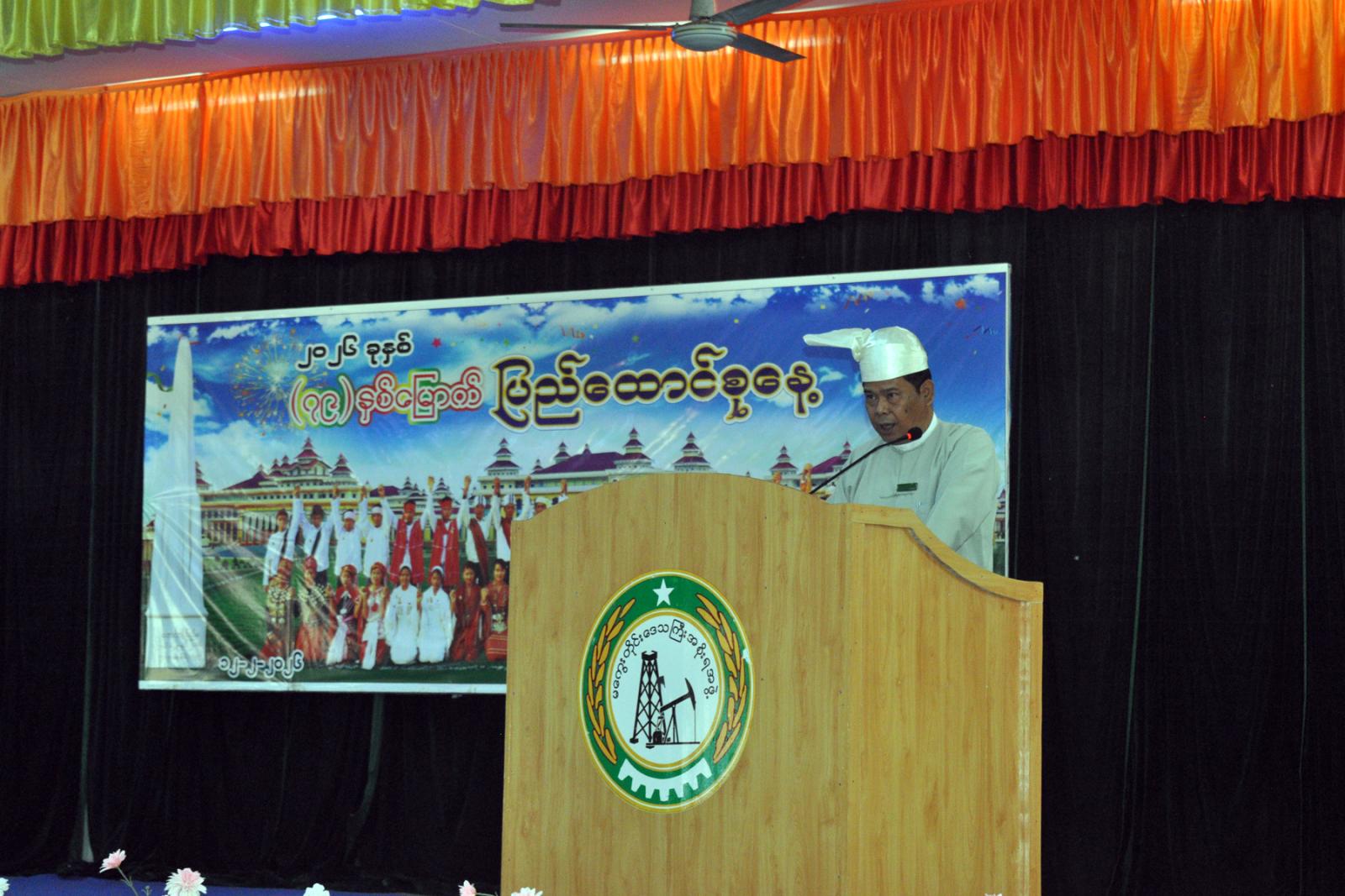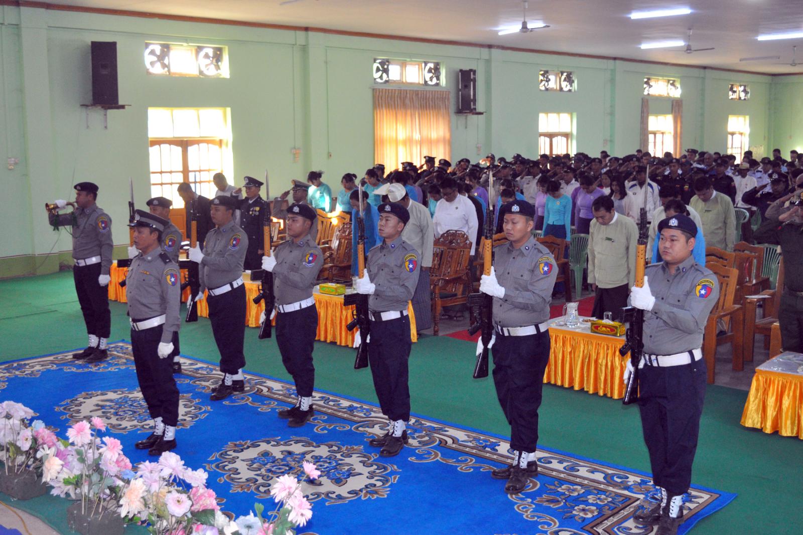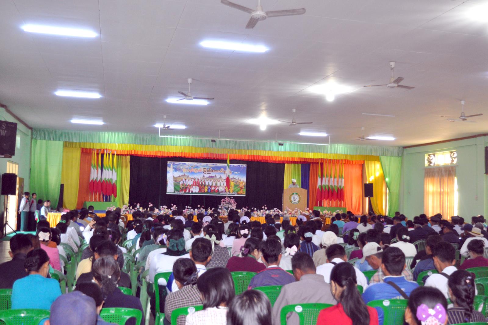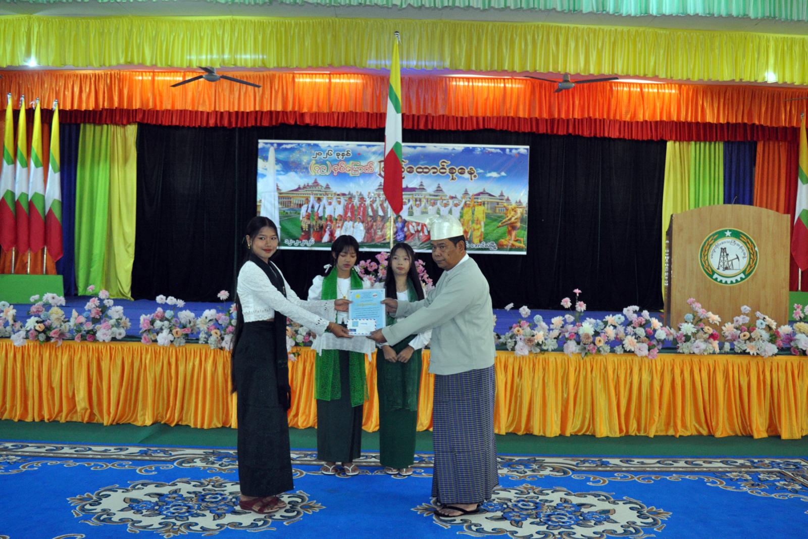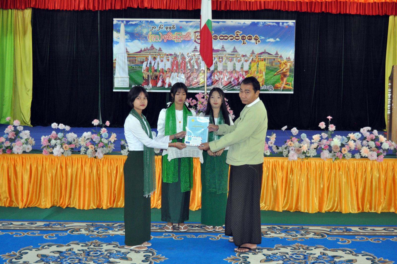 ထို့နောက် (၇၉) နှစ်မြောက် ပြည်ထောင်စုနေ့အထိမ်းအမှတ်အဖြစ် ကျင်းပခဲ့သည့် စာစီစာကုံး၊ ကဗျာ၊ ပန်းချီ၊ ဆောင်းပါး ပြိုင်ပွဲများတွင် ဆုရရှိသည့် ကျောင်းသား/ကျောင်းသူများအား တာဝန်ရှိသူများက ဆုများအသီးသီးပေးအပ်ချီးမြှင့်ခဲ့ပြီး၊ အခမ်းအနားသို့ ခရိုင်/မြို့နယ် စီမံခန့်ခွဲ ရေးနှင့် အုပ်ချုပ်ရေးအဖွဲ့ဝင်များ၊ ဌာနဆိုင်ရာတာဝန်ရှိသူများ၊ ဆရာ/ဆရာမများ၊ ကျောင်းသား/ ကျောင်းသူများနှင့် ဖိတ်ကြားထားသော ဧည့်သည်တော်များ တက်ရောက်ခဲ့ကြကြောင်း သိရသည်။