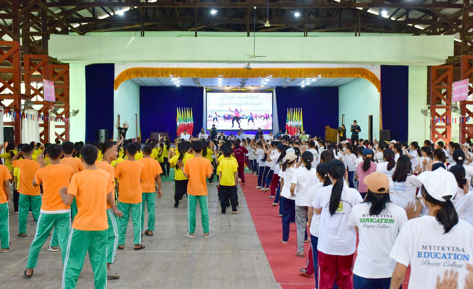 ထို့နောက် မွန်းလွဲပိုင်းတွင် ပြည်နယ်ဝန်ကြီးချုပ်နှင့်အဖွဲ့ဝင်များသည် မြစ်ကြီးနားမြို့၊ မိုးလုံလေလုံအားကစားခန်းမ၌ ကျင်းပပြုလုပ်လျက်ရှိသည့် ပြည်ထောင်စုနေ့အထိမ်းအမှတ် လူထုအားကစားလှုပ်ရှားမှုအဖြစ် Zumba Festival စုပေါင်းအကပြိုင်ပွဲ ကျင်းပပြုလုပ်နေမှုကိုလည်းကောင်း၊ ငြိမ်းချမ်းသာယာဖူဆယ်အားကစားရုံ၌ သယံဇာတရေးရာဝန်ကြီးဌာနနှင့် ပြည်နယ်အားကစားနှင့်ကာယပညာဦးစီးဌာနတို့ ပူးပေါင်းစီစဉ်ကျင်းပသော အမျိုးသမီးအလွတ်တန်း ဖူဆယ်ဘောလုံးပြိုင်ပွဲ အသင်း (၈)သင်း ပါဝင်ယှဉ်ပြိုင်ကျင်းပနေမှုကိုလည်းကောင်း ကြည့်ရှုအားပေးခဲ့ကြပြီး အားကစားပြိုင်ပွဲကျင်းပရေး တာဝန်ရှိသူများအတွက် ဂုဏ်ပြုချီးမြှင့်ငွေများကို ပေးအပ်ချီးမြှင့်ခဲ့ကြသည်။