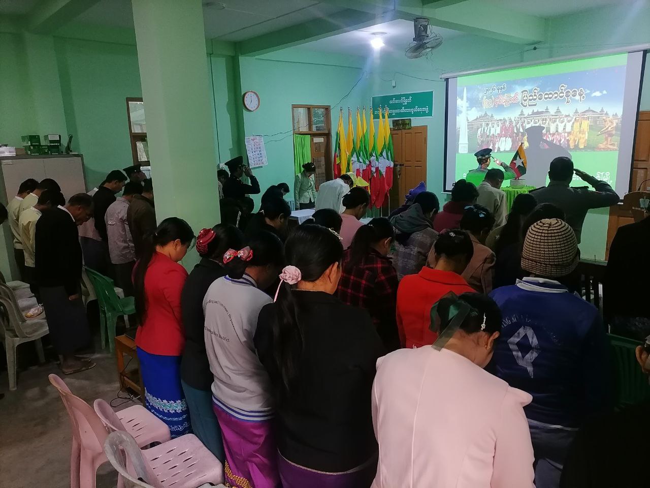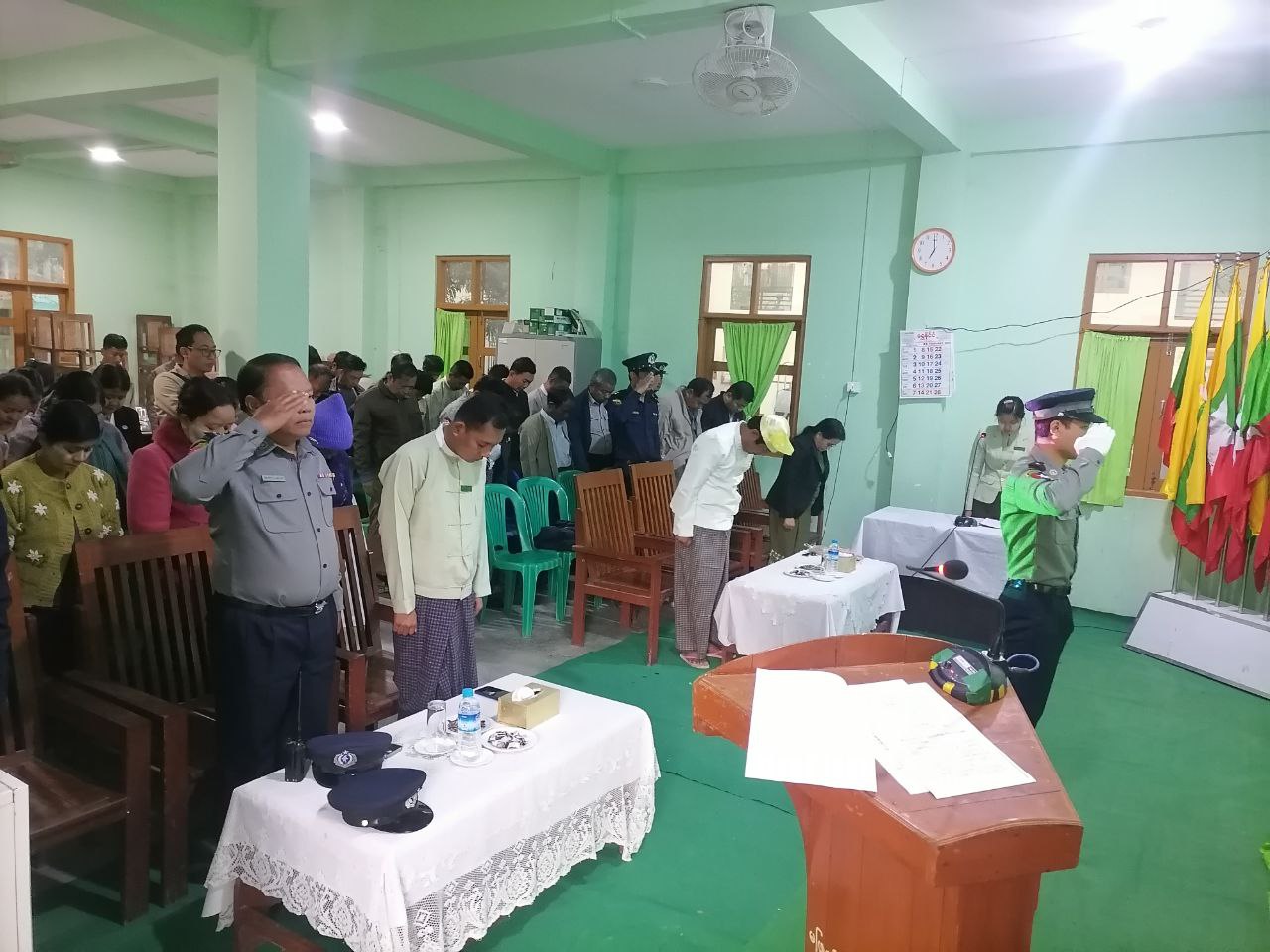 ရှေးဦးစွာ မြန်မာနိုင်ငံရဲတပ်ဖွဲ့ကဦးဆောင်၍ တက်ရောက်လာကြသည့် ဌာနဆိုင်ရာများမှ ပြည်ထောင်စုသမ္မတ မြန်မာနိုင်ငံတော်အလံအား အလံတင်အလေးပြုခဲ့ကြသည်။