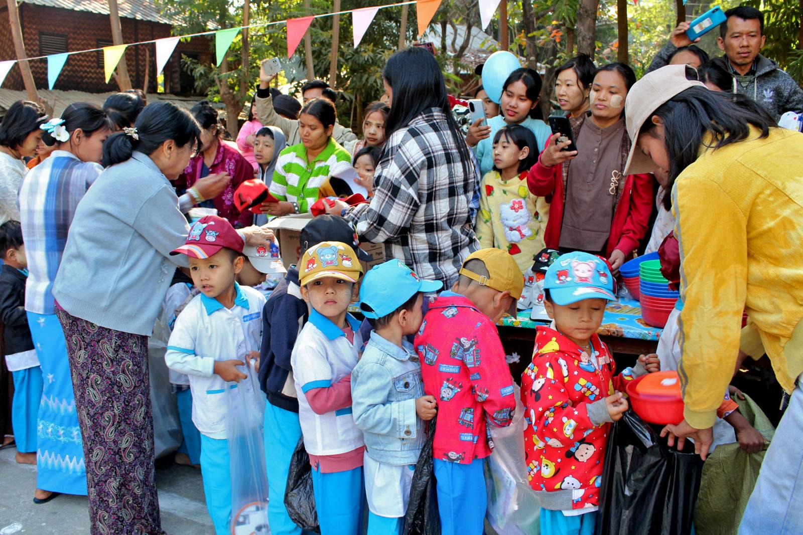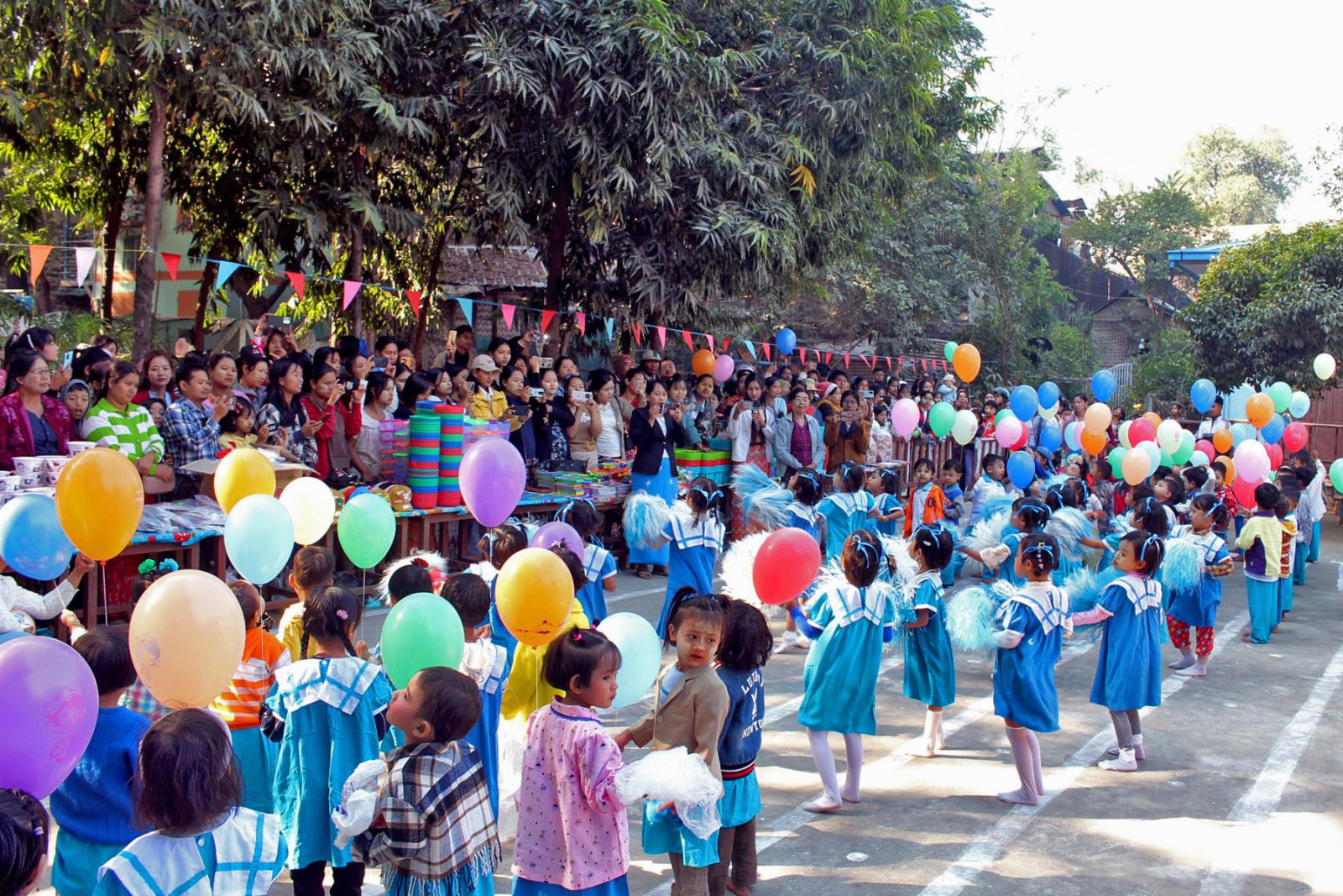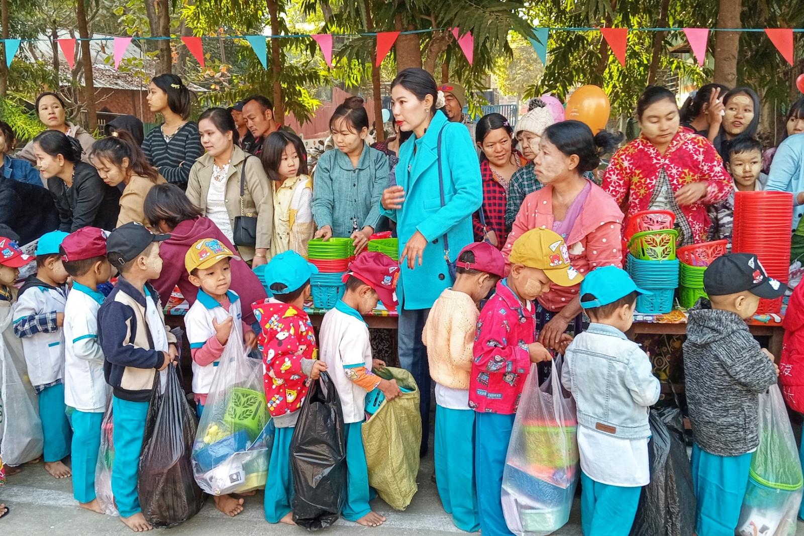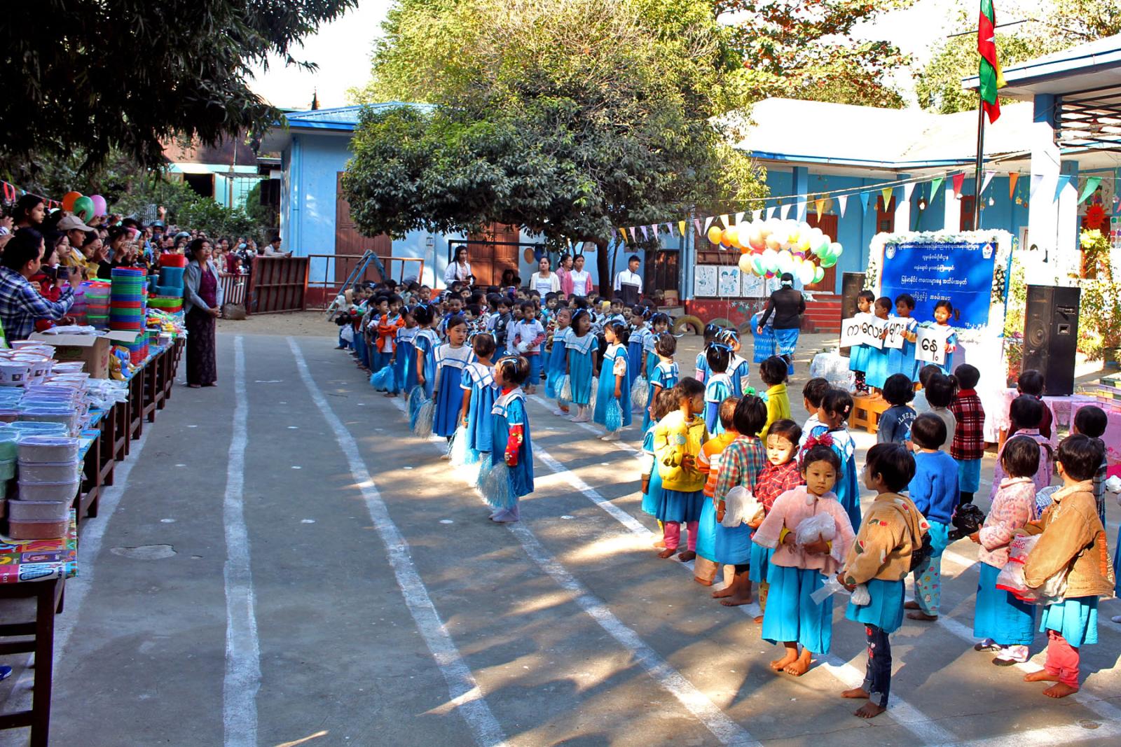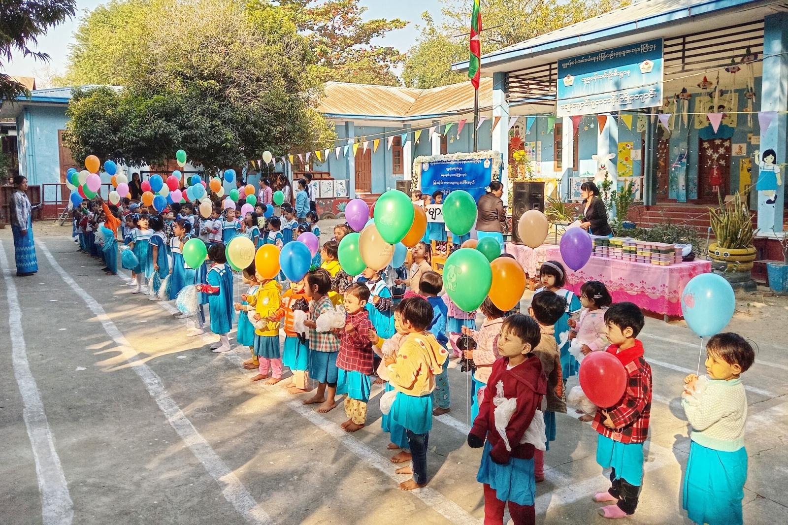 ရှေးဦးစွာ ရေနံချောင်းမူလတန်းကြိုကျောင်းအုပ်ဆရာမကြီး ဒေါ်ပပအုန်းနှင် ဆရာမများက ဦးဆောင်ကာ သားငယ်သမီးငယ်လေးများက တေးသီးချင်းများဖြင့် ကပြဖျော်ဖြေပြီး ကလေးများနေ့ကဗျာ၊ ဗိုလ်ချုပ်အောင်ဆန်းနှင့်ပတ်သက်သည့် ကဗျာများ၊ (၃၈) ဖြာမင်္ဂလာတရားကဗျာများကို ရွတ်ဆိုခဲ့ကြသည်။ ထို့နောက် သားငယ်သမီးငယ်လေးများက မိုးပျံပူဖောင်းများ လွှတ်တင်ကာ နိဗ္ဗာန်ဈေးပွဲတော်ကို ဖွင့်လှစ်ပြီး မိဘအုပ်ထိန်းသူများအဖွဲ့ (၁၁) က သားငယ်သမီးငယ် ၁၁၅ ဦးအား ထမင်းဘူး၊ လက်ဆွဲခြင်း၊ ရောင်စုံခဲ့တံ၊ ရောင်ခြယ်စာအုပ်၊ ဦးထုပ်၊ ရေပြွတ်၊ ရေခွက်စသည့် လက်ဆောင်ပစ္စည်းများ ပေးဝေခဲ့ကြောင်း သိရသည်။