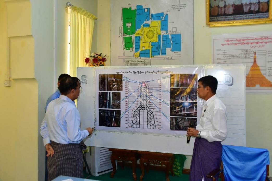 ထို့နောက် မြန်မာနိုင်ငံ အင်ဂျင်နီယာကောင်စီတွဲဖက်အတွင်းရေးမှူး ဦး‌ဌေးဦးက စေတီတော်မြတ်ကြီး အတွင်းလှိုဏ်အထဲရှိ တည်ဆောက်ထားသော ဆွေးမြေ့သံဘောင်များ စစ်ဆေးဆောင်ရွက်ထားရှိမှု အခြေအနေများနှင့် ပတ်သက်၍ ရှင်းလင်းတင်ပြပြီး KMA ကုမ္ပဏီမှ အင်ဂျင်နီယာချုပ် ဦးဝင်းနိုင်ထွန်းနှင့် KTN Structural Design Group အင်ဂျင်နီယာ ဦးကျော်သူနိုင်တို့က အတွင်းလှိုင်အတွင်း အဆင့်လိုက်ဆောင်ရွက်ရမည့် လုပ်ငန်းများနှင့် ပတ်သက်၍ ရှင်းလင်းတင်ပြကြသည်။