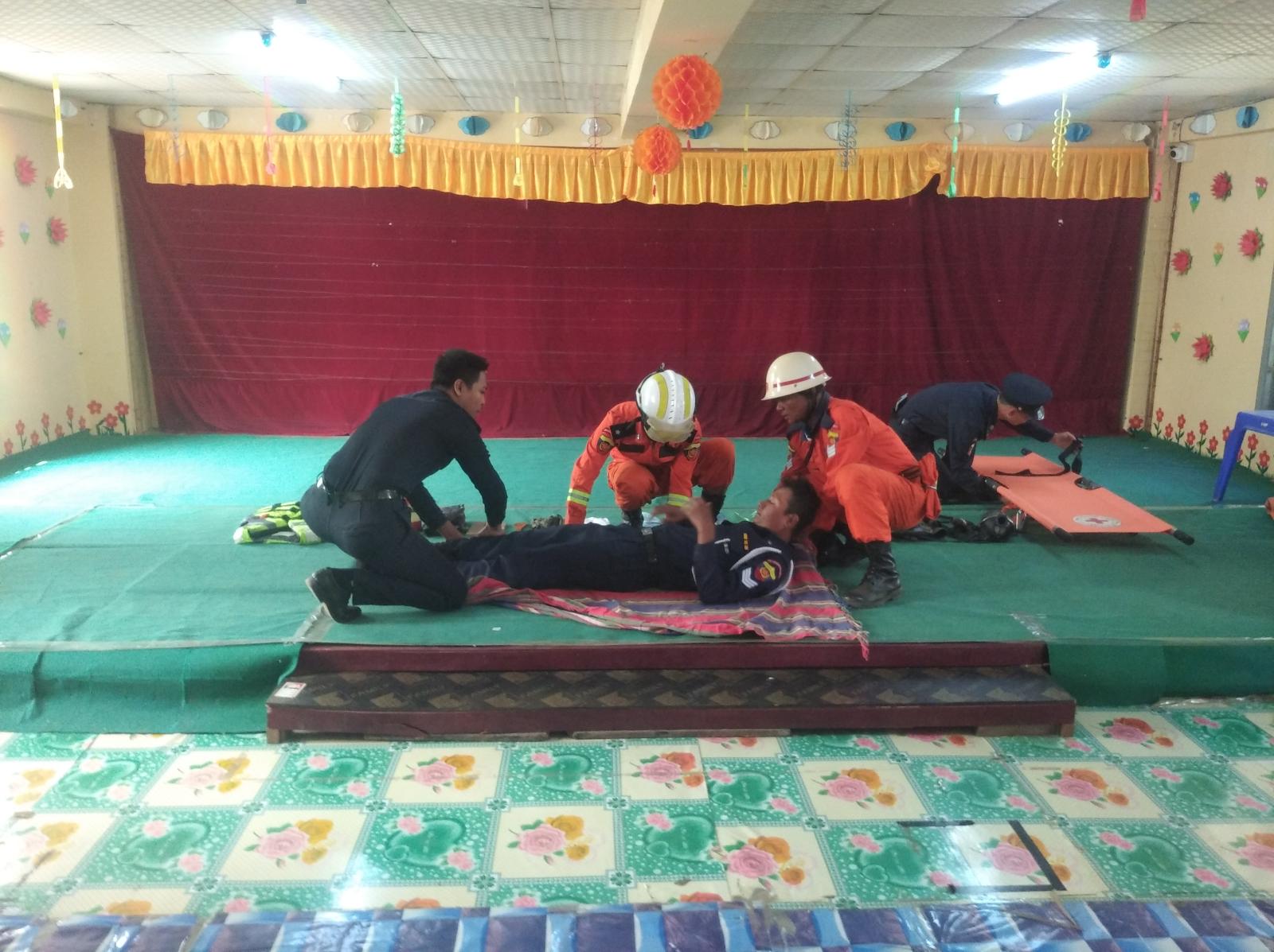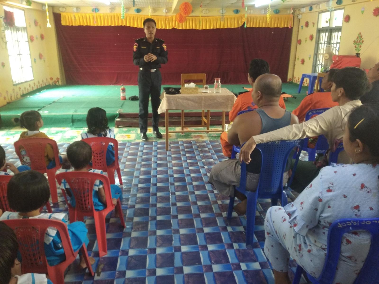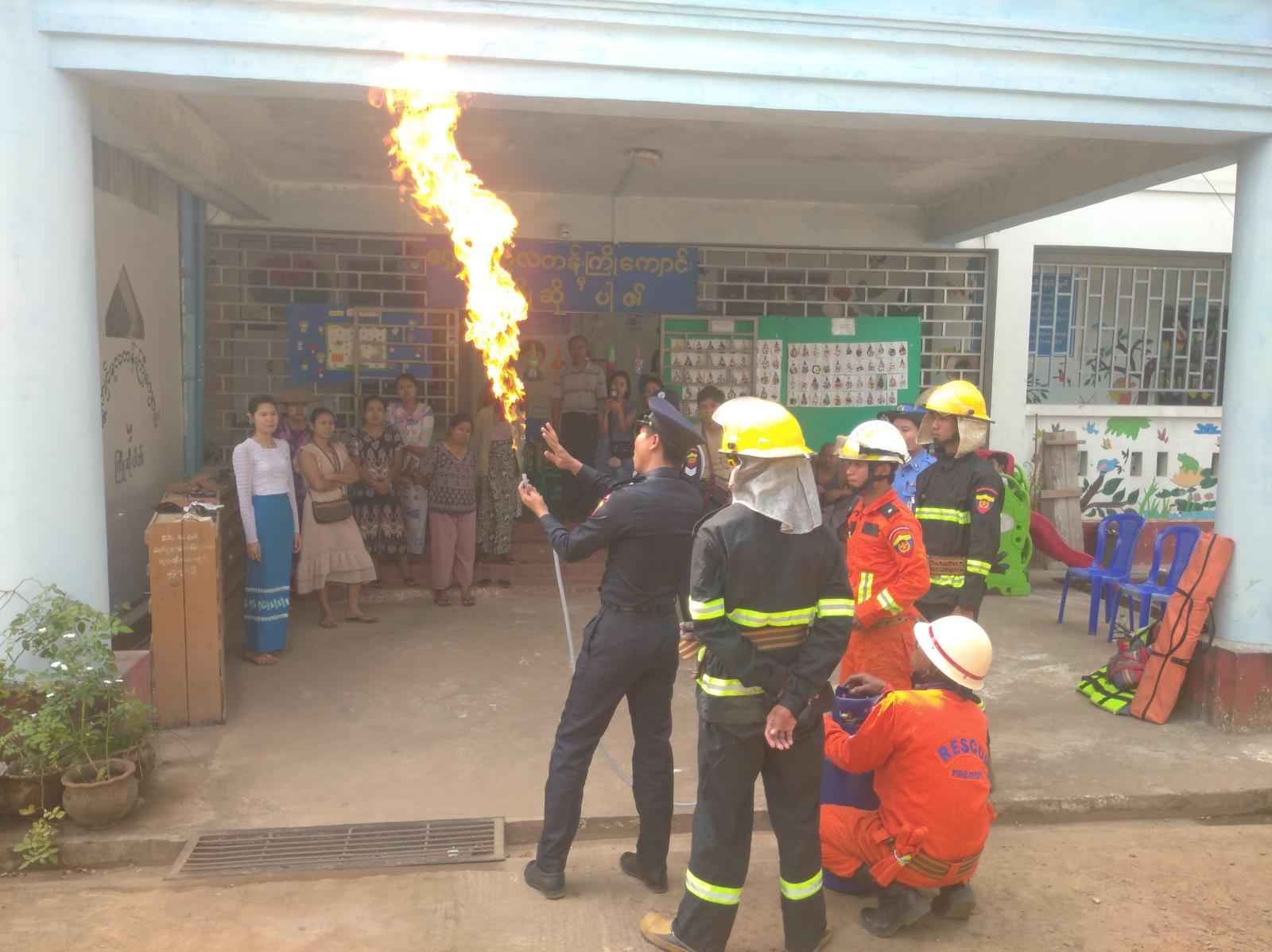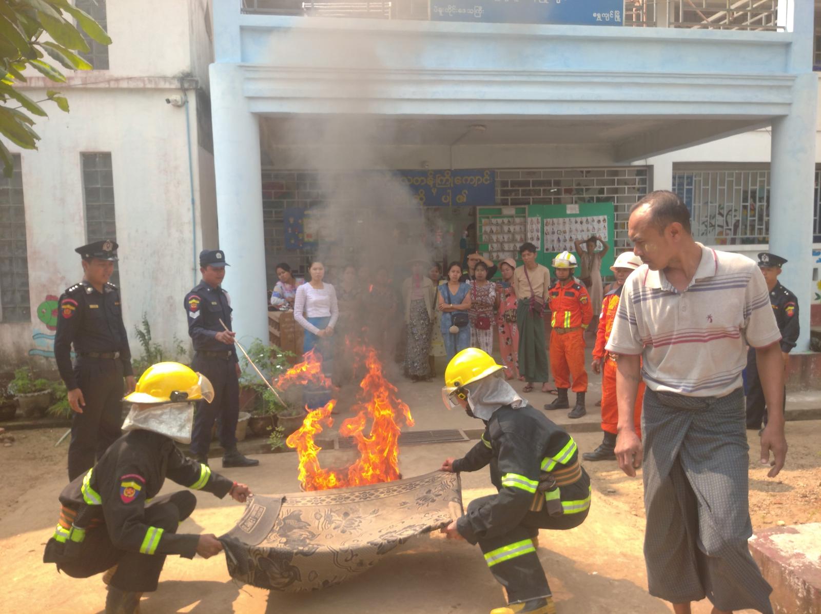 ကျောင်းမီးဘေးလုံခြုံရေး၊ သဘာဝဘေးကြိုတင်ကာကွယ်ရေးနှင့် လက်တွေ့သရုပ်ပြသခြင်းကို မြို့နယ်မီးသတ်ဦးစီးဌာနမှ ဦးစီးအရာရှိ ဦးမျိုးကျော်အောင်နှင့် ဝန်ထမ်းများက မီးဘေးအန္တရာယ်နှင့် သဘာဝဘေးအန္တရာယ်ဖြစ်ပေါ်လာပါက ဆောင်ရွက်ရမည့်နည်းလမ်းများ၊ မီးဘေးအန္တရာယ်ကြုံတွေ့ရပါက မီးငြှိမ်းသတ်နည်းများကို လက်တွေ့သရုပ်ပြသပေးခဲ့သည်။