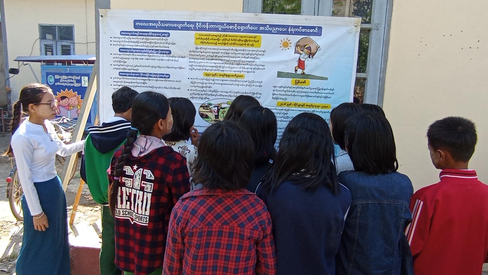 အဆိုပါ အသိပညာပေးနံရံကပ်စာစောင်တွင် ကလေးလုပ်သမား၏ အဓိပ္ပာယ်ဖွင့်ဆိုချက်များ၊ ကလေးသူငယ်များအခွင့်အရေးဆိုင်ရာဥပဒေ၊ ကလေးသူငယ်များအား လုပ်ကိုင်ခွင့်မပြုသည့်နေရာများ၊ ကလေးသူငယ်များအား ခိုင်စေခြင်းမပြုရမည့်အလုပ်များ၊ ကလေးသူငယ်အခွင့်အရေးများဆိုင်ရာ ဥပဒေများနှင့် ပြစ်မှုပြစ်ဒဏ်များစသည့် အကြောင်းအရာများပါရှိပြီး စာကြည့်တိုက်လက်ထောက်- ၃ ဒေါ်နော်ဌေးဌေးမြင့်က ကလေးအလုပ်သမားပပျောက်ရေးနှင့်ပတ်သက်၍ သိသင့်သိထိုက်သော အကြောင်းအရာများအား ကျောင်းသား/ ကျောင်းသူများ အသိပညာဗဟုသုတများ ရရှိစေရန်အတွက် အသိပညာပေးဟောပြောခဲ့ကြောင်း သိရသည်။
