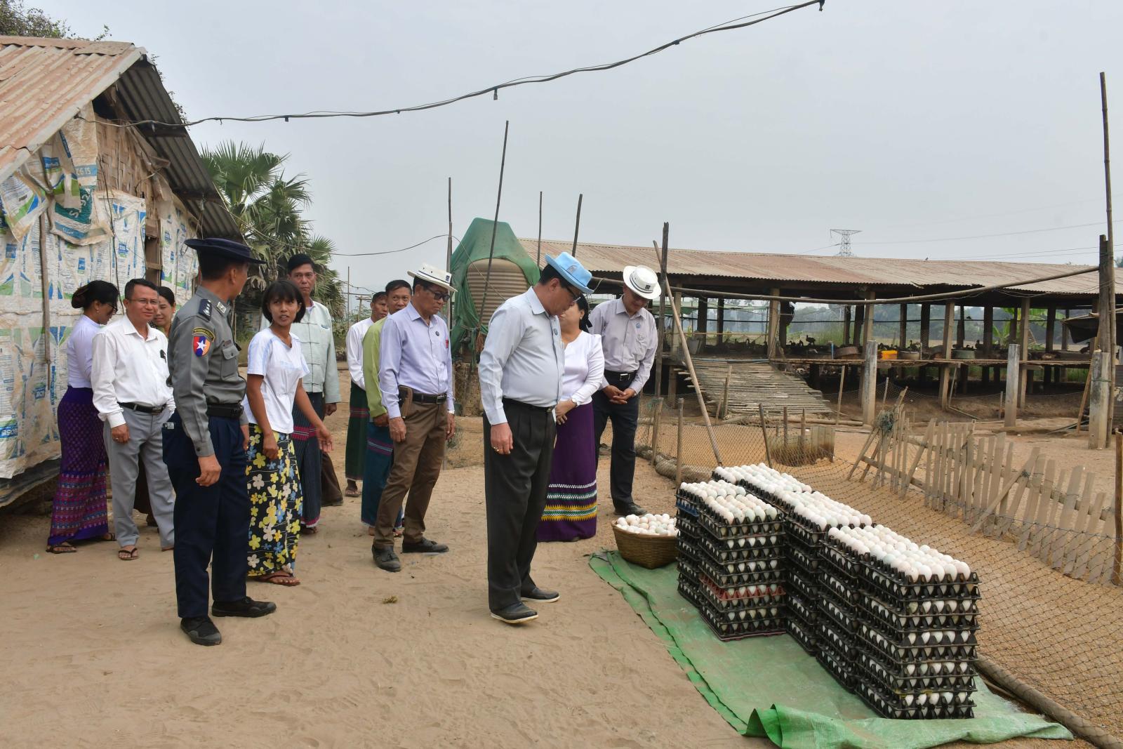 ထို့နောက် ပြည်နယ်ဝန်ကြီးချုပ်နှင့်တာဝန်ရှိသူများသည် ဘားအံမြို့နယ် ကော့လှိုက်ကျေးရွာရှိ တောင်သူဒေါ်အိဖြူစင်ထွန်း၏ ဥစားဘဲကောင်ရေ ၂၀၀၀ မွေးမြူရေးခြံအား ကြည့်ရှုအားပေးပြီး ဥအားဆေးနှင့်ခြံဖြန်းပိုးသတ်ဆေးများကို အခမဲ့ပေးအပ်ချီးမြှင့်သည်။