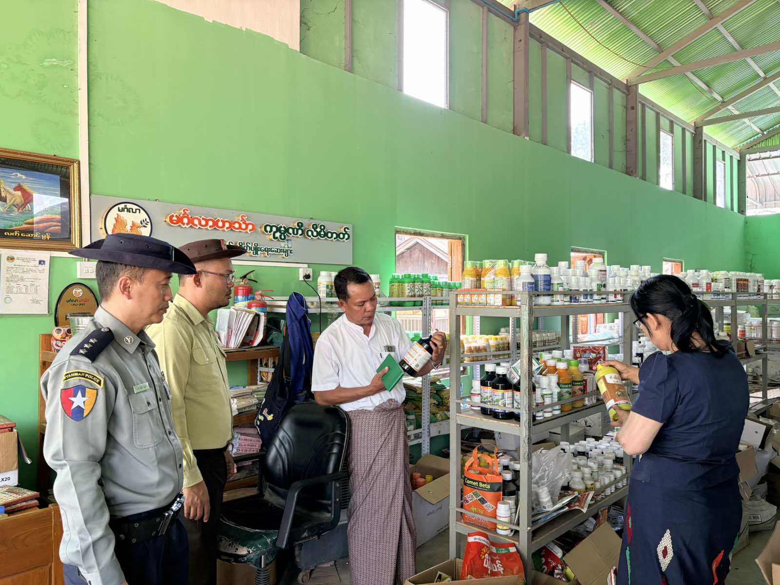 ထိုသို့ ကွင်းဆင်းစစ်ဆေးရာတွင် ဒုတိယမြို့နယ်အုပ်ချုပ်ရေးမှူး ဦးစောပြည့်စုံ၊ စိုက်ပျိုးရေးဦးစီးဌာန မြို့နယ်ဦးစီးမှူး ဦးအောင်ဝင်းနှင့် ကော်မတီဝင်များက မြို့နယ်အတွင်း ဖွင့်လှစ်ရောင်းချလျက်ရှိသည့် စိုက်ပျိုးရေးလုပ်ငန်းသုံးပစ္စည်းအရောင်းဆိုင်များ၌ စိုက်ပျိုးရေးထုတ်ကုန်များတွင် အသုံးပြုလျက်ရှိသည့် စျေးကွက်တွင် အသုံးမပြုရန် တားမြစ်ထားသော ပိုးသတ်ဆေး အတုအပများနှင့် တရားမဝင်ပိုးသတ်ဆေးများမရှိစေရန် ဆိုင်တင်ရောင်းချခြင်းများ လုံးဝမပြုလုပ်စေရန်၊ လိုက်နာခြင်းမရှိသည်ကို စစ်ဆေးတွေ့ရှိပါက ပိုးသတ်ဆေးဥပဒေအရ အရေးယူဆောင်ရွက်သွားမည်ဖြစ်ကြောင်း၊ စားသုံးသူပြည်သူများ ဘေးကင်းလုံခြုံစေရေးနှင့် ပြည်ပသို့ တင်ပို့နေသော စိုက်ပျိုးရေးထုတ်ကုန်များ ပိုးသတ်ဆေးဓာတ်ကြွင်းကင်းစင်စေရေးအတွက် ရည်ရွယ်၍ ဆောင်ရွက်ရခြင်းဖြစ်ပြီး ပိုးသတ်ဆေးဥပဒေ၊ နည်းဥပဒေများအား အသိပညာပေး ရှင်းလင်းဆွေးနွေးခဲ့ကြောင်း သိရှိရသည်။