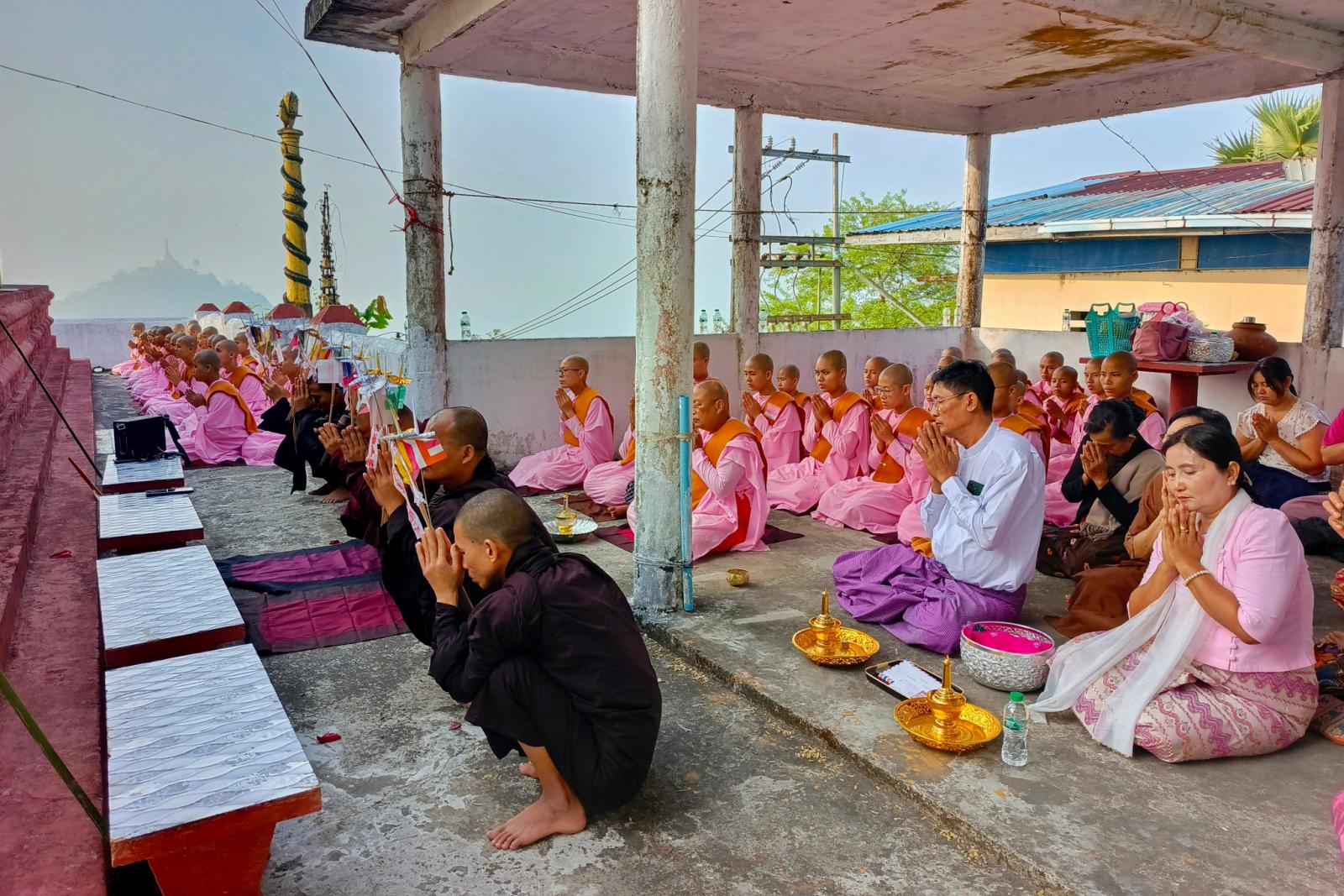 ဦးစွာ သထုံမြို့၊ ရွှေတောင်ကျောင်းတိုက်ဆရာတော် ဘန္ဒန္တသုစရိတ ဦးဆောင်သော သံဃာတော်အရှင်သူမြတ်တို့က စေတီတော်မြတ်ကြီးအား ဗုဒ္ဓါဘိသေက အနေကဇာတင်ပူဇော်ခဲ့ကြပြီး ပဉ္စဂီရိ ချမ်းမြေ့စည် လောကီလောကုတ္တရာ ပညာသင်ကြားရေး သီလရှင်ကျောင်းမှ သီလရှင်ဆရာကြီး၊ဆရာလေးများနှင့် အလှူရှင်တို့က ကြာသင်္ကန်းတော်အား စီတန်းကိုင်ဆောင်ကာ စေတီတော်မြတ်ကြီးအား လက်ယာရစ် သုံးကြိမ်လှည်လည်ပူဇော်ကြပြီး စေတီ‌တော်မြတ်ကြီးအထက်ဆီသို့ တင်လှူပူဇော်ကြသည်။