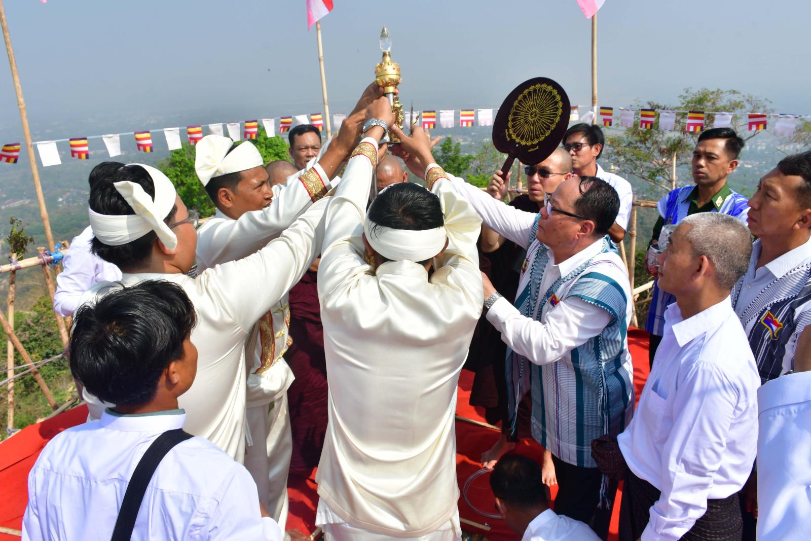 ထို့နောက် ရွှေထီးတော်တင်လှူပူဇော်သည့်အခမ်းအနားကို ဆက်လက်ကျင်းပရာ ပြည်နယ်ဝန်ကြီးချုပ် အမှူးပြုသော ဘုရားဒါယိကာများက စိန်ဖူးတော်နှင့် စိန်ဖူးတော်ဘုံအဆင့်များဖြင့် စေတီတော်အား လက်ယာရစ်(၃)ပတ်လှည့်လည်ပူဇော်၍ မင်္ဂလာအချိန်တွင် ရွှေထီးတော်ဘုံအဆင့်ဆင့်တို့ကို သတ်မှတ်ချိန်အသီးသီးတွင် လက်ဆင့်ကမ်းတင်လှူပူဇော်ကြပြီး ပြည်နယ်ဝန်ကြီးချုပ်က စိန်ဖူးတော်အထွဋ်ကို တင်လှူပူဇော်၍ အမွှေးနံသာရည်များ ပက်ဖျန်းပေးကြကာ စိတံမေအောင်ပြီ(၃)ကြိမ်ရွတ်ဆိုကြွေးကြော်၍ ရတနာရွှေမိုး ငွေမိုးများ ရွာသွန်းဖြိုးခဲ့ကြကြောင်း သိရသည်။