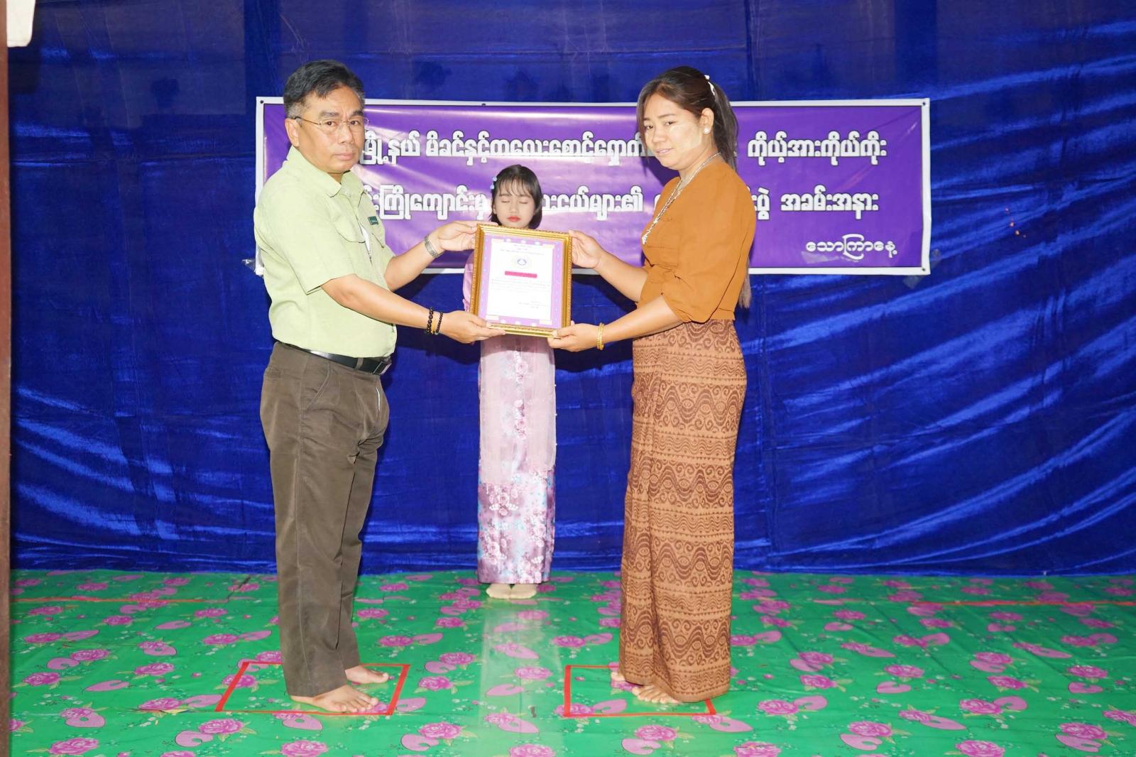 အခမ်းအနားတွင် မြို့နယ်စီမံခန့်ခွဲရေးနှင့်အုပ်ချုပ်ရေးကော်မတီဥက္ကဋ္ဌ ဦးဇော်အောင်လေးက အမှာစကားပြောကြားပြီး မိခင်နှင့်ကလေးစောင့်ရှောက်အသင်းမှ အလှူရှင်များအား ဂုဏ်ပြုမှတ်တမ်းလွှာများ ပေးအပ်သည်။ ယင်းနောက် လူမှုဝန်ထမ်းဦးစီးဌာနမှ ဦးစီးမှူးနှင့် တာဝန်ရှိသူများက ကျောင်းသား၊ ကျောင်းသူများအား ကျောင်းဆင်းလက်မှတ်များ ပေးအပ်ခဲ့ကြကြောင်း သိရသည်။