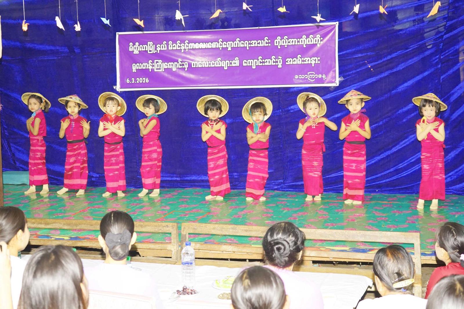 မန္တလေးတိုင်းဒေသကြီး၊ မိတ္ထီလာမြို့နယ်၌ မိခင်နှင့်ကလေးစောင့်ရှောက်အသင်း ကိုယ့်အားကိုယ်ကိုး မူလတန်းကြိုကျောင်း ကျောင်းဆင်းပွဲအခမ်းအနားကို မတ် ၆ ရက် နံနက် ၉ နာရီခွဲက ပေါက်ချောင်းရပ်ကွက်ရှိ မူလတန်းကြိုကျောင်းတွင် ကျင်းပသည်။