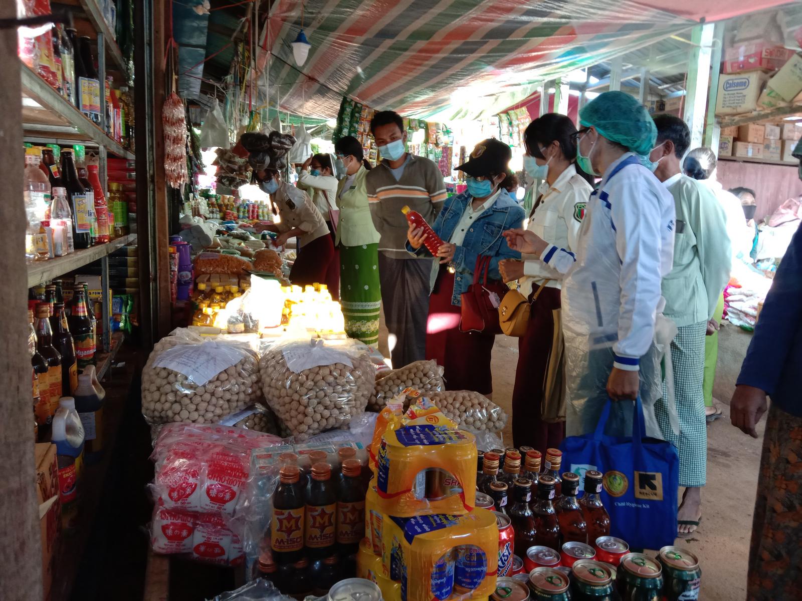 ယင်းနောက် မြို့မဈေးတွင်း ရောင်းချလျက်ရှိသော စားသောက်ကုန်ပစ္စည်းများတွင် တားမြစ်ဆိုးဆေး ပစ္စည်းများ၊ တားမြစ်တာရှည်ခံ ပစ္စည်းများ ပါဝင်မှုမရှိစေရေးအတွက် စားသောက်ကုန်ပစ္စည်း(၁၉)မျိုး နမူနာ ကောက်ယူခြင်း၊ ရွေ့လျားဓါတ်ခွဲယာဉ်ဖြင့် စစ်ဆေးမှု ဆောင်ရွက် ခြင်း၊ တားမြစ်ပစ္စည်းများ ပါဝင် သည့် အလှကုန်ပစ္စည်းများ ရောင်းချခြင်းရှိ/မရှိ စစ်ဆေးခြင်းနှင့် ဆေးဝါးများရောင်းချရာတွင် သက်တမ်းလွန် ဆေးဝါးများ မဖြစ်စေရေး၊ ကုန်ပစ္စည်းအညွှန်းအမှတ်အသားတံဆိပ်များ ပြည့်စုံမှန်ကန်မှုရှိစေရေး အတွက် ကွင်းဆင်း စစ်ဆေး ပြီး တားမြစ် ဆိုးဆေးပါဝင်သော စားသောက်ကုန်တစ်မျိုးနှင့် သက်တမ်းလွန် ဆေးဝါး တစ်မျိုးကို မီးရှို့ဖျက်စီးခဲ့ကြကြောင်း သိရသည်။