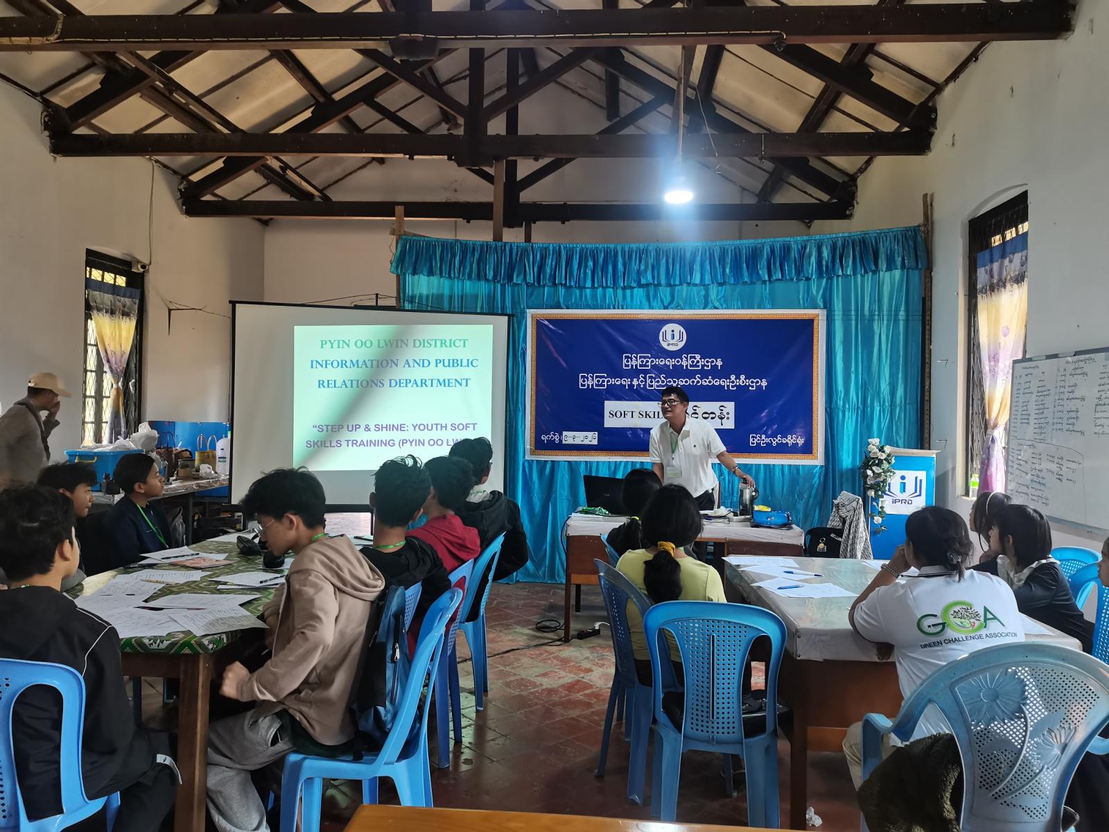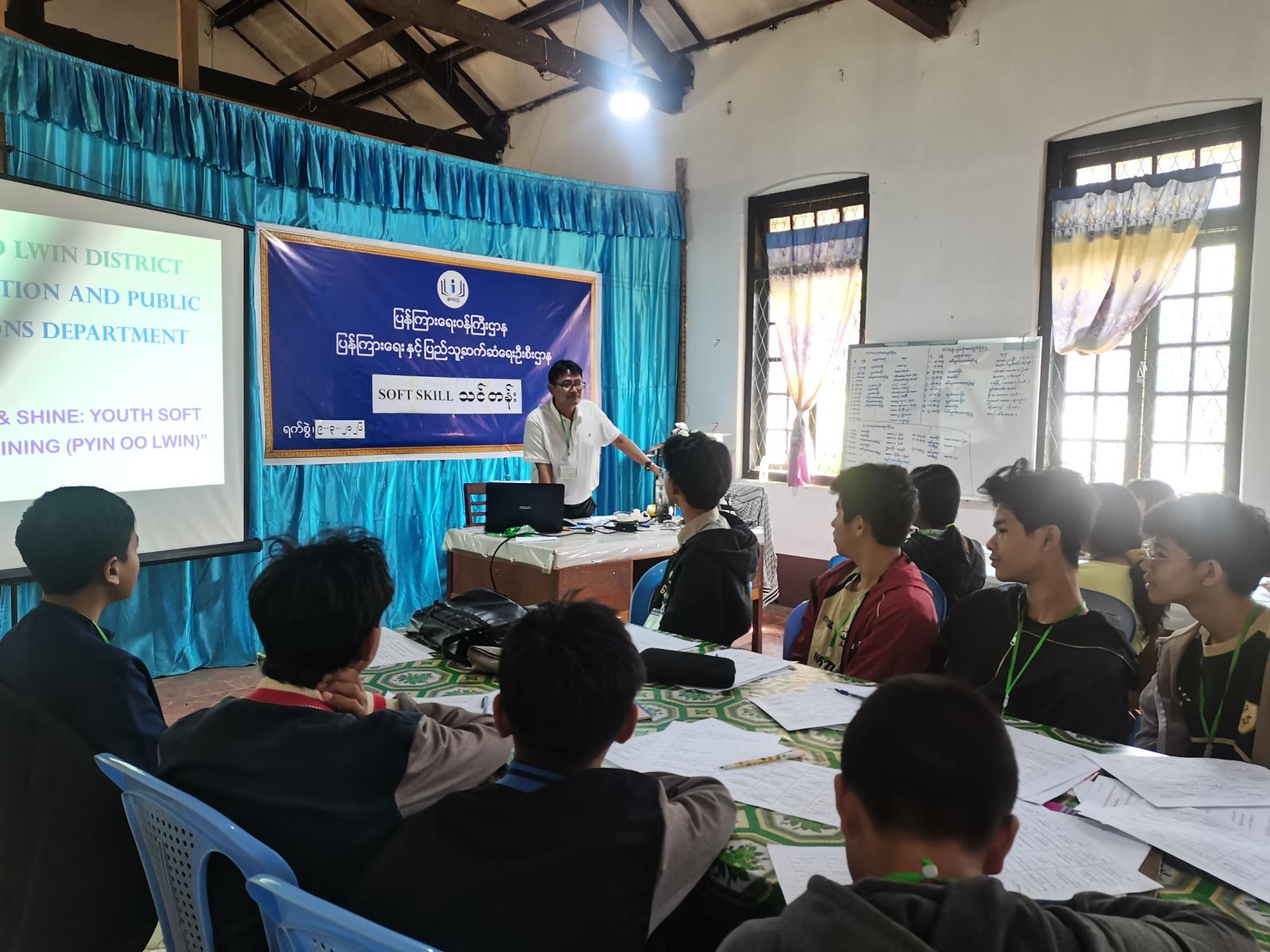 နွေရာသီကျောင်းပိတ်ရက်များအတွင်း ကျောင်းသားကျောင်းသူများ အချိန်ကိုအကျိုးရှိစွာ အသုံးချတတ်စေရန်ရည်ရွယ်၍ မန္တလေးတိုင်းဒေသကြီး ပြင်ဦးလွင်ခရိုင် ပြန်ကြားရေးနှင့်ပြည်သူ့ဆက်ဆံရေးဦးစီးဌာန လူထုအခြေပြုဗဟိုဌာန (Community Centre) တွင် Soft Skill သင်တန်းဖွင့်ပွဲအခမ်းအနားကို ယနေ့နံနက်၉နာရီက ကျင်းပရာ ပြန်ကြားရေးနှင့်ပြည်သူ့ဆက်ဆံရေးဦးစီးဌာနမှ လက်ထောက်ညွှန်ကြားရေးမှူး ဦးကျော်မင်းဦးက သင်တန်းဖွင့်လှစ်ရခြင်း ရည်ရွယ်ချက်အား ရှင်းလင်းပြောကြားသည်။