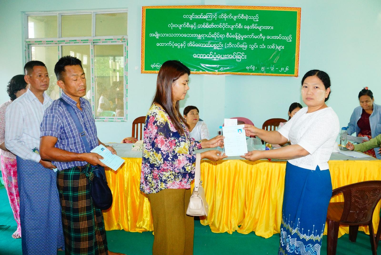 မန္တလေးတိုင်းဒေသကြီး မဟာအောင်မြေခရိုင် ချမ်းမြသာစည်မြို့နယ်၌ အမျိုးသားသဘာဝဘေးအန္တရာယ်ဆိုင်ရာစီမံခန့်ခွဲမှုကော်မတီမှ ငလျင်ဒဏ်ကြောင့် လုံးဝပျက်စီးနှင့် တစ်စိတ်တစ်ပိုင်းပျက်စီး နေအိမ်များအား ပြုပြင်နိုင်ရန် ငွေနှင့် အိမ်ဆောက်ပစ္စည်း(ဘိလပ်မြေ၊ သွပ်၊ သံ၊ သစ်)များပေးအပ်ခြင်းကို ယနေ့နံနက်ပိုင်းက မြို့နယ်အထွေထွေအုပ်ချုပ်ရေးဦးစီးဌာန အစည်းအဝေးခန်းမတွင် ကျင်းပသည်။