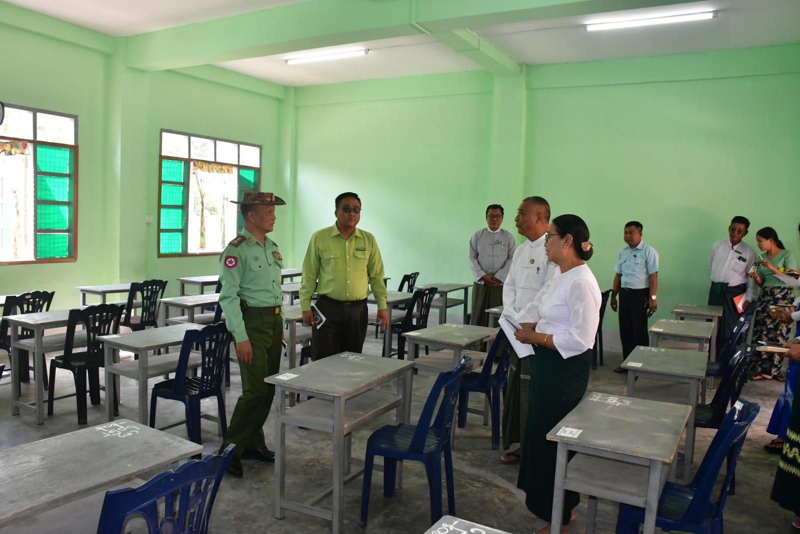 ဦးစွာ နေပြည်တော်ကောင်စီဝင် ဗိုလ်မှူးကြီရဲမိုးသည် ပျဉ်းမနားမြို့၊ အမှတ်(၅)၊ အခြေခံပညာအထက်တန်းကျောင်းစာစစ်ဌာန၌ ကျောင်းသား/ကျောင်းသူများ အဆင်ပြေချောမွေ့စွာ ဖြေဆိုနိုင်ရေး အတွက် စာဖြေခန်းများပြင်ဆင်ထားရှိမှုကို ကြည့်ရှုစစ်ဆေးကြသည်။