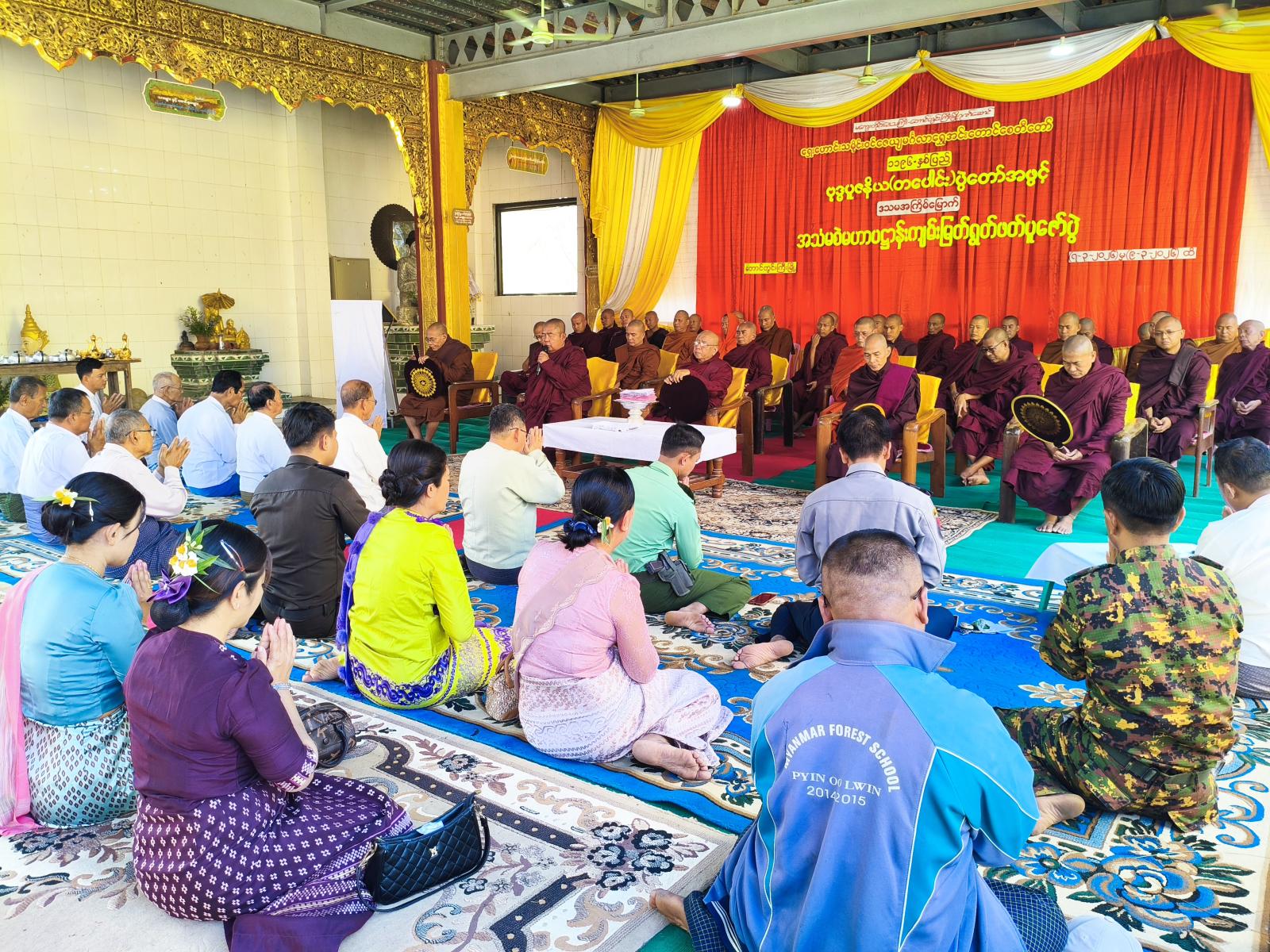 အခမ်းအနားတွင် “နမောတဿ”သုံးကြိမ်ရွတ်ဆို ဘုရားကန်တော့၍ မြို့နယ်သံဃနာယကအဖွဲ့ဥက္ကဋ္ဌဆရာတော်၊ သာယာအေးကျောင်းတိုက်ကြီး၏ ပဓာနနာယက၊ မဟာသဒ္ဓမ္မဇောတိကဓဇ၊ ဘဒ္ဒန္တစာရိတဆရာတော်အရှင်သူမြတ်ထံမှ ငါးပါးသီလခံယူဆောက်တည်ပြီး ဆရာတော်သံဃာတော်များ ရွတ်ပွားချီးမြှင့်တော်မူသော ပရိတ်တရားတော်များ နာယူခြင်းနှင့် လှူဖွယ်ဝတ္ထုများ ဆပ်ကပ်လှူဒါန်းခဲ့သည်။