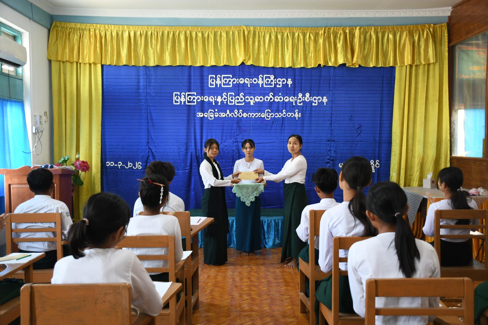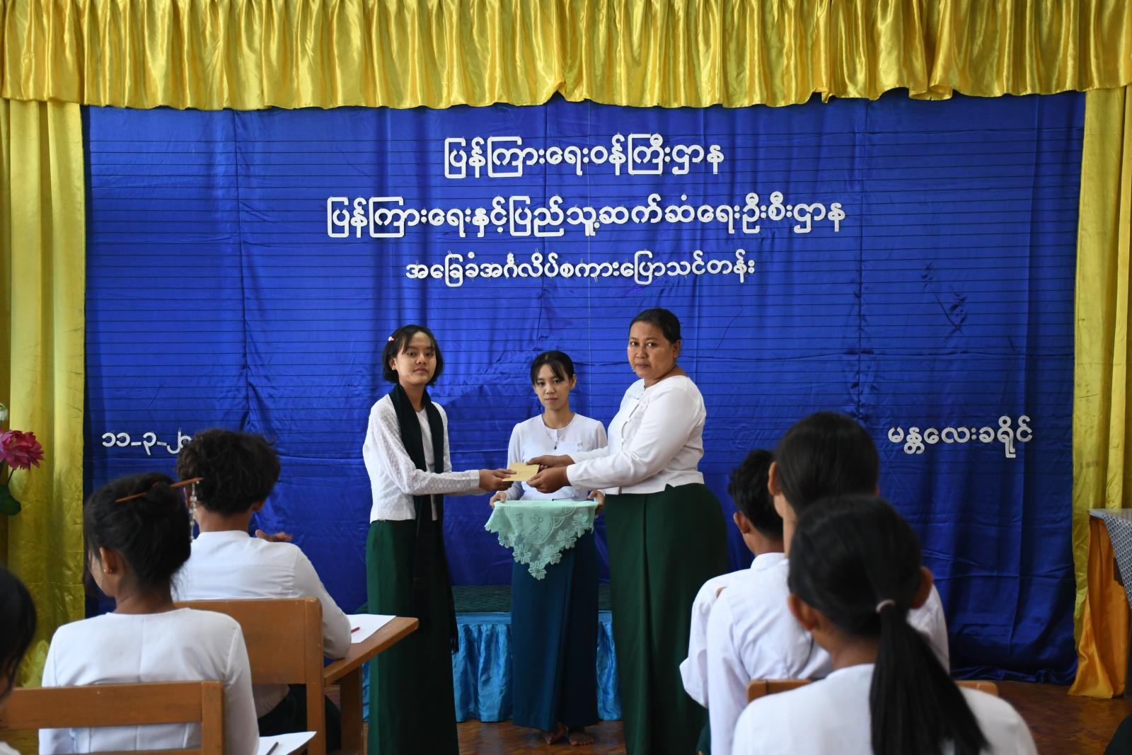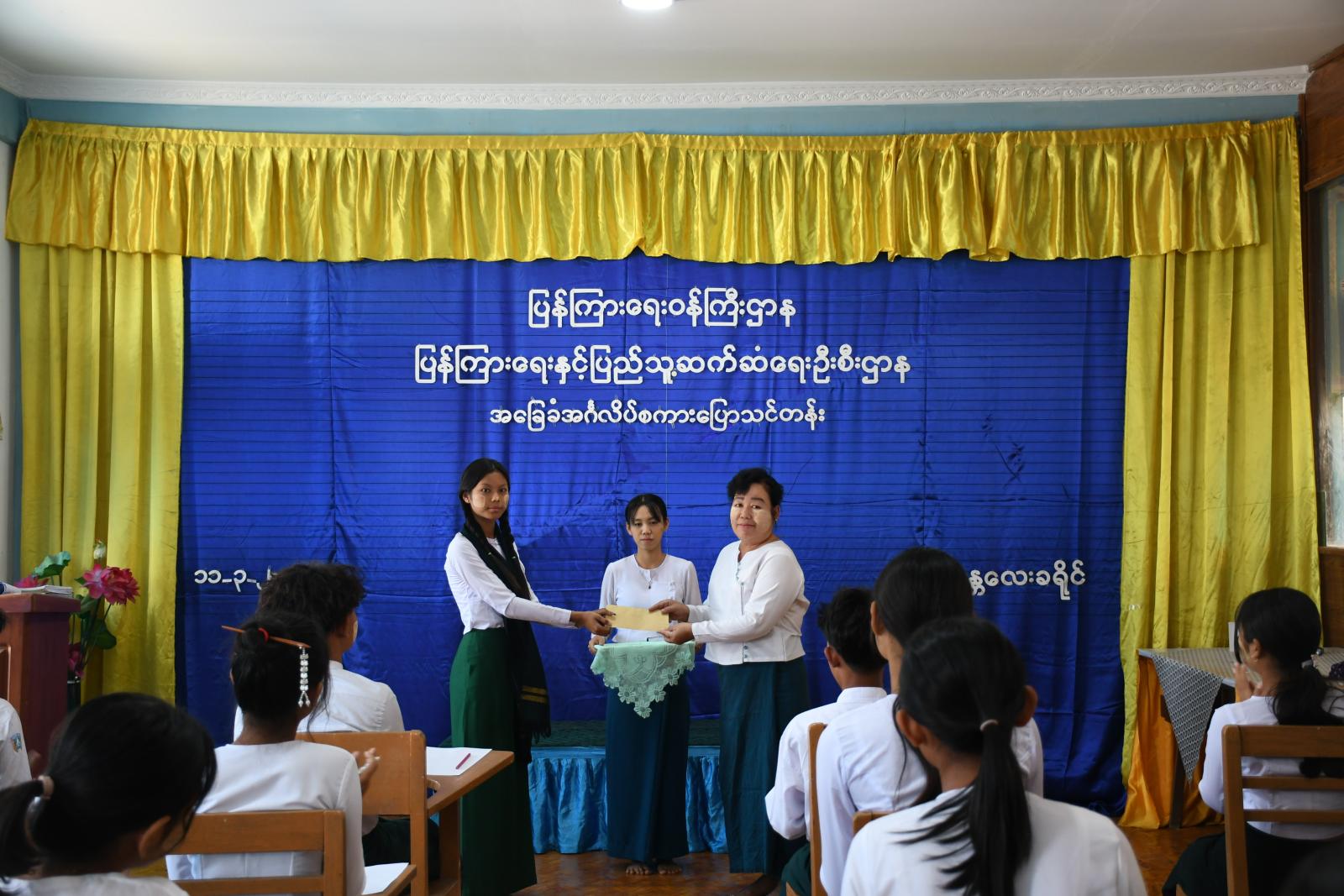 ဦးစွာ ခရိုင်ပြန်ကြားရေးနှင့်ပြည်သူ့ဆက်ဆံရေးဦးစီးဌာန လက်ထောက်ညွှန်ကြားရေးမှူးဒေါ်မြင့်မြင့်သန်းက သင်တန်းဆင်းအမှာစကားပြောကြားသည်။ ဆက်လက်ပြီး အခြေခံအင်္ဂလိပ်စကားပြောသင်တန်းတွင် ပါဝင်ယှဉ်ပြိုင်ခဲ့သည့် ပထမဆု၊ ဒုတိယဆု၊ တတိယဆုများရရှိသည့် ကျောင်းသူလေးများအား ခရိုင်ပြန်ကြားရေးနှင့် ပြည်သူ့ဆက်ဆံရေးဦးစီးဌာနမှ လက်ထောက်ညွှန်ကြားရေးမှူး ဒေါ်မြင့်မြင့်သန်းနှင့် ဦးစီးအရာရှိ ဒေါ်ခင်စောလွင်၊ ပြည်ကြီးတံခွန်မြို့နယ်၊ မူလွန်(၂၀)ကျောင်းမှ ကျောင်းအုပ် ဆရာမကြီး ဒေါ်သန်းသန်းနွယ်နှင့် သင်တန်းနည်းပြ ဆရာမဒေါ်သွယ်သွယ်နှင်းတို့က ဆုများပေးအပ်ချီးမြှင့်ခဲ့ရာ ယင်းသင်တန်းကို ကျောင်းသား/ကျောင်းသူ ၁၅ ဦး တက်ရောက်သည်။