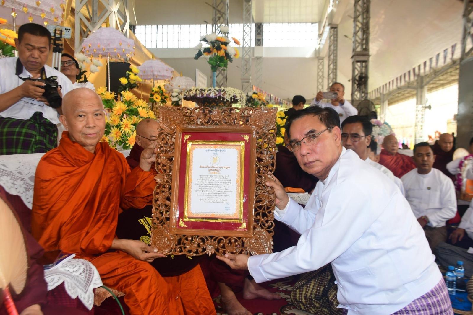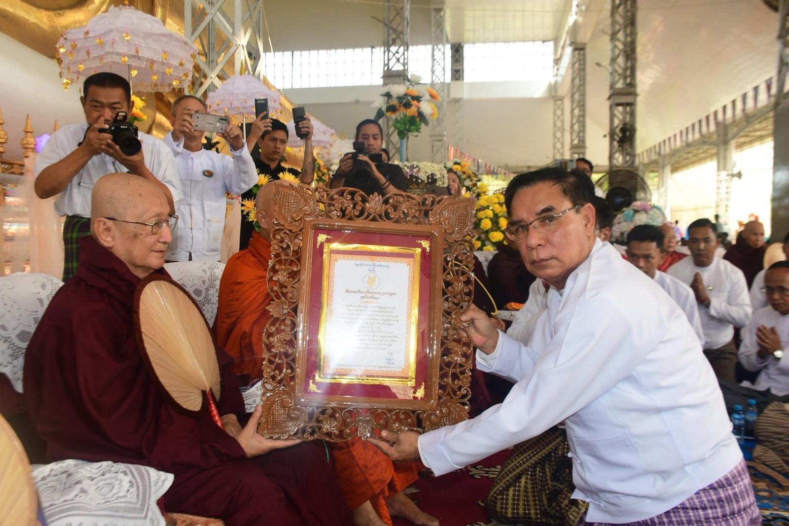 ထို့နောက် ပဲခူးတိုင်းဒေသကြီးအစိုးရအဖွဲ့ဝန်ကြီးချုပ် ဦးမျိုးဆွေဝင်းက ပဲခူးမြို့၊ ရွှေသာလျောင်း ဘုရားဗုဒ္ဓရုပ်ပွားတော်မြတ်ကြီး၌ ပါဒစေတီတော်မြတ်ကြီးတည်ထားပူဇော်ရာတွင် ပိဋကတ်တော် ကျမ်းဂန်တော်များနှင့် သင့်လျော်ညီညွှတ်စွာ တည်ထားပူဇော်နိုင်ရေး လမ်းညွှန်ဩဝါဒပေး၍ ဦးဆောင်ပဓာန ကမကထပြု ချီးမြှင့်တော်မူခဲ့ကြသည့် လှရတနာဆရာတော်ကြီးနှင့် ကြခတ်ဝိုင်းဆရာတော်ကြီးတို့အား ဂုဏပူဇာမှတ်တမ်းလွှာများ ဆက်ကပ်ပူဇော်ပေးခဲ့သည်။ ၎င်းနောက် ပဲခူးတိုင်းဒေသကြီး ဝန်ကြီးချုပ်နှင့်ဇနီး၊ တာဝန်ရှိသူများနှင့် အလှူရှင်များက ကြွရောက်လာသည့် ဆရာတော်ကြီးများထံ လှူဖွယ်ဝတ္တုပစ္စည်းများ ဆက်ကပ်လှူဒါန်းခဲ့ကြသည်။