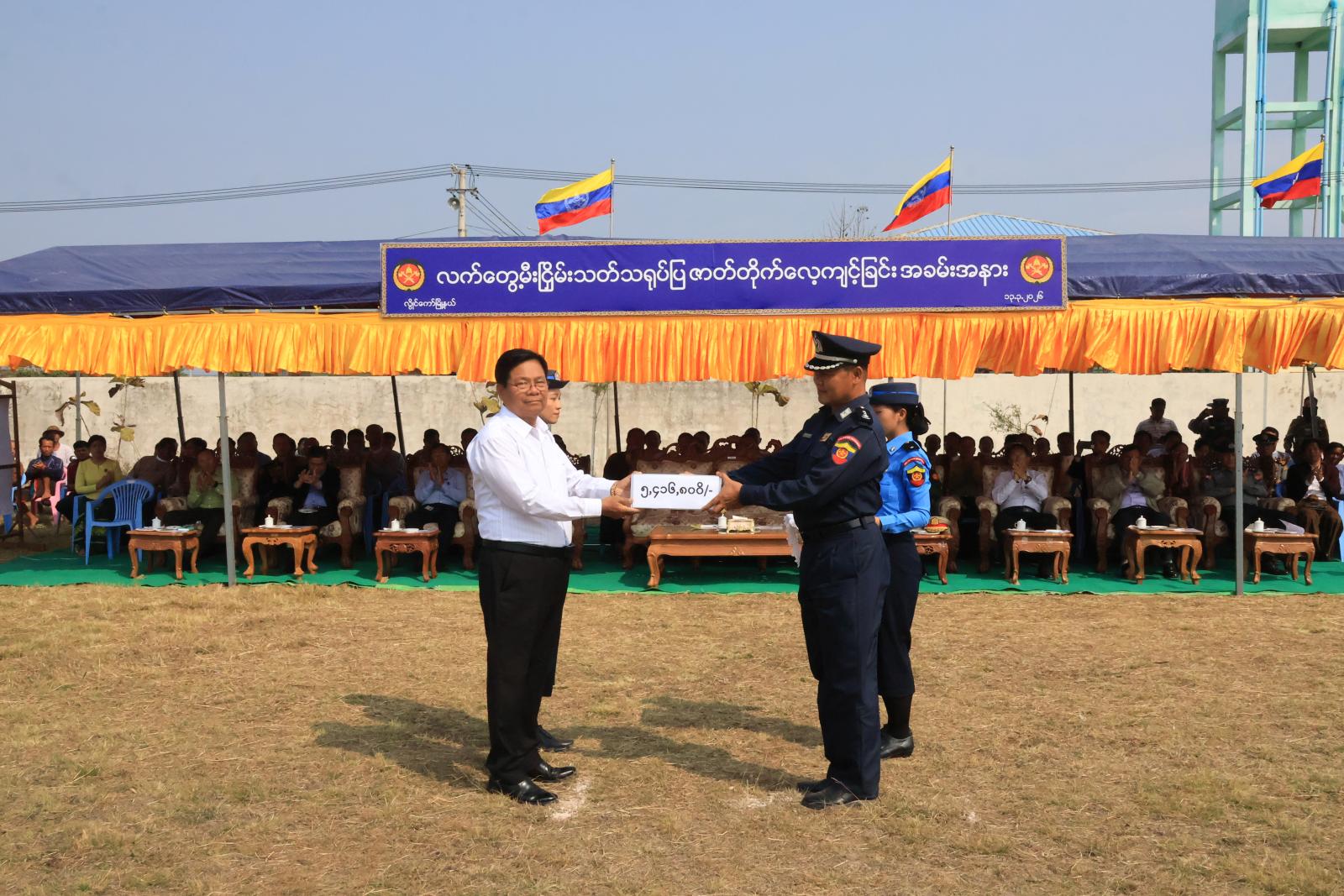ထို့နောက် ပြည်နယ်ဝန်ကြီးချုပ်က လမ်းညွှန်အမှာစကားပြောကြားရာတွင် မီးသတ်ဝန်ထမ်းများသည် ရဲစွမ်းသတ္တိအပြည့်နှင့် ပြည်သူအပေါ်ဝန်ဆောင်မှုပေးနေသည့် ပြည်သူ့ဝန်ထမ်းများဖြစ်ကြောင်း၊ မီးဘေးသဘာဝဘေးများတွင် မိမိအသက်ကို ပဓာနမထားပဲ စွန့်လွှတ်စွန့်စားကြသူများဖြစ်ကြောင်း၊ ပြည်သူများ၏အသက်အိုးအိမ်စည်းစိမ်ကို ကာကွယ်စောင့်ရှောက်ရန်အတွက် သင့်(၄) သင့်အနေအထားနှင့် အမြဲရှိနေရန်လိုအပ်ကြောင်း၊ မိမိတို့၏စွမ်းရည်ကို အစဉ်အမြဲမြှင့်တင်ဆောင်ရွက်ရန်နှင့် မီးဘေး၊ သဘာဝဘေးစသည့် ဘေးအန္တရာယ်တစ်စုံတစ်ရာပေါ်ပေါက်လာပါက စွမ်းစွမ်းတမံဆောင်ရွက်နိုင်ရန်အတွက် ကြိုတင်ပြင်ဆင်ဆောင်ရွက်ထားကြရန်နှင့် ပြည်သူများအနေဖြင့်လည်း ယခုပညာပေးသရုပ်ပြမှုများကို မှတ်သားပြီး မီးဘေးအန္တရာယ် ကြိုတင်ကာကွယ်ရေးလုပ်ငန်းများကို လိုက်နာဆောင်ရွက်ကြရန်လိုကြောင်းစသည်ဖြင့် ပြောကြားသည်။ ထို့နောက် ပြည်နယ်ဝန်ကြီးချုပ်က ဂုဏ်ပြုချီးမြှင့်ငွေပေးအပ်ရာ ကယားပြည်နယ် မီးသတ်ဦးစီးမှူးရုံး ပြည်နယ်မှူးက လက်ခံရယူခဲ့ သည်။