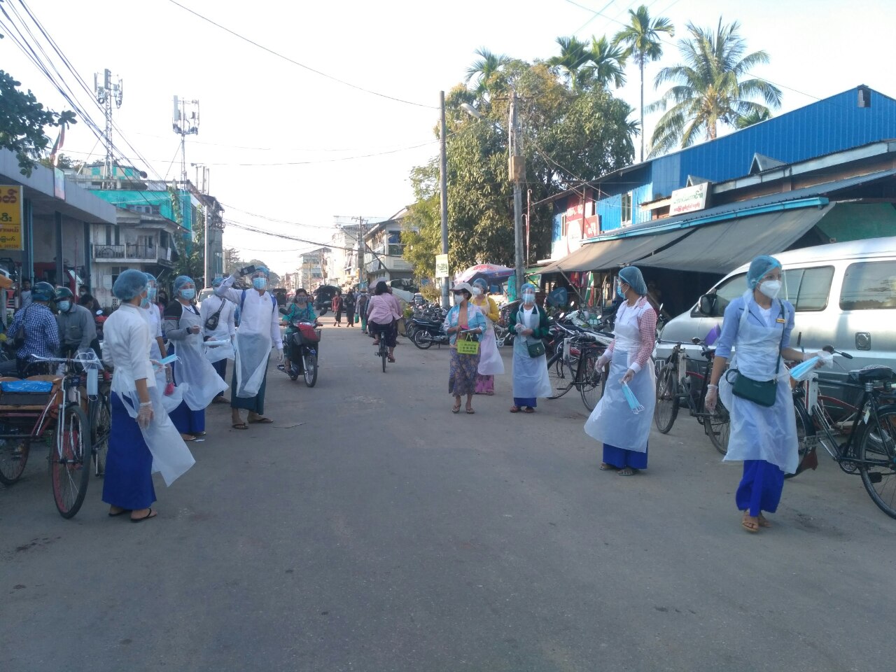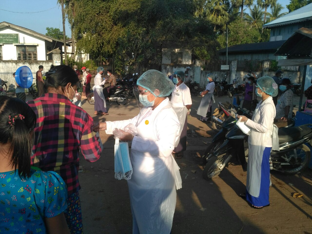 အဆိုပါ ကိုဗစ်-၁၉ ရောဂါ ကြိုတင်ကာကွယ်ထိန်းချုပ်သည့် ကာလအတွင်း နေအိမ်ပြင်ပ ထွက်ခွာပါက နှာခေါင်းစည်း(Mask)များ တပ်ဆင်ပြီး သွားလာရန် အသိပညာပေး နှိုးဆော်ခြင်း နှင့် (Mask)များ အခမဲ့ဖြန့်ဝေခြင်းကို ခရိုင်ပြည်သူ့ကျန်းမာရေးဦးစီးဌာနမှ ဦးဆောင်၍ ဝန်ထမ်းများ၊ ကျန်းမာရေးကြီးကြပ်အသင်းက ပြည်သူများအနေဖြင့် ကြိုတင်ကာကွယ်ရေးအား ပေါ့ဆမှုမဖြစ်စေရန် အသိပညာပေးခြင်းကို မြို့မစျေး၊ အခွန်လွတ်စျေး၊ ဘုရားလမ်းနှင့် တေဇလမ်းထောင့် စသည့်လူအများ စည်ကားရာနေရာများတွင် အသိပညာပေး ဆောင်ရွက်ခဲ့ ကြောင်း ခရိုင်ပြည်သူ့ကျန်းမာရေးဦးစီးဌာနမှ သိရသည်။
