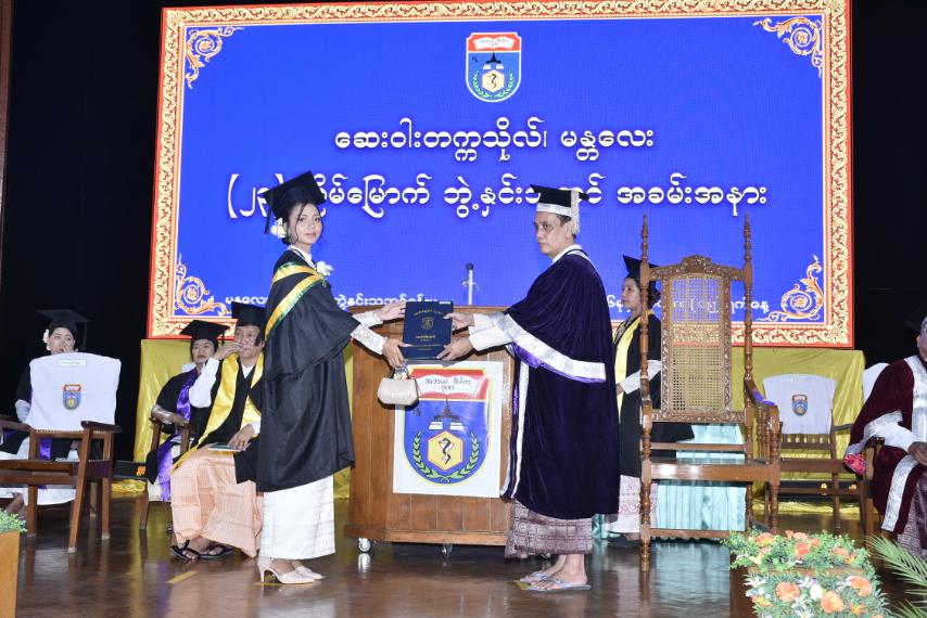 ဦးစွာ ဆေးဝါးတက္ကသိုလ် မန္တလေး၏ ပါမောက္ခချုပ်(ပူးတွဲတာဝန်) ပါမောက္ခဒေါက်တာ မျိုးသက်တင်၊ ဒုတိယပါမောက္ခချုပ် ပါမောက္ခဒေါက်တာကျော်စိုး၊ ပညာရေးအဖွဲ့ဝင်များနှင့် စီမံခန့်ခွဲရေးအဖွဲ့ဝင်များက ဘွဲ့နှင်းသဘင်စင်မြင့်၌နေရာယူကြပြီးဘွဲ့ရကျောင်းသား၊ ကျောင်းသူများက အဓိဠာန်ပြု ကတိသစ္စာရွတ်ဆိုကြသည်။
