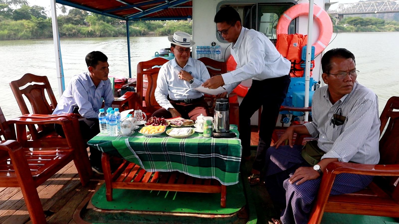 ကရင်ပြည်နယ်အစိုးရအဖွဲ့ ပြည်နယ်လမ်းပန်းဆက်သွယ်ရေးဝန်ကြီး ဦးညီညီဇော်က ရေအရင်းမြစ်နှင့်မြစ်ချောင်းများ ဖွံ့ဖြိုးတိုးတက်ရေးဦးစီးဌာန(ရုံးချုပ်)သောင်တူးဌာနခွဲမှ တာဝန်ယူဆောင်ရွက်လျက်ရှိသည့် ဘားအံမြို့ ရေကြီးရေလျှံမှု လျော့နည်းစေရေးအတွက် တရုတ်လှကျွန်းနှင့် ကော့ဂွန်းကြား သံလွင်မြစ်သောင်တူးခြင်းလုပ်ငန်း ဆောင်ရွက်နေမှုအခြေအနေများအား ယမန်နေ့ညနေပိုင်းအချိန်က ရေယာဉ်ဖြင့် သွားရောက်ကာ ကွင်းဆင်းကြည့်ရှုစစ်ဆေးခဲ့ရာ ပြည်နယ်ရေအရင်းမြစ်နှင့် မြစ်ချောင်းများဖွံ့ဖြိုးတိုးတက်ရေးဦးစီးဌာန ပြည်နယ်ဦးစီးမှူး ဦးကျော်စိုးမှ လုပ်ငန်းအကောင် အထည်ဖော်ဆောင်ရွက်နေမှုအခြေအနေများ အားရှင်းလင်းတင်ပြသည်။