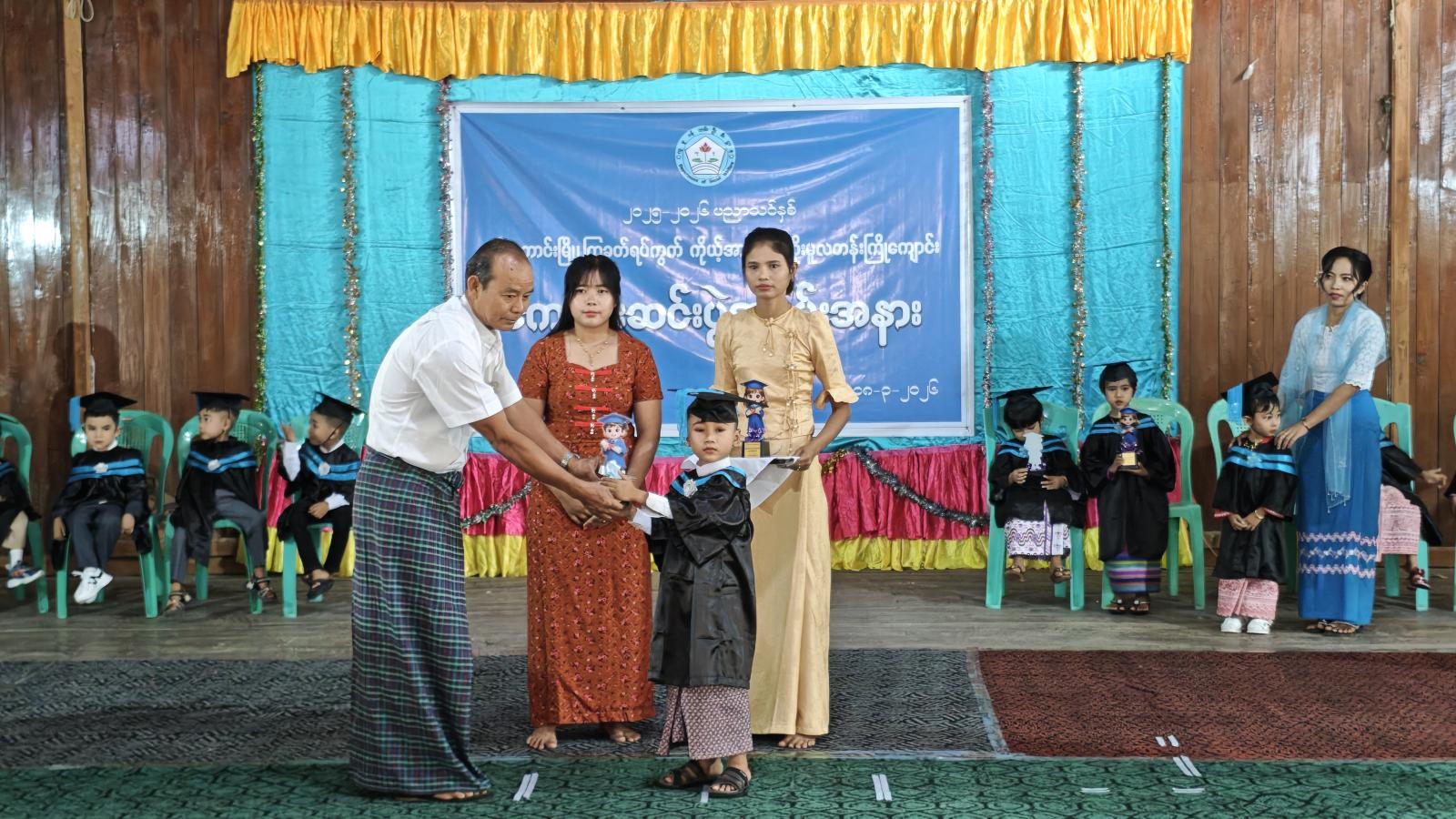 ဆက်လက်၍ ကိုယ့်အားကိုယ်ကိုးမူလတန်းကြိုကျောင်းတာဝန်ခံ ဒေါ်အေးမြနွယ်က မူလတန်းကြိုကျောင်း၏ သင်ကြားရေးနှင့်ပတ်သက်၍ ရှင်းလင်းပြောကြားပြီးနောက် ၂၀၂၅-၂၀၂၆ ပညာသင်နှစ်အတွင်း ထူးချွန်သော ကလေးငယ်များအား မြို့နယ်လူမှုဝန်ထမ်းဦးစီးဌာန၊ ဒုတိယဦးစီးမှူး ဒေါ်လွင်လွင်ခိုင်၊ ကိုယ့်အားကိုယ်ကိုးမူလတန်းကြိုကျောင်းတာဝန်ခံ ဒေါ်အေးမြနွယ်၊ ကြခတ်ရပ်ကွက်အုပ်ချုပ်ရေးမှူး ဦးခင်မောင်ဝင်းနှင့် တာဝန်ရှိသူများက ဆုများအသီးသီး ပေးအပ်ချီးမြှင့်ကြသည်။ ယင်းနောက် မူလတန်းကြို ကျောင်းသား၊ ကျောင်းသူလေးများက တေးသံသာများဖြင့် ကပြဖျော်ဖြေကြရာ တက်ရောက်လာကြသော ဌာနဆိုင်ရာတာဝန်ရှိသူများ၊ ကျောင်းသားမိဘများနှင့် ရပ်မိရပ်ဖများက ကြည့်ရှုအားပေးခဲ့ကြသည်။