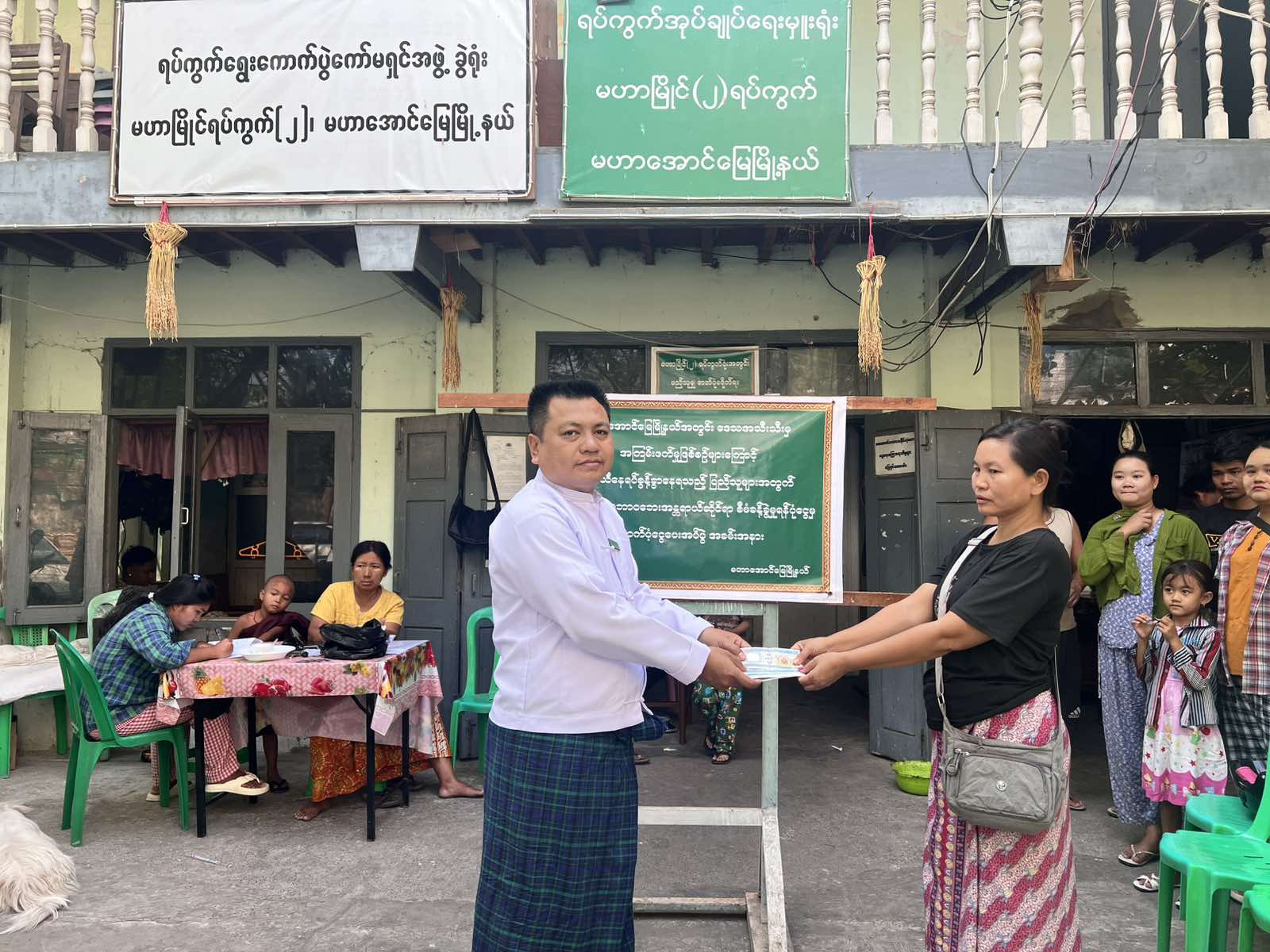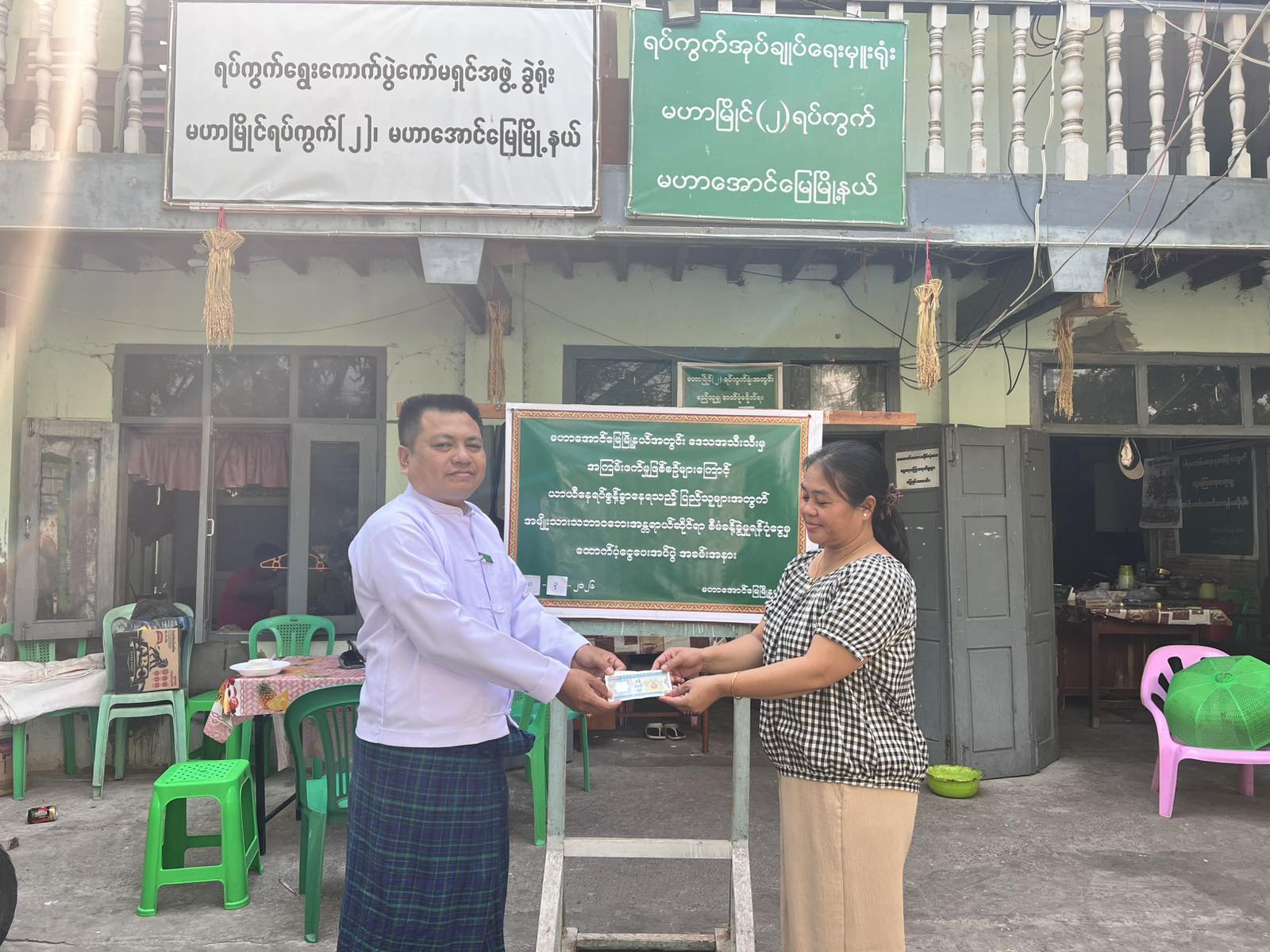 အဆိုပါပေးအပ်မှုအား မဟာအောင်မြေမြို့နယ်၊ မဟာမြိုင် (၂) ရပ်ကွက် အုပ်ချုပ်ရေးမှူးနှင့် အထွေထွေအုပ်ချုပ်ရေးမှူးဦးစီးဌာနမှ တာတန်ရှိသူများက လာရောက်ပေးအပ်၍ အောက်တိုဘာ၊ နိုဝင်ဘာ၊ ဒီဇင်ဘာ သုံးလစာ တစ်လလျှင် နှစ်သောင်းနှုန်းဖြင့် အကြောင်းအမျိုးမျိုးကြောင့် ယာယီနေရပ်စွန့်ခွာပြည်သူ ၅၀ အား ပေးအပ်ခဲ့ကြောင်းသိရသည်။