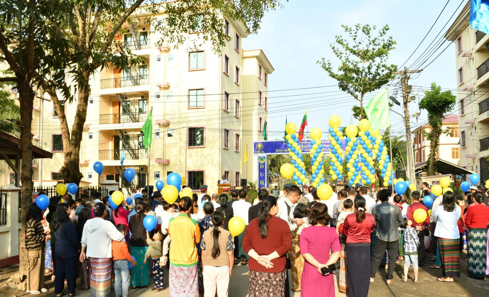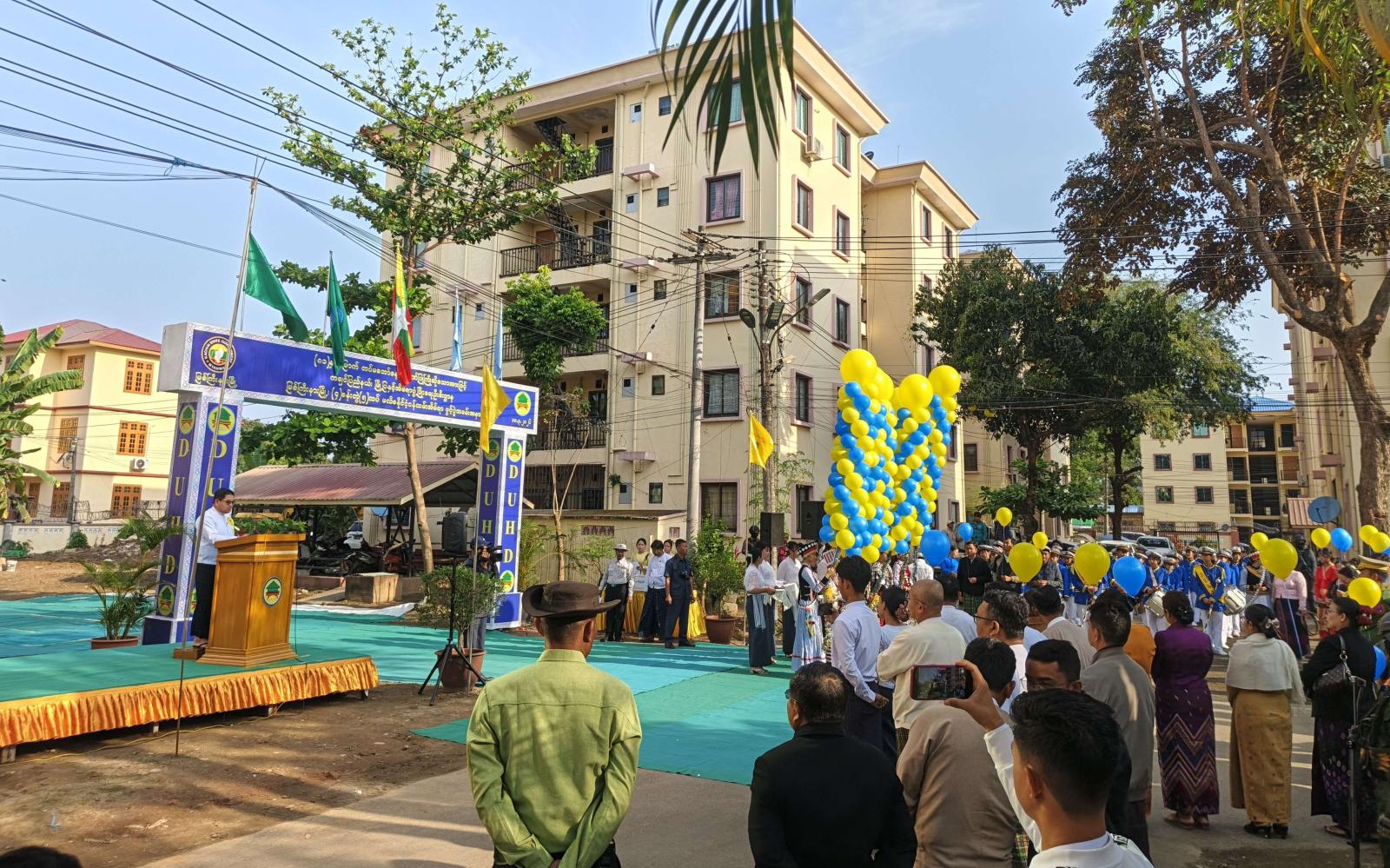ထို့နောက် အဆောက်အအုံသစ်အား ပြည်နယ်ဝန်ကြီးချုပ်၊ တိုင်းမှူး၊ ပြည်နယ်လမ်းပန်း ဆက်သွယ်ရေးရာဝန်ကြီး၊ ပြည်နယ်တိုင်းရင်းသားရေးရာဝန်ကြီးနှင့် ပြည်နယ်ဦးစီးမှူးတို့က ဖဲကြိုးဖြတ်ဖွင့်လှစ်ပေးကြပြီး (၄)ခန်းတွဲ (၅)ထပ် ဝန်ထမ်းအိမ်ရာ တိုက်အမှတ် (၂၀) အဆောက်အအုံသစ်အား ပြည်နယ်ဝန်ကြီးချုပ်က စက်ခလုတ်နှိပ် ဖွင့်လှစ်ပေးကာ အဆောက်အအုံအား အမွေးနံ့သာရည်များ ပက်ဖျန်းပေးကြပြီး အဆောက်အအုံသစ်အတွင်း ဝန်ထမ်းများနေထိုင်နိုင်ရေးအခန်းများဖြင့် ဖွဲ့စည်းတည်ဆောက်ထားရှိမှု အခြေအနေများအား လှည့်လည်ကြည့်ရှုစစ်ဆေးခဲ့ကြသည်။