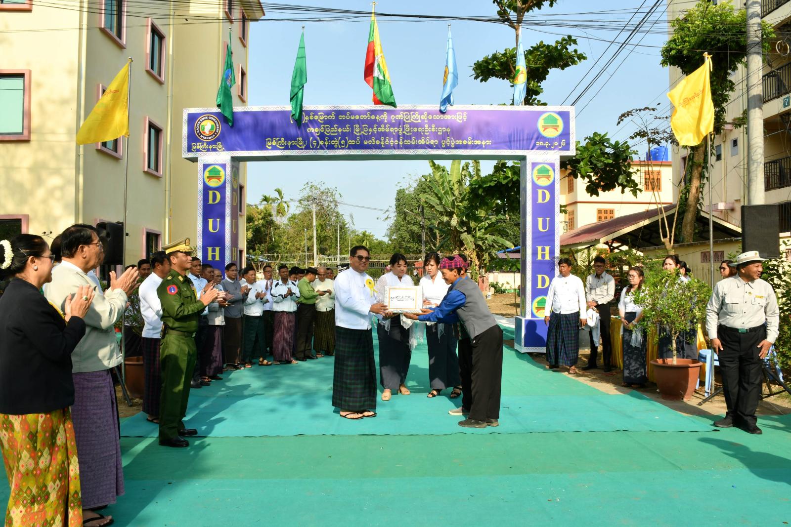 ဆက်လက်၍ ပြည်နယ်ဝန်ကြီးချုပ်နှင့် တိုင်းမှူးတို့က တက်ရောက်လာကြသည့် တာဝန်ရှိသူများနှင့် အမှတ်တရ စုပေါင်းမှတ်တမ်းတင်ဓာတ်ပုံရိုက်ကူးခဲ့ကြပြီး ပြည်နယ်ဦးစီးမှူးက အိမ်ရာဖွင့်ပွဲ အထိမ်းအမှတ်အလံတိုင်ငယ်များပေးအပ်မှုကို လက်ခံရယူခဲ့ကြကာ ဖွင့်ပွဲအခမ်းအနားတွင် ပါဝင်ကူညီဆောင်ရွက်ပေးကြသော ဘင်ခရာအဖွဲ့၊ တိုင်းရင်းသားယဉ်ကျေးမှုအဖွဲ့များအတွက် ချီးမြှင့်ငွေများကို ပေးအပ်ခဲ့ကြသည်။