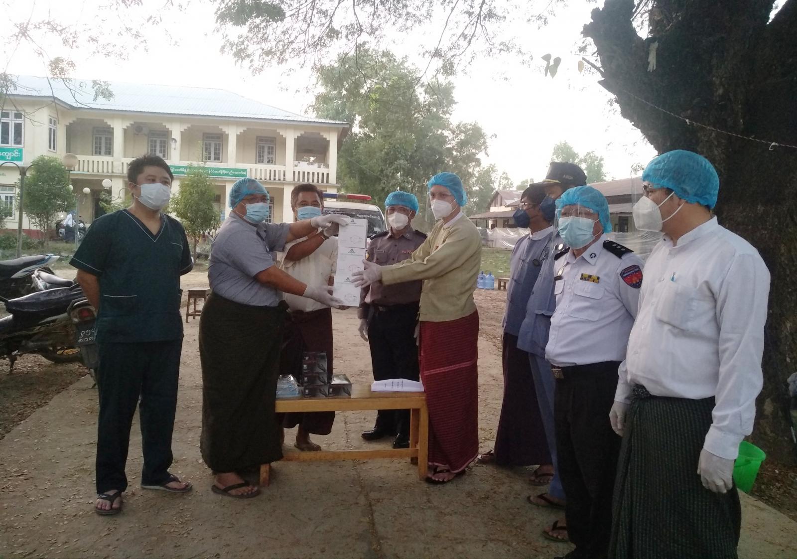အဆိုပါ ထောက်ပံ့ပေးအပ်ခြင်းကို မြို့နယ်ကိုဗစ်-၁၉ ထိန်းချုပ်ရေးနှင့်အရေးပေါ်တုံ့ပြန်ရေးကော်မတီဥက္ကဋ္ဌ ဦးရဲရင့်လှိုင်မှ ကိုဗစ်-၁၉ ရောဂါ ကာကွယ်ထိန်းချုပ်ရေးလုပ်ငန်းများဆောင်ရွက်နိုင်ရေးအတွက် Black Gloves (၄၀၀)ခု၊ မျက်နှာကာဗာ (၂၀) ခု၊N-95 mask(၂၅၀)ခု၊ စသည်တို့ကို ပေးအပ်ရာ (Community Based Facility Quaratine Centre)မှတာဝန်ရှိသူ များက လက်ခံရယူခဲ့ကြောင်းသိရသည်။
