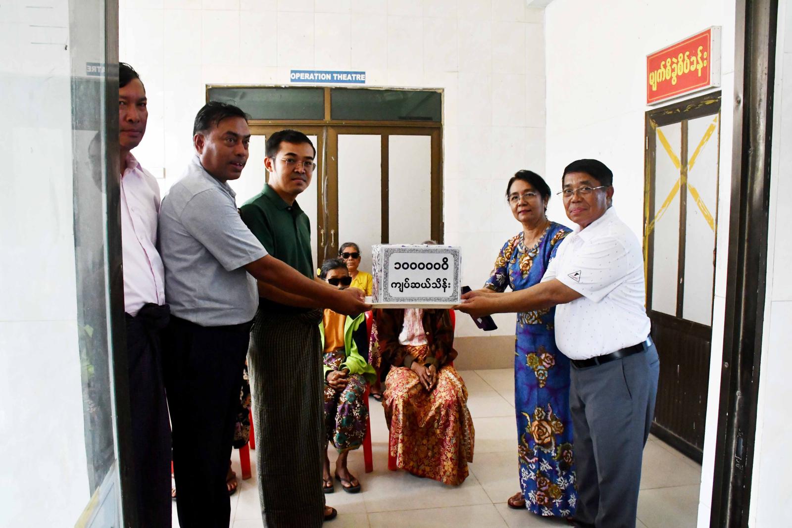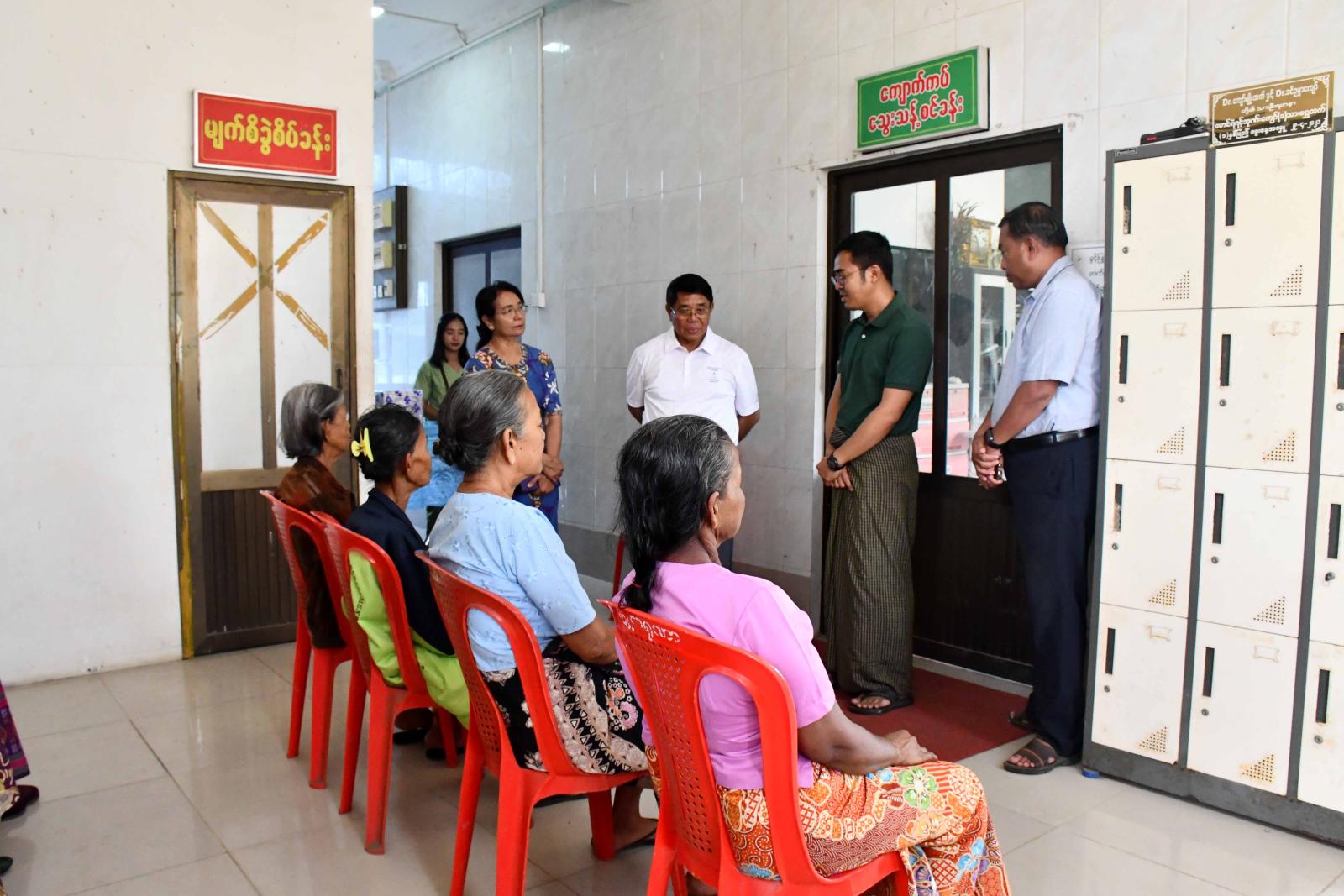 ရခိုင်ပြည်နယ်အစိုးရအဖွဲ့ဝင် ပြည်နယ်သယံဇာတရေးရာဝန်ကြီး ဦးမြင့်စိုး စစ်တွေမြို့ ရွှေကရုဏာစေတနာဆေးခန်း၌ မျက်စိဝေဒနာရှင်များအား အခမဲ့ခွဲစိတ်ကုသပေးနေမှုအား ကြည့်ရှုအားပေး