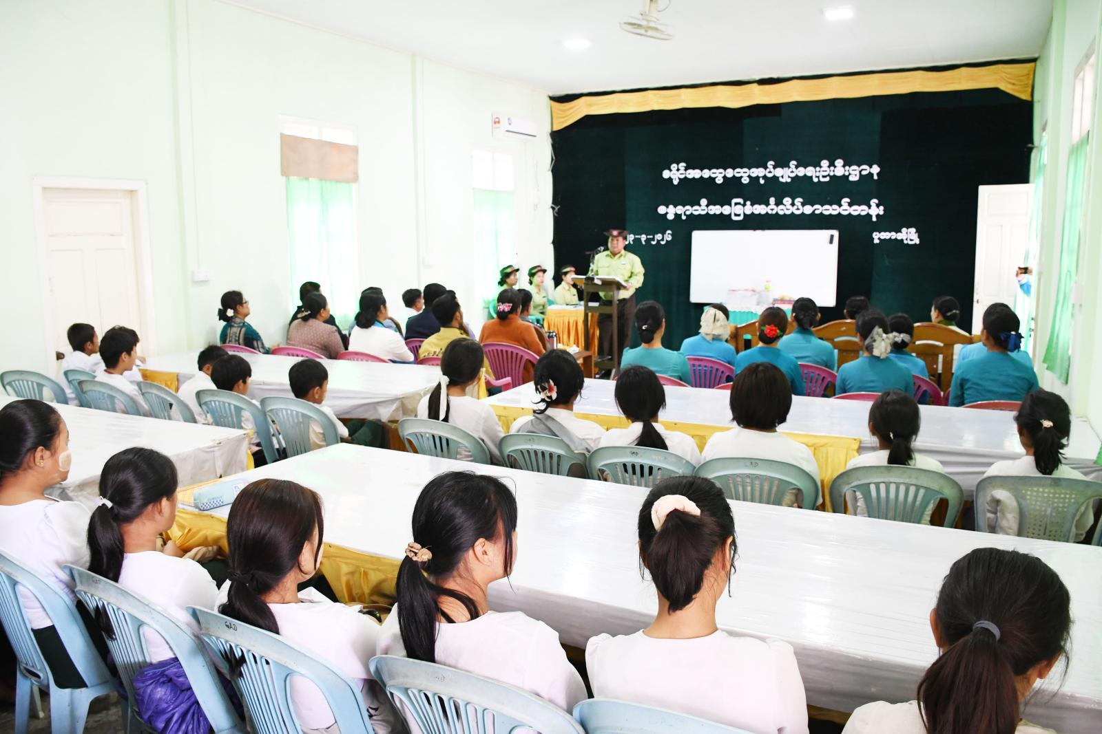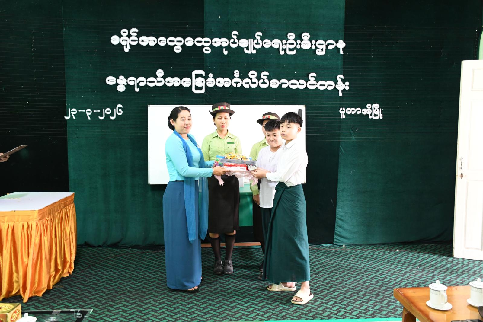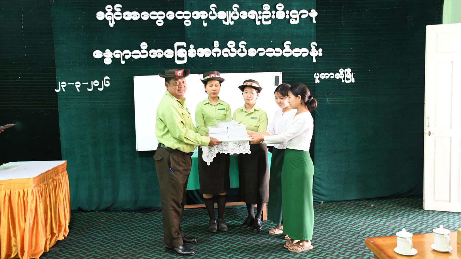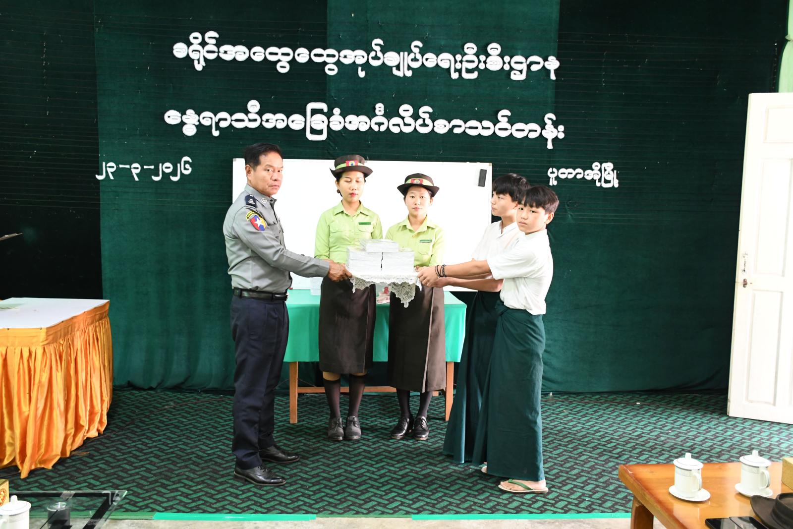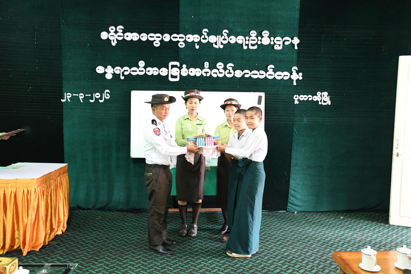 အခမ်းအနားတွင် ခရိုင်စီမံခန့်ခွဲရေးနှင့်အုပ်ချုပ်ရေးကော်မတီဥက္ကဋ္ဌ ဦးစိုးထွန်းက သင်တန်းဖွင့်လှစ်ရ ခြင်း၏ရည်ရွယ်ချက်များကိုရှင်းလင်းပြောကြားပြီး ခရိုင်စီမံခန့်ခွဲရေးနှင့်အုပ်ချုပ်ရေးကော်မတီဥက္ကဋ္ဌ ဦးစိုးထွန်းနှင့်အဖွဲ့ဝင်များ၊ မြို့နယ်စီမံခန့်ခွဲရေးနှင့်အုပ်ချုပ်ရေးကော်မတီဥက္ကဋ္ဌ ဦးကျော်ကျော်လွင်နှင့်အဖွဲ့ဝင်များ၊ ခရိုင်အထွေထွေအုပ်ချုပ်ရေးဦးစီးဌာနရုံး မိသားစု စည်းကမ်းထိန်းသိမ်းရေးကော်မတီဥက္ကဋ္ဌ ဒေါ်ဉမ္မာကိုကိုကြီး၊ ခရိုင်/မြို့နယ်အဆင့်ဌာနဆိုင်ရာများက သင်တန်းတက်ရောက်မည့် ကျောင်းသားကျောင်းသူများ အတွက် သင်ထောက်ကူပစ္စည်း ဘောလ်ဘင်၊ ပေတံ၊ ခဲတံ၊ မှင်ဖျက်ဆေး၊ ခဲချွန်စက်၊ သင်တန်းတစ်ဦးလျှင် ဗလာစာအုပ် လေးအုပ်နှုန်းဖြင့် ပေးအပ်ကြသည်။