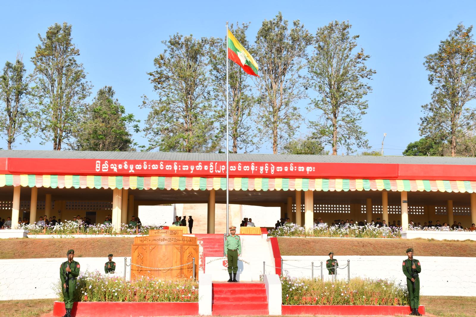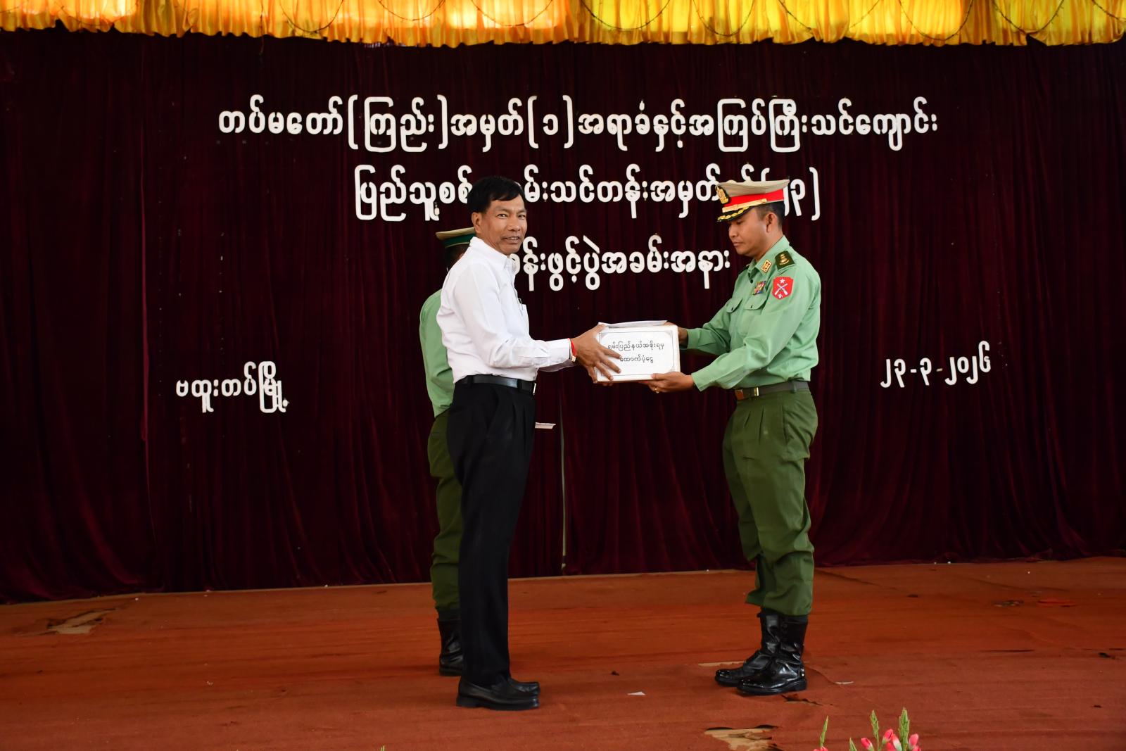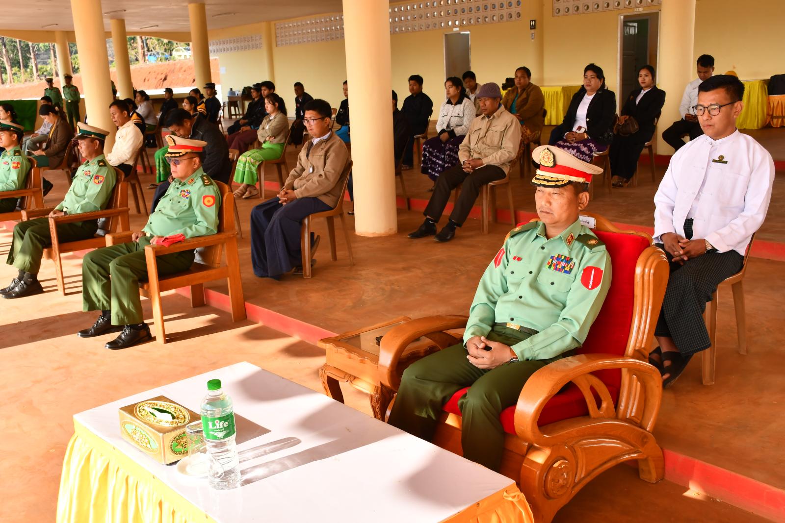 ထို့နောက် ပြည်နယ်ဝန်ကြီးနှင့်အတူ တာဝန်ရှိသူများက စားရိပ်သာခန်းမ၌ ပြည်သူ့စစ်မှုထမ်း သင်တန်းသားများအား ကြိုဆိုဂုဏ်ပြုစကားပြောကြားကာ ဂုဏ်ပြုချီးမြှင့်ငွေပေးအပ်ခဲ့ပြီး ပြည်သူ့စစ်မှုထမ်းသင်တန်းသားများနှင့် အတူတကွ လက်ဖက်ရည်သုံးဆောင်ခဲ့ကြကြောင်း သိရသည်။